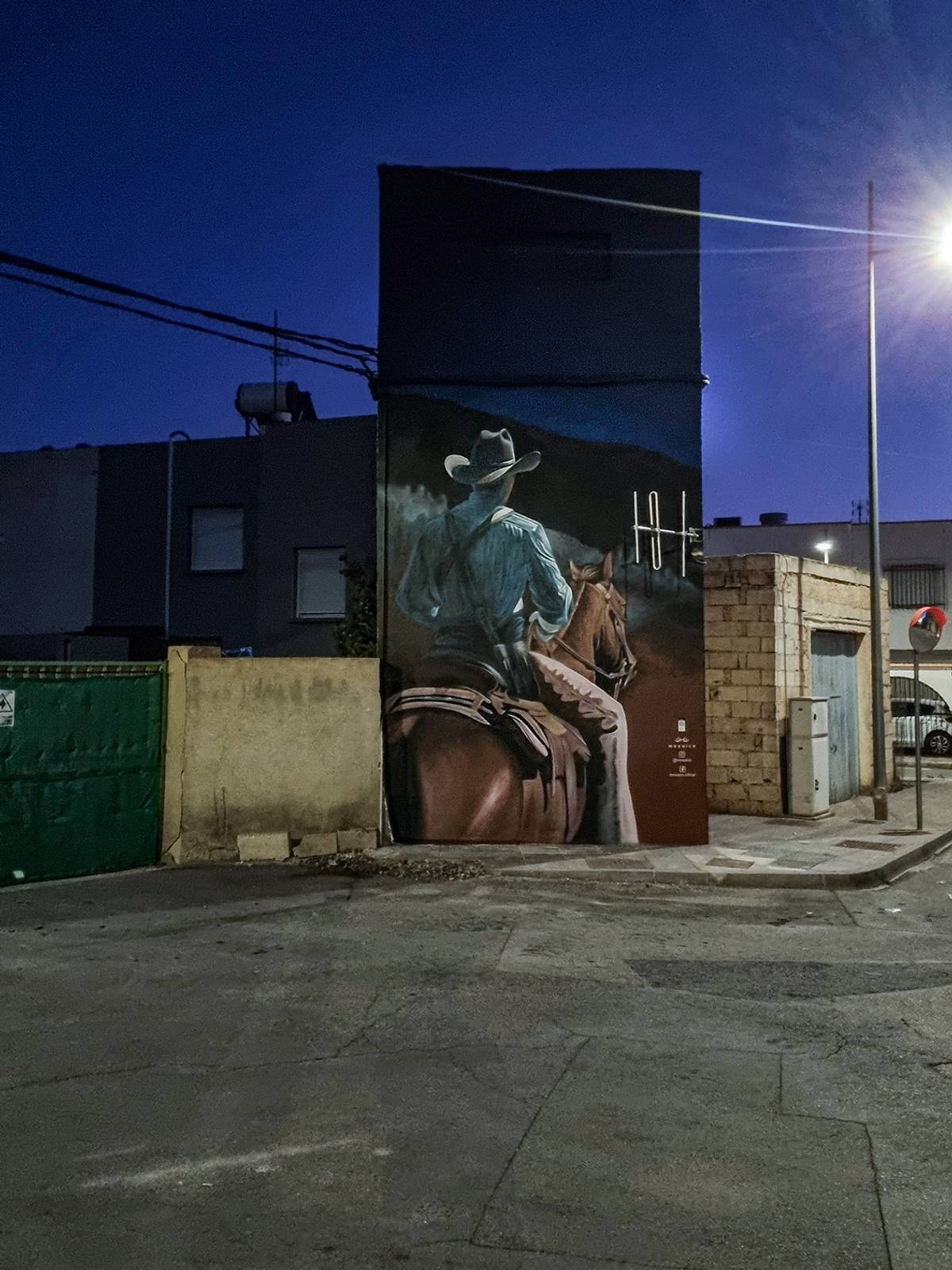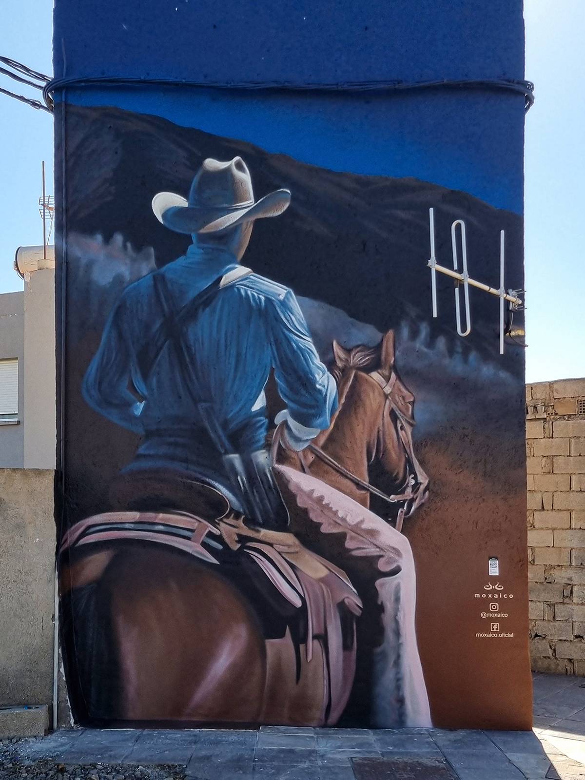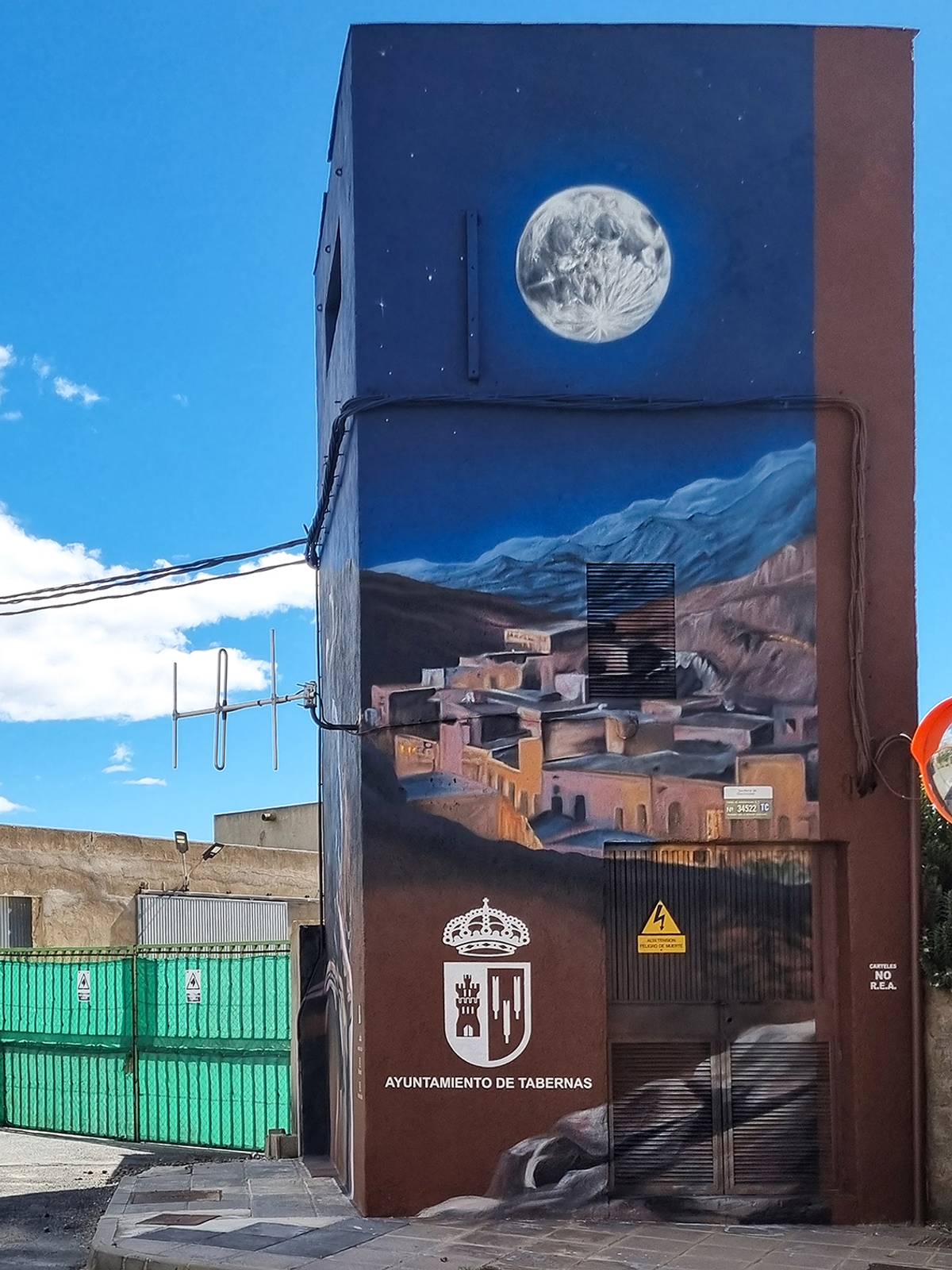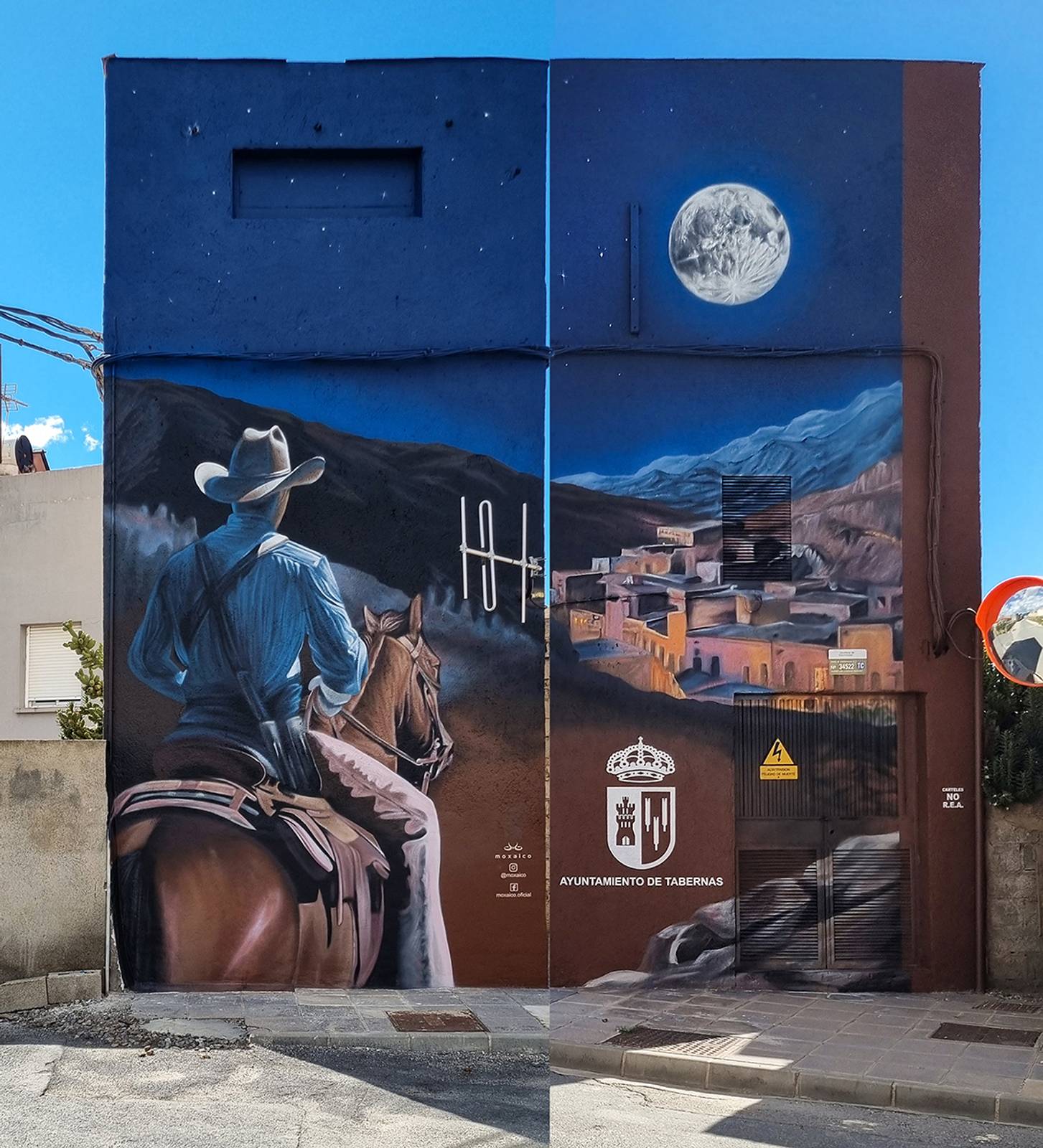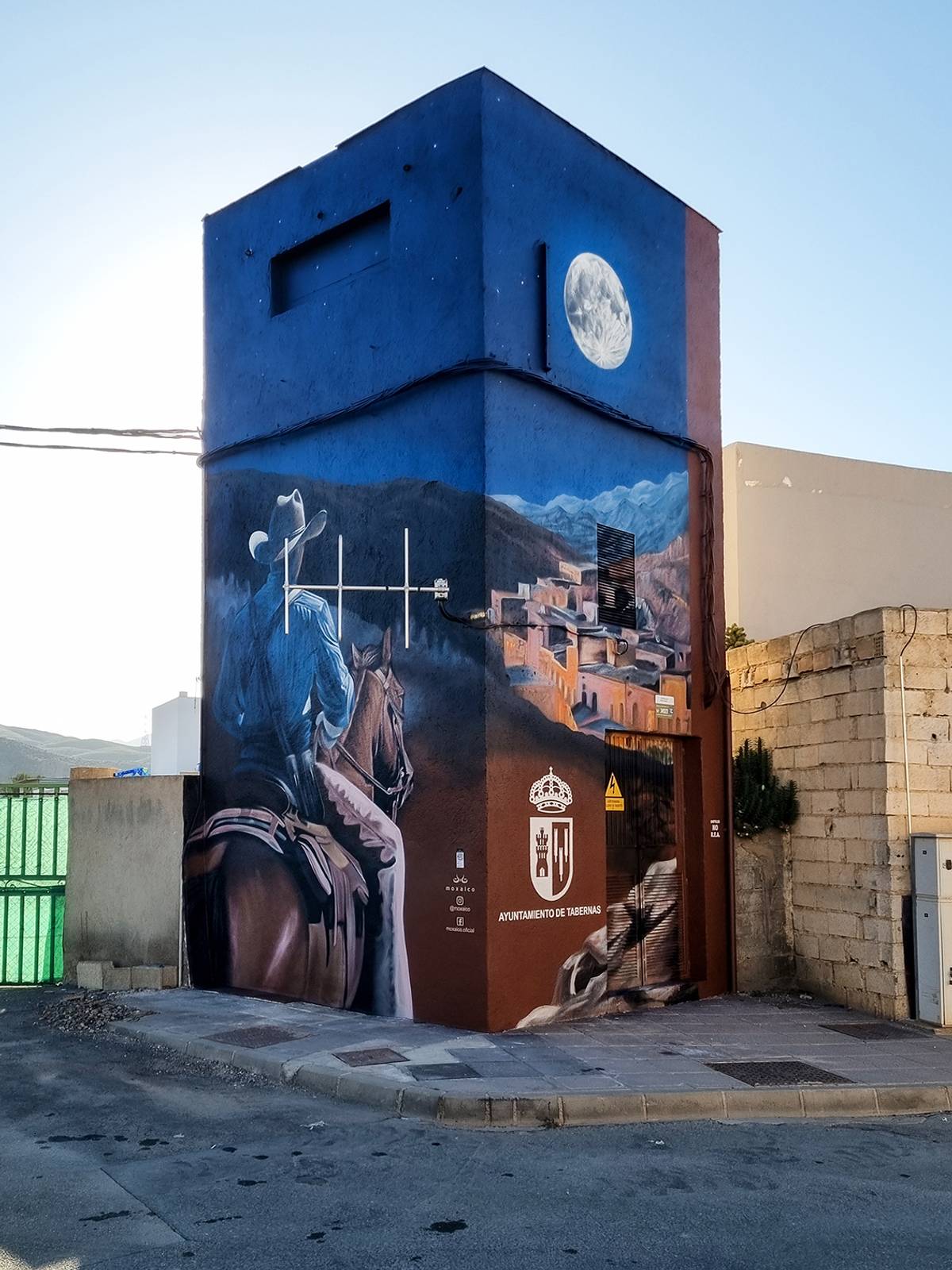Mural created for Tabernas Town Hall as part of the series of Western murals on Endesa transformer stations, reflecting the cinematic influence of the municipality and its 'Almería Western Film Festival'. The murals feature scenes reminiscent of spaghetti westerns, accompanied by the characteristic landscape of Tabernas. The murals serve a dual purpose: to give the municipality a theme and to decorate the run-down centers, creating artistic heritage and a more pleasant environment.