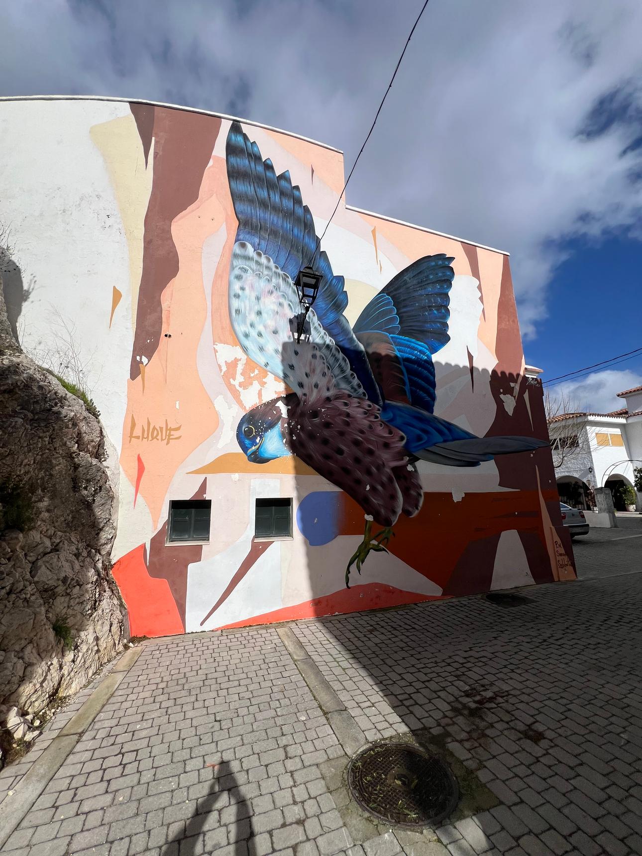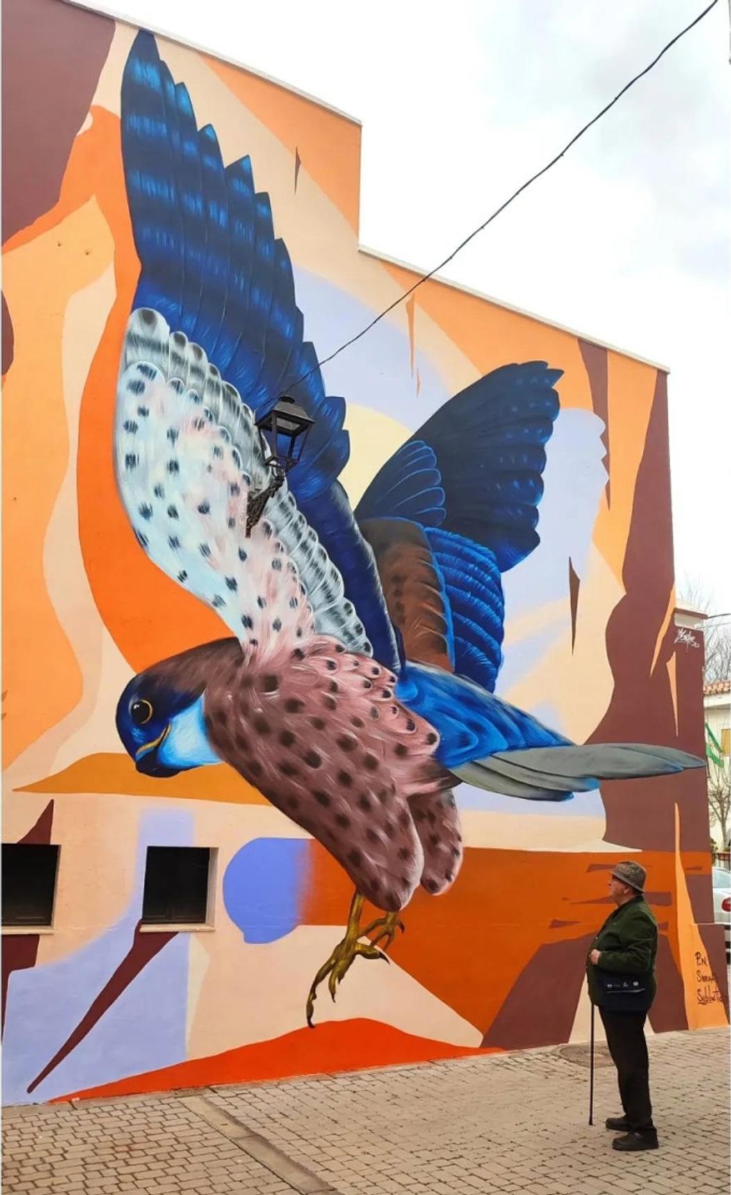 Esta imponente obra urbana, realizada por Sake Ink en 2022, representa un halcón peregrino en pleno vuelo, capturado con un realismo dinámico sobre una fachada de Luque. El halcón, ave emblemática del Parque Natural Sierras Subbéticas, se muestra con un plumaje vibrante en tonos azules, pardos y ocres, contrastando con un fondo geométrico que potencia el movimiento y la energía del vuelo.