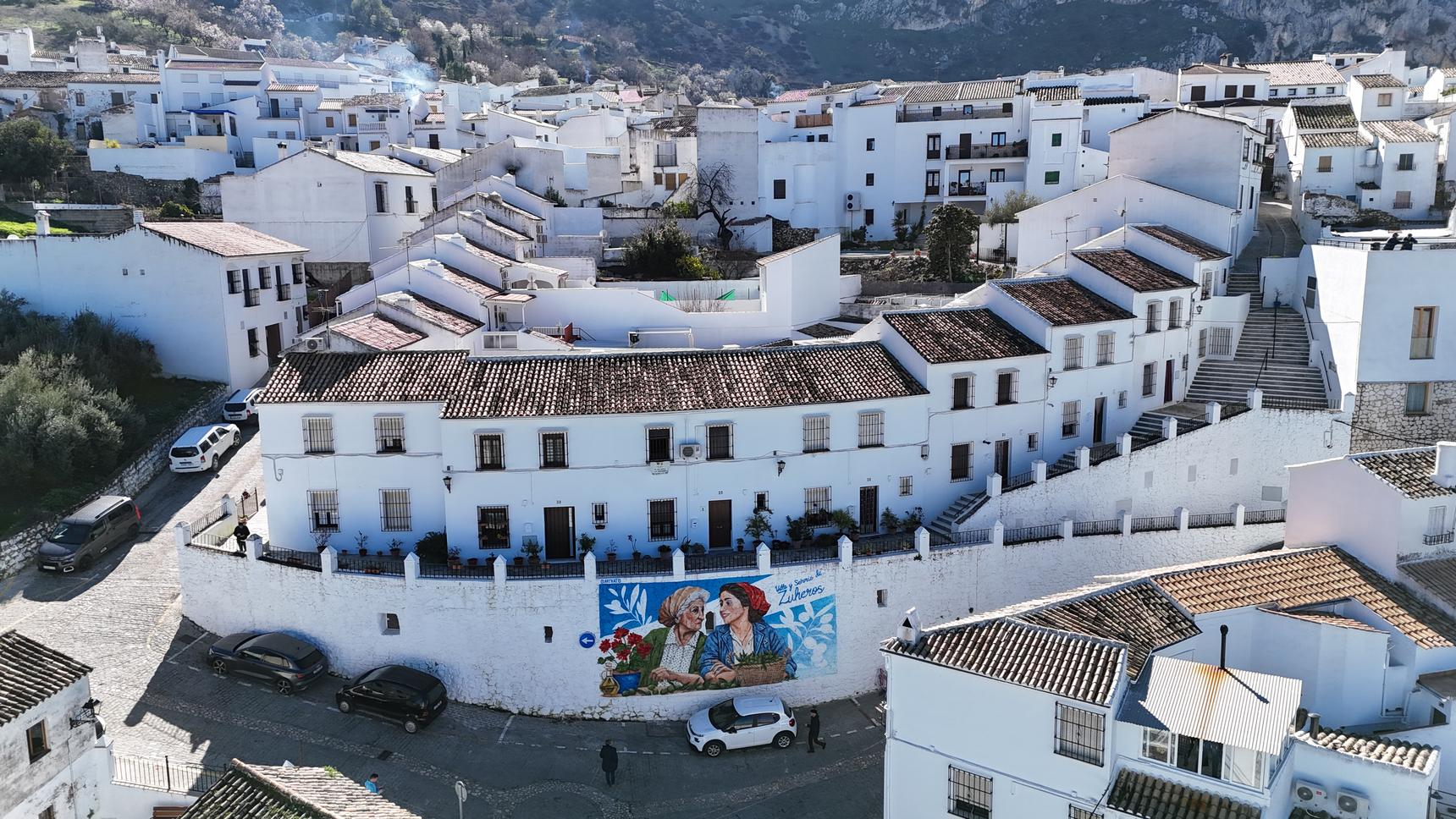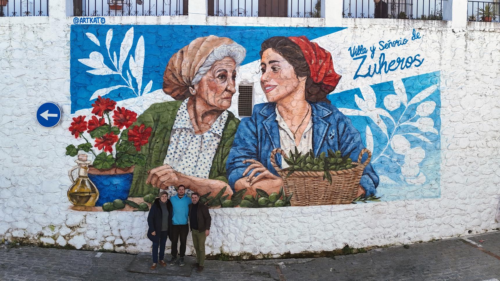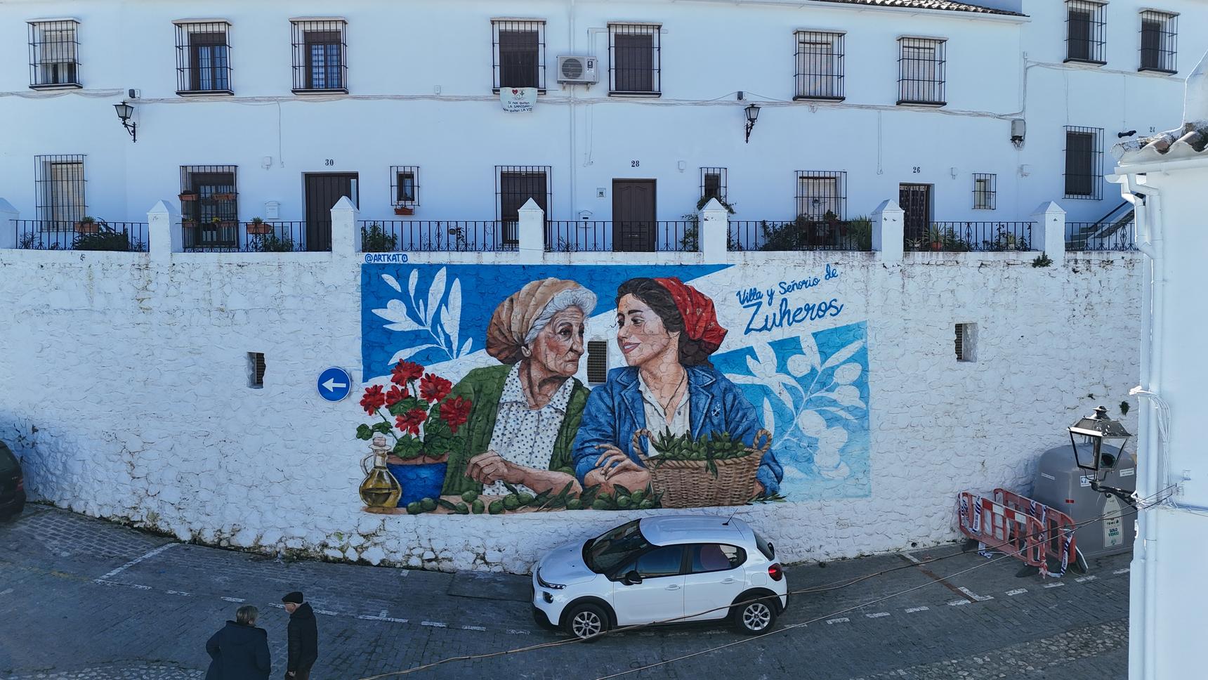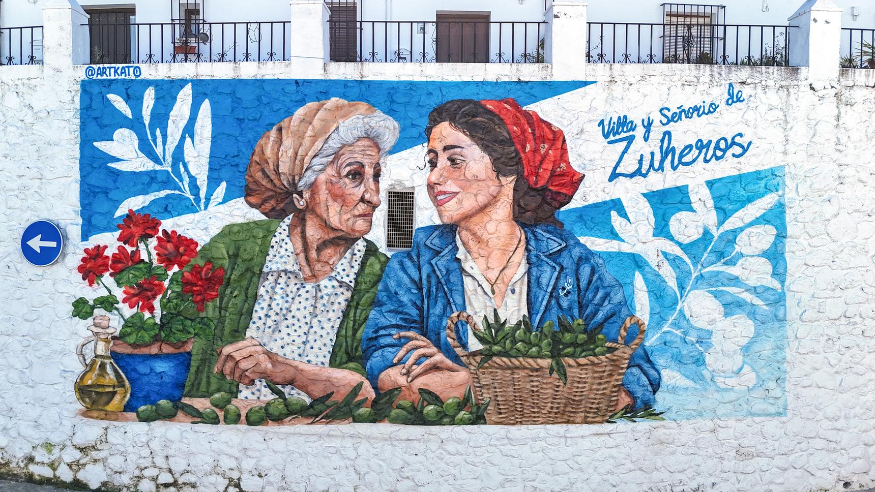 This mural pays homage to the women of Zuheros who have dedicated their lives to olive harvesting. The scene depicts a dialogue between generations: an older woman shares her experience with a younger one, symbolizing the continuity of knowledge and the value of rural work.