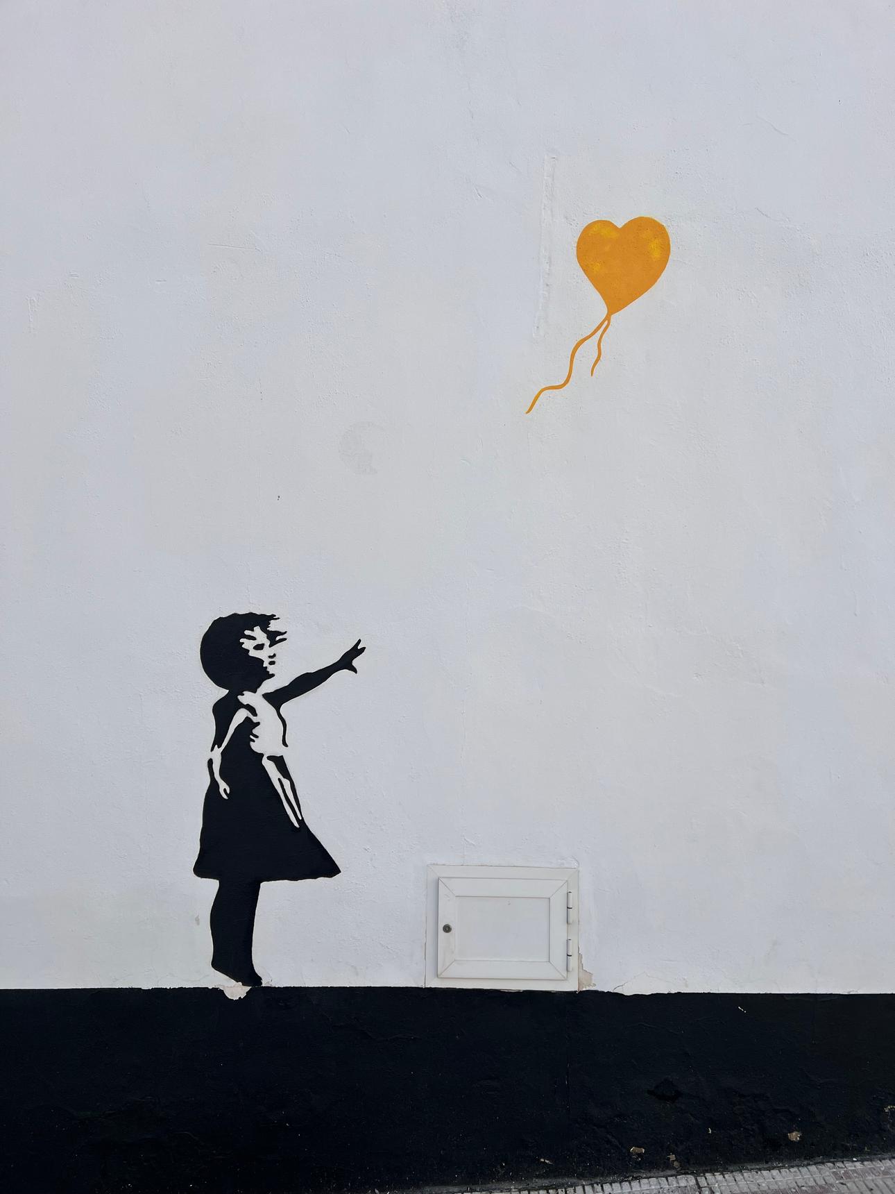 This mural features the silhouette of a girl reaching for a heart-shaped balloon, an image directly reminiscent of the iconography popularized by the street artist Banksy.