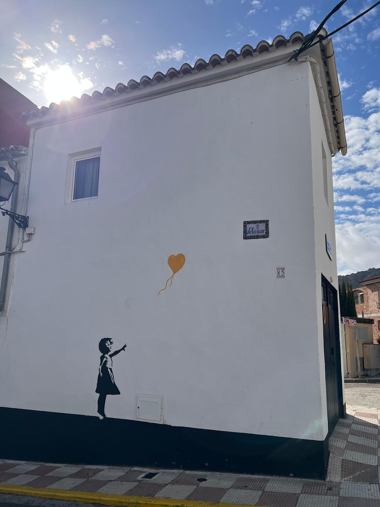 Esta intervención mural presenta una silueta de una niña estirando el brazo hacia un globo con forma de corazón, una imagen que remite de forma directa a la iconografía popularizada por el artista urbano Banksy.