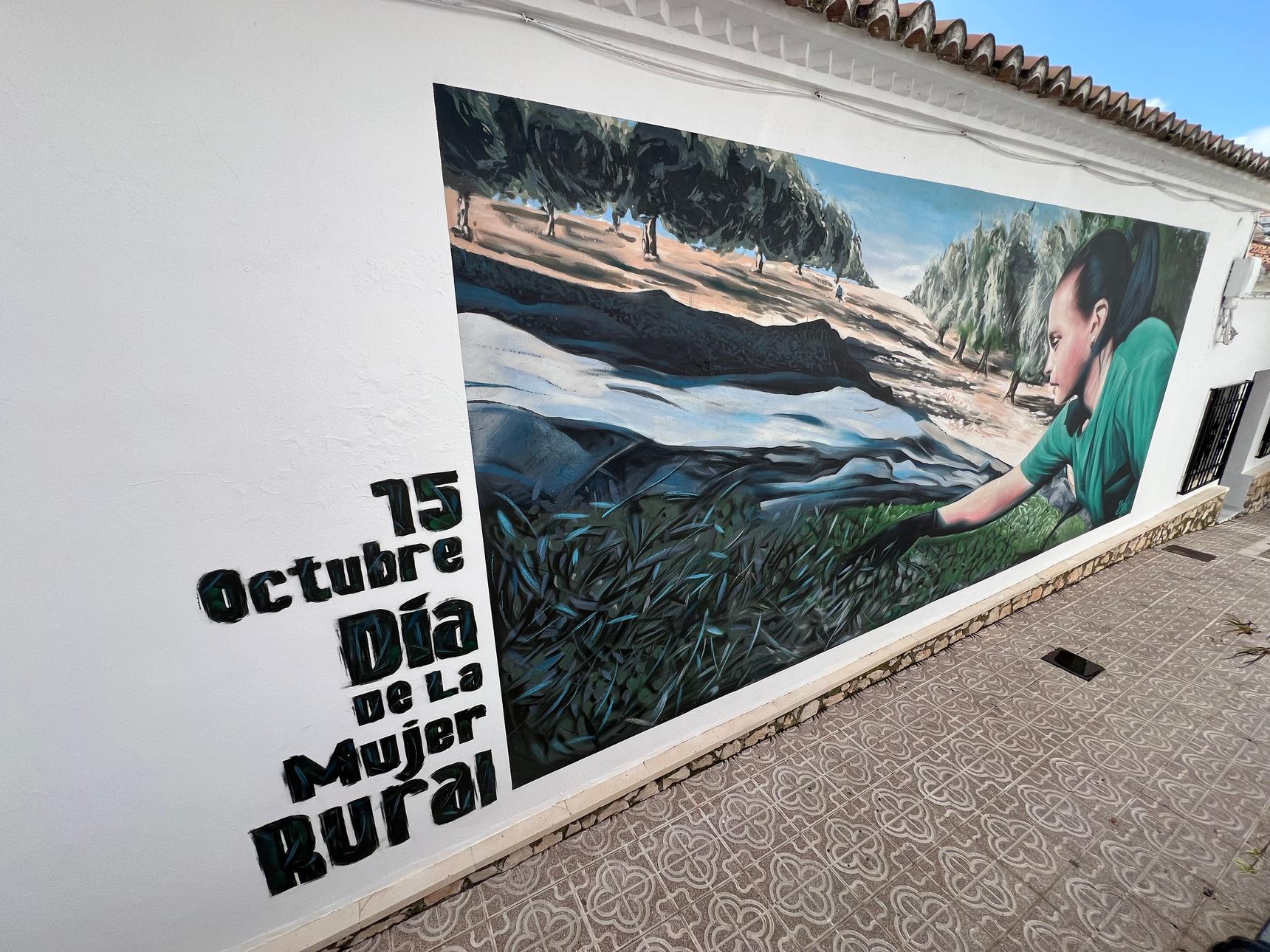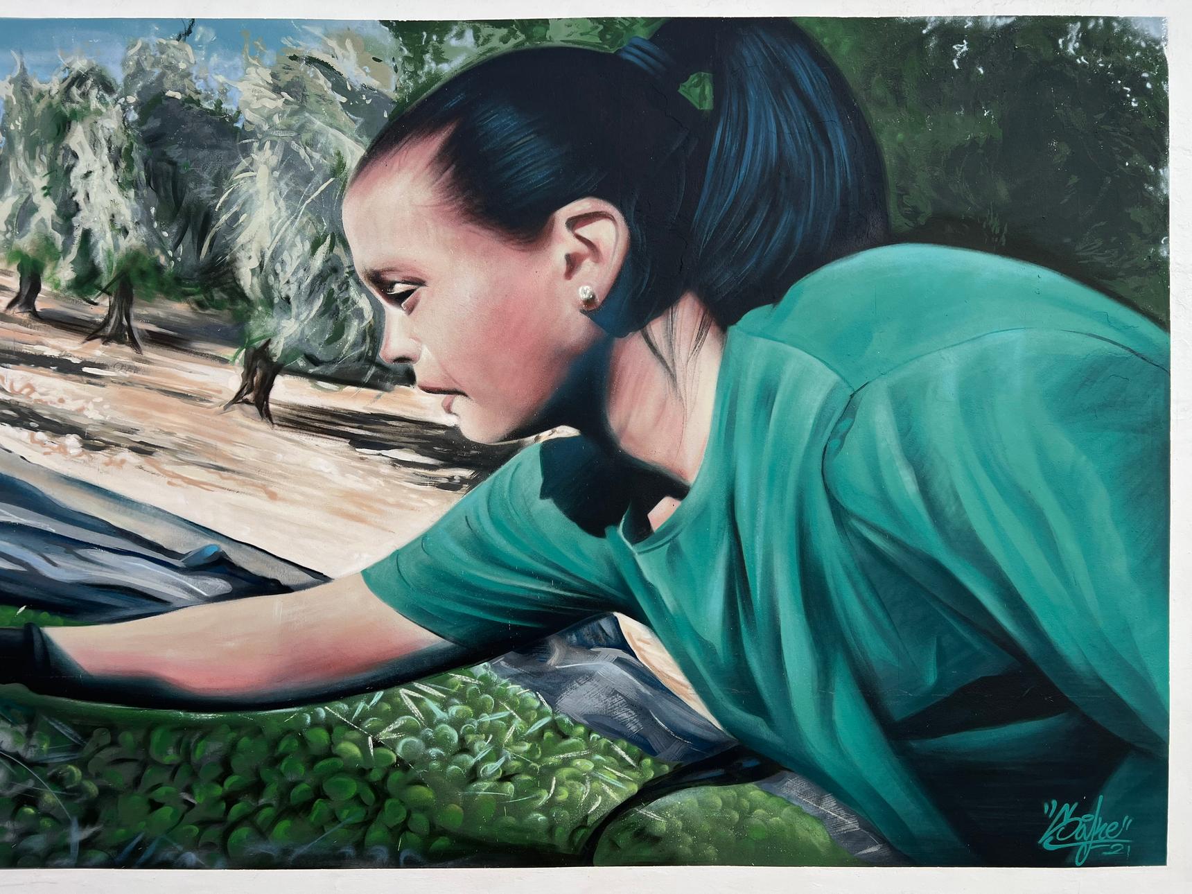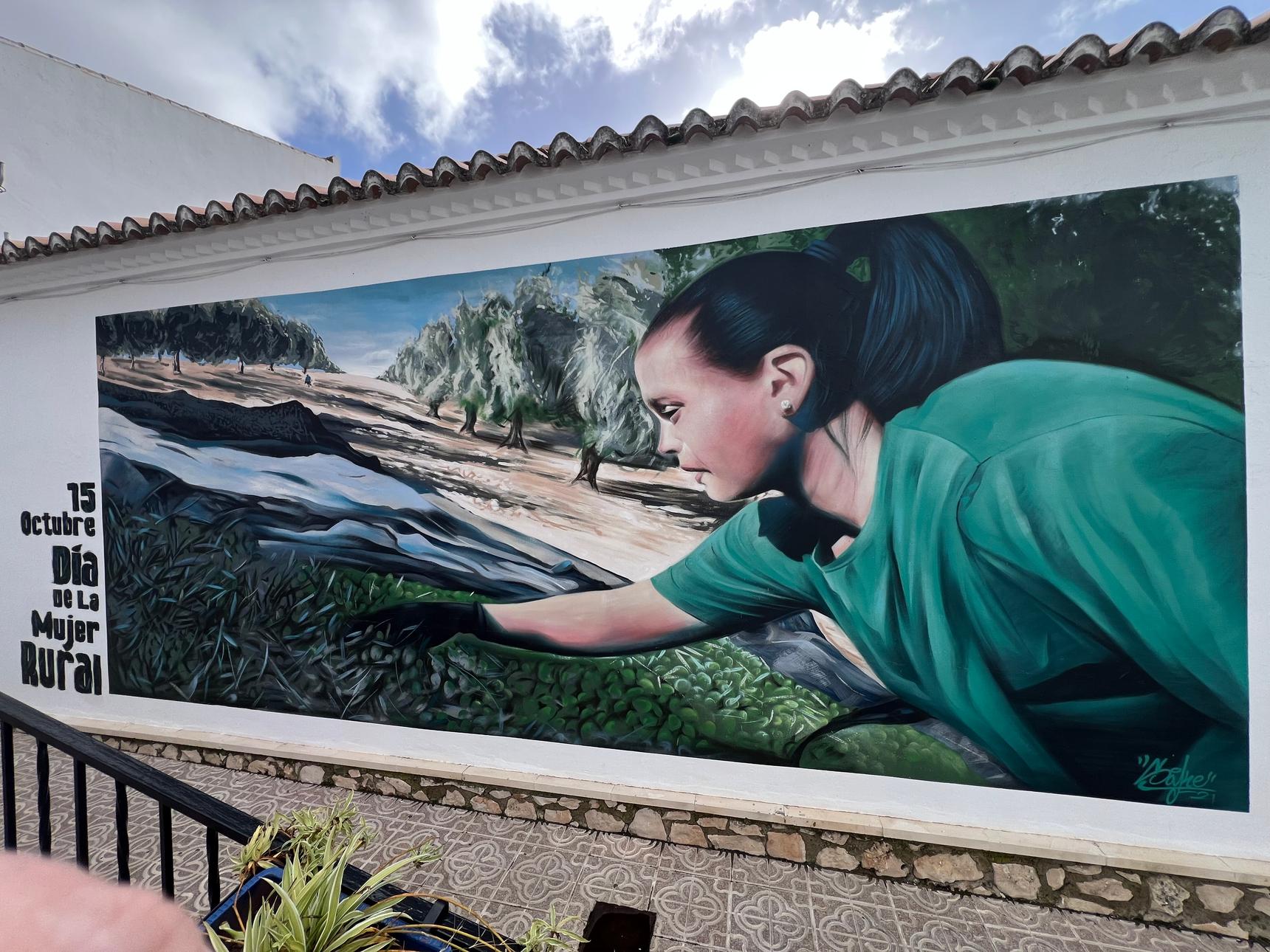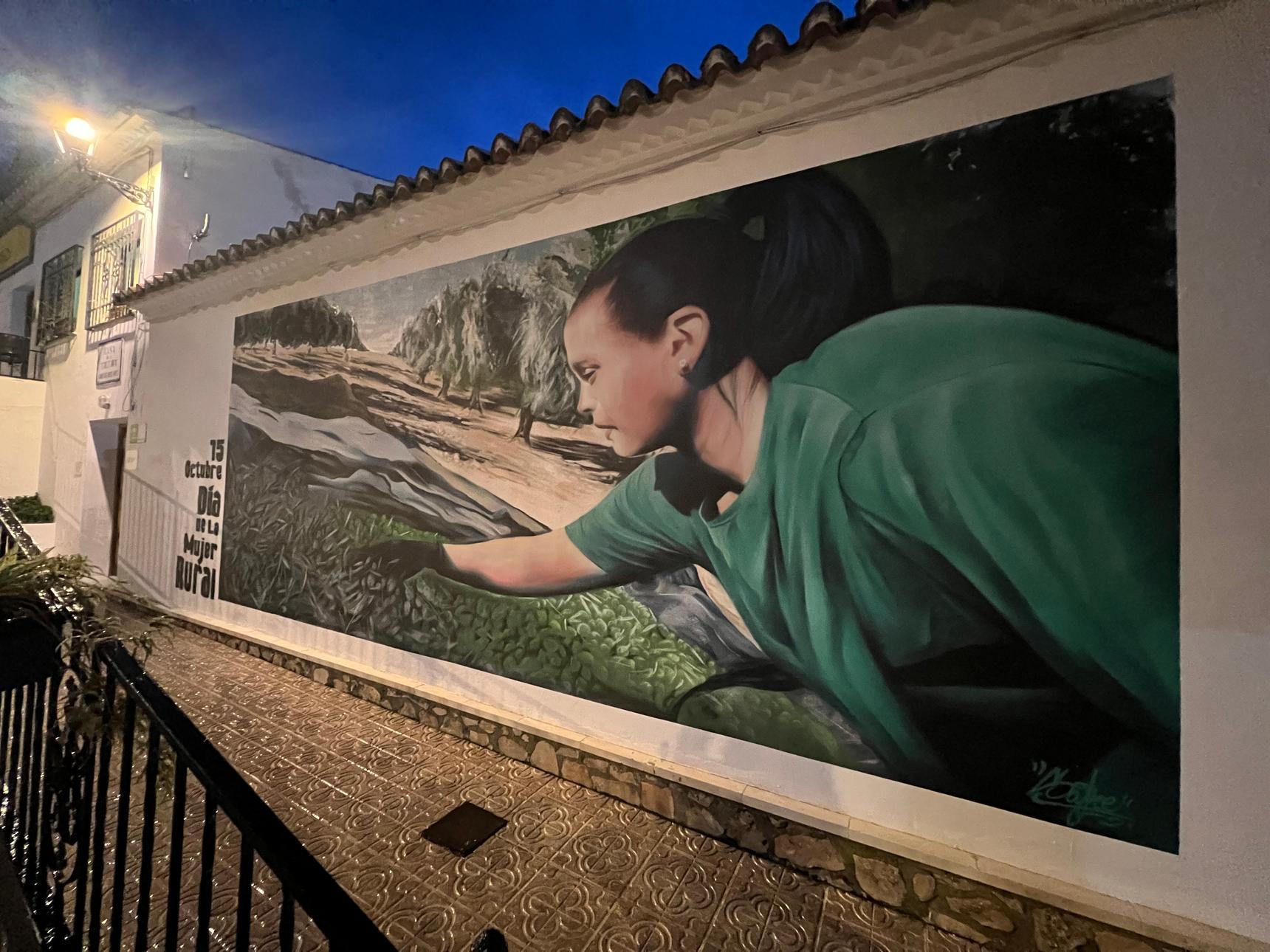With a palette of greens, earth tones, and natural hues, the mural connects deeply with the rural landscape that surrounds it, evoking the olive groves and typical agricultural activity of the Subbética region of Córdoba. More than an aesthetic representation, the work is a visual tribute to the strength, perseverance, and contribution of women in rural life, elements that form part of the identity of this Andalusian town.