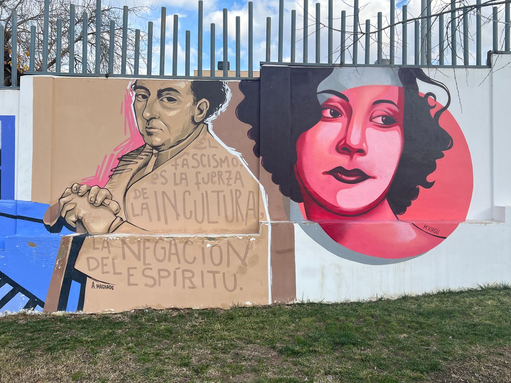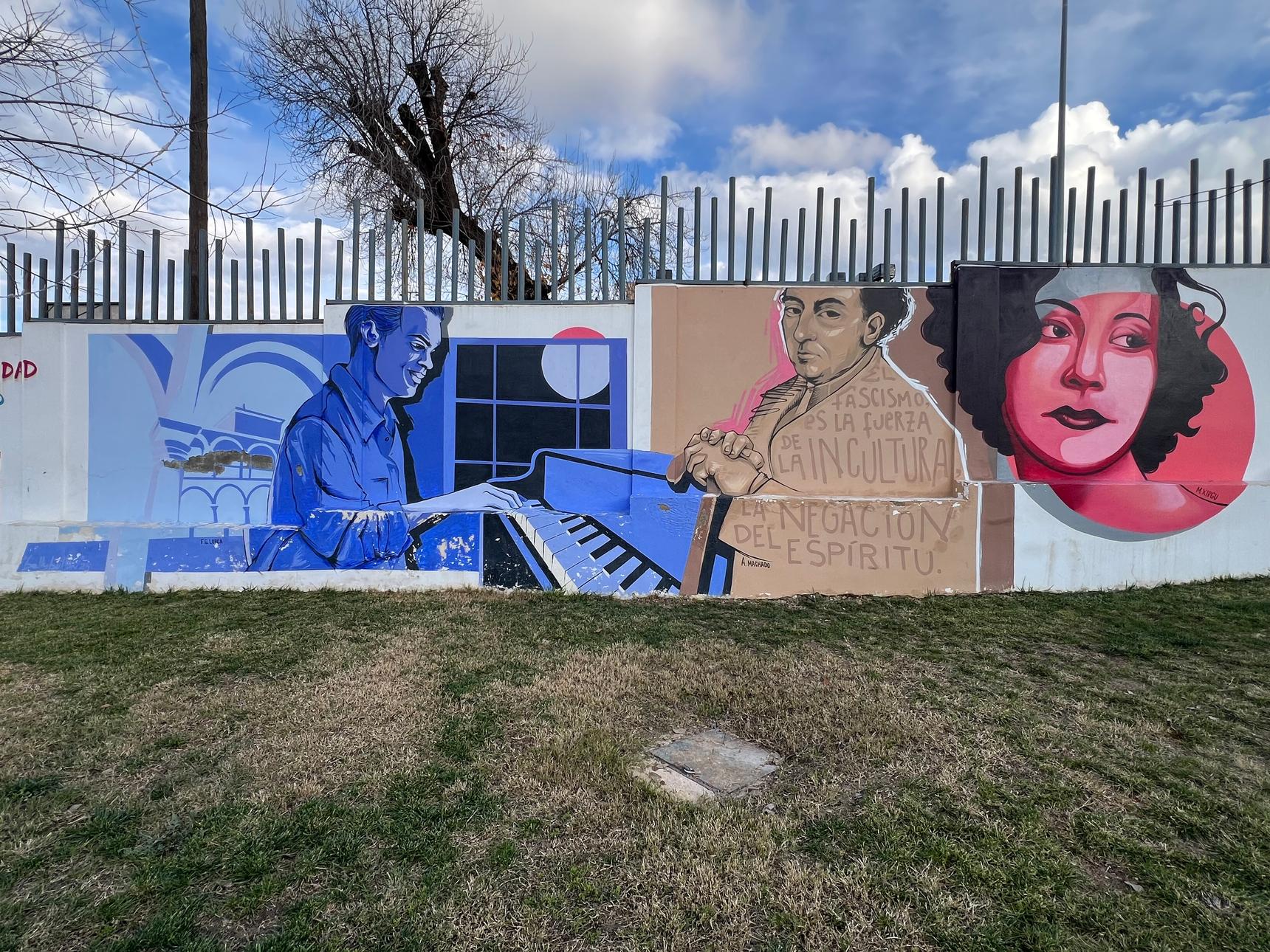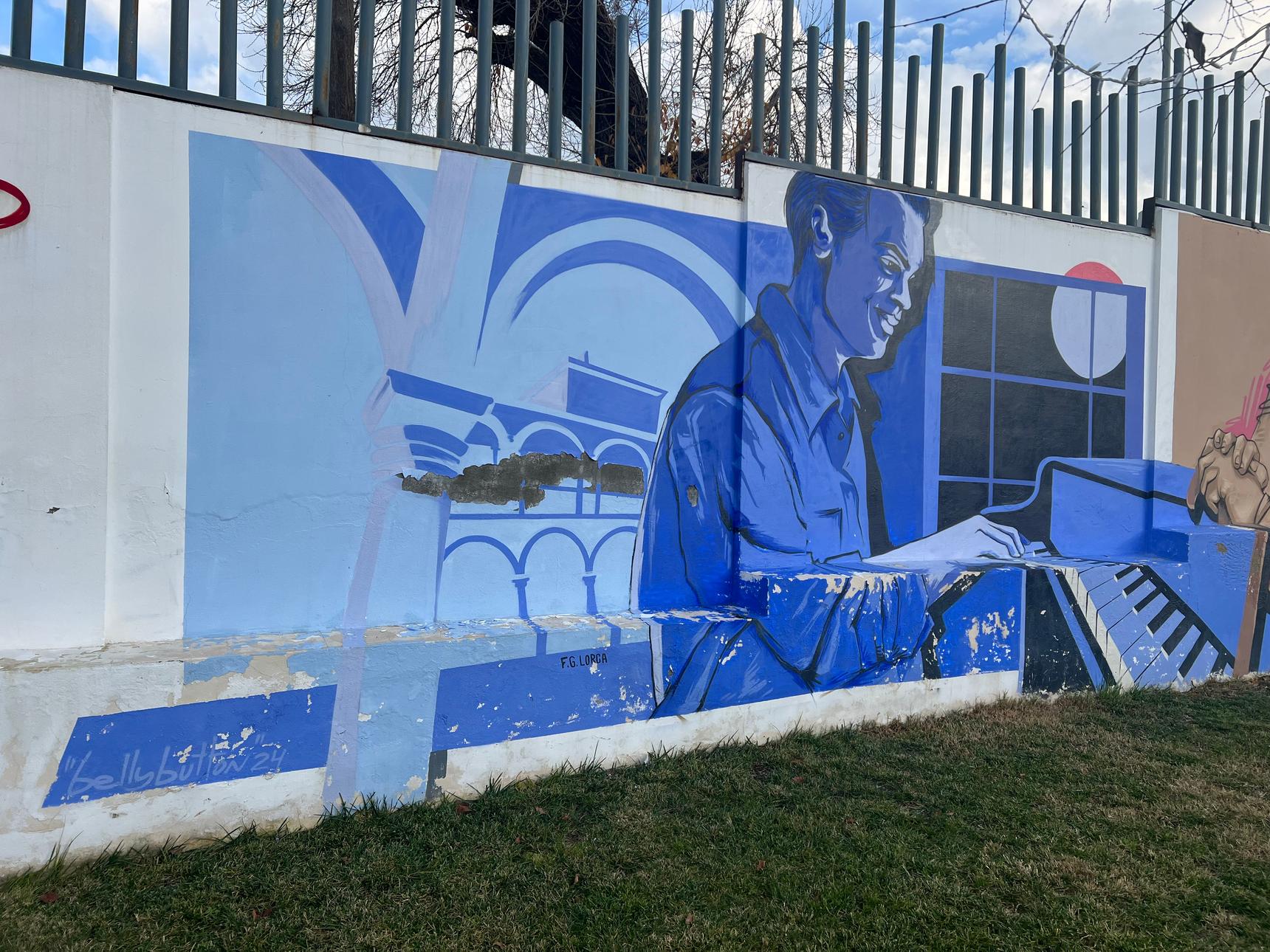 The mural pays tribute to important cultural figures such as Federico García Lorca, Antonio Machado, and Margarita Xirgu, while also incorporating references to the historic Palacio de los Marqueses de Benamejí, a once-important architectural landmark of the town.