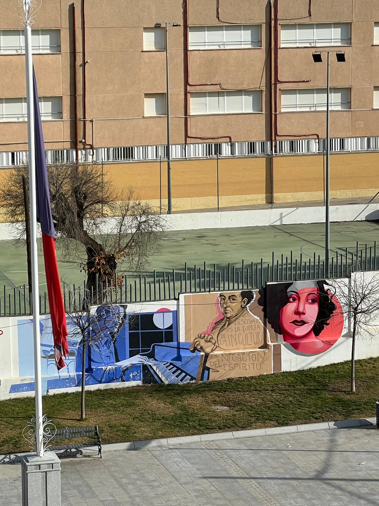 A través de imágenes y retratos, este mural rinde homenaje a figuras clave que han marcado la historia cultural y el espíritu democrático, como Federico García Lorca, Antonio Machado y Margarita Xirgu, integrando también elementos arquitectónicos del antiguo Palacio de los Marqueses de Benamejí, desaparecido en 1973 y recordado por su legado histórico.