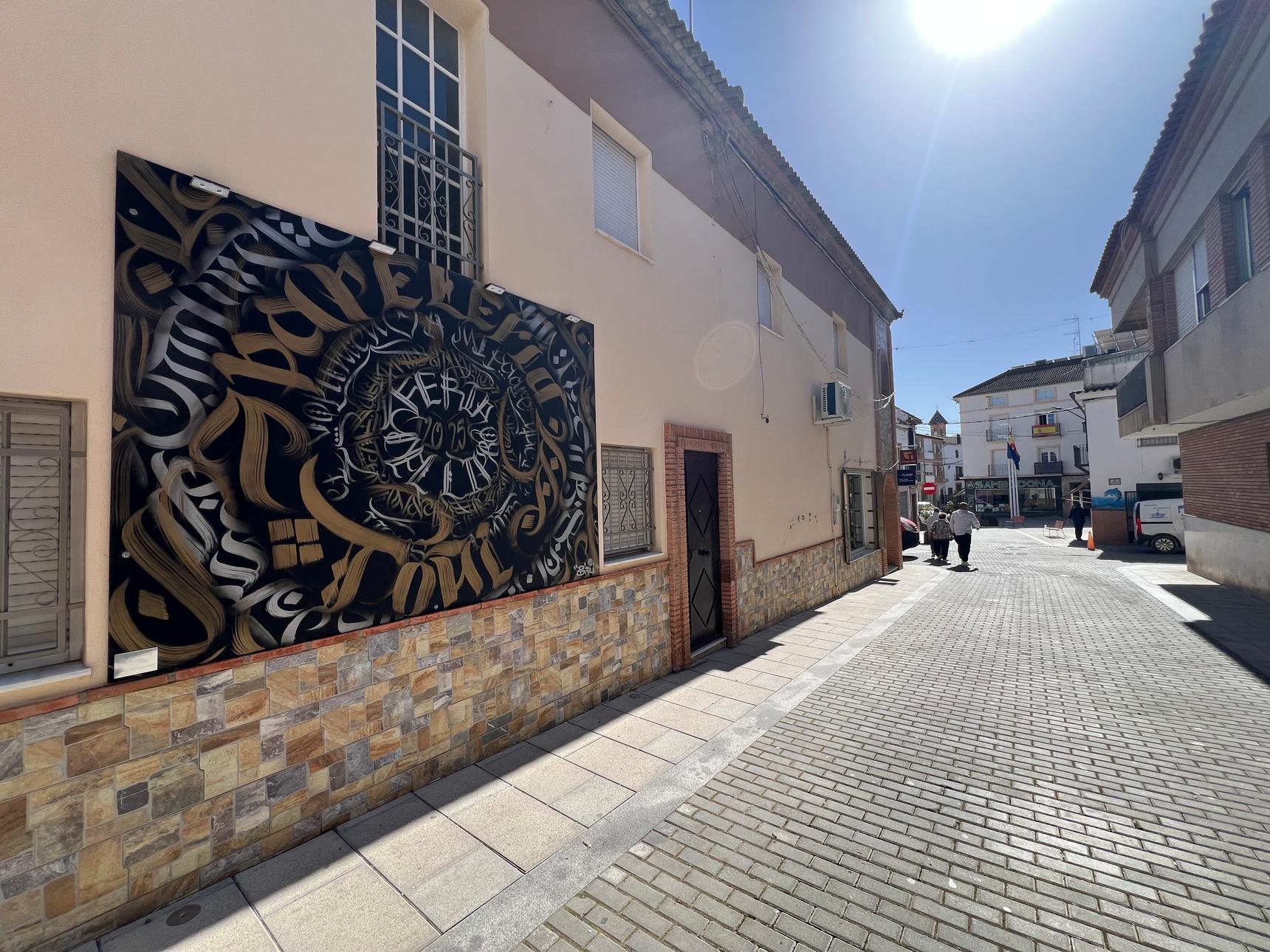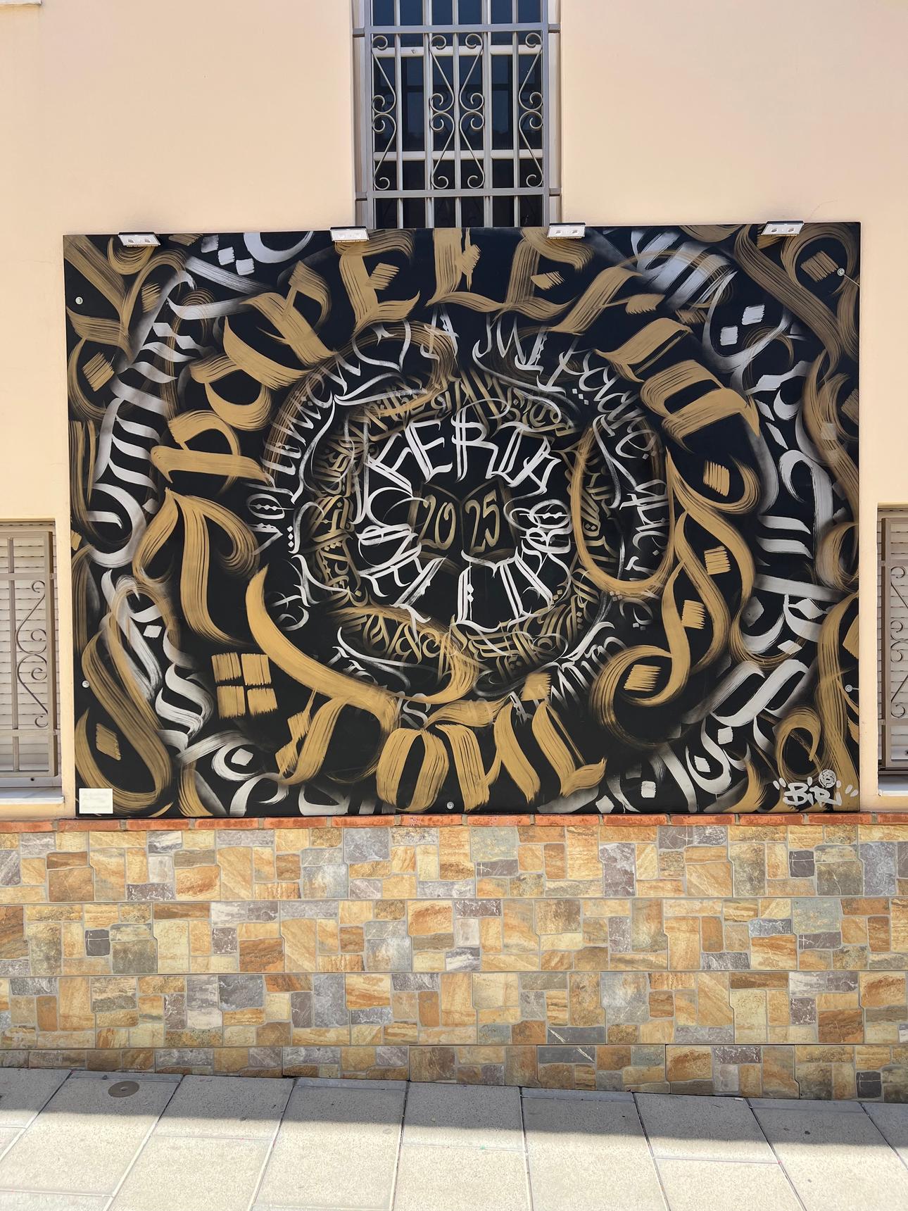 Mural realizado por el artista Biri 365 Painting en estilo “caligraffiti” para la Papelería Toñi en la Feria del Libro del 2025.