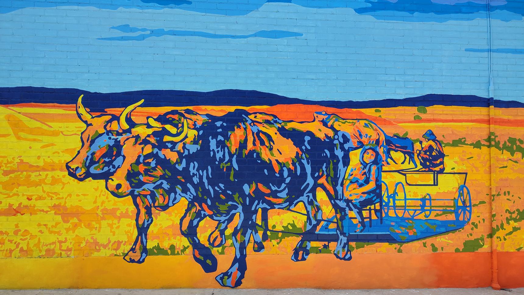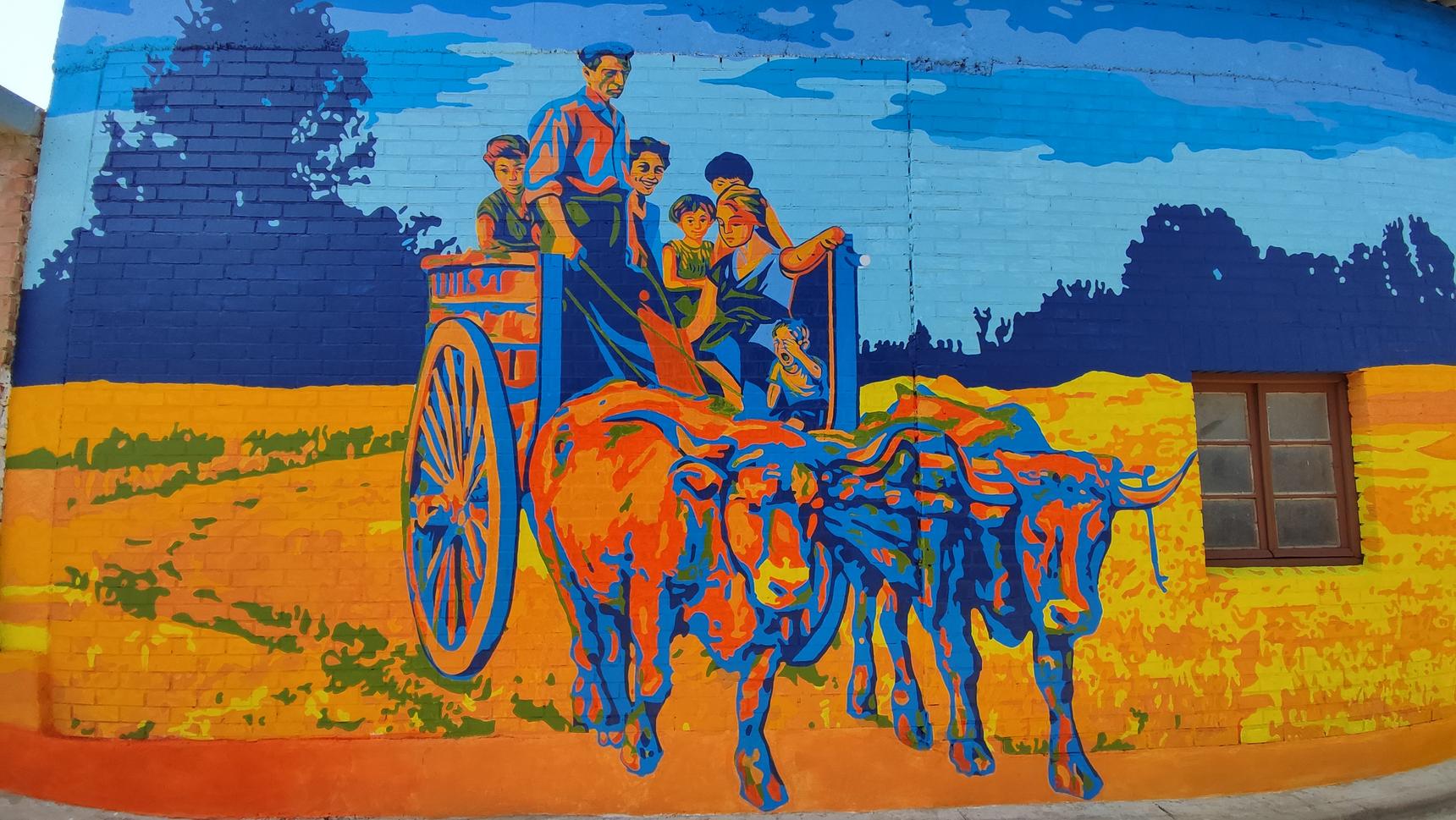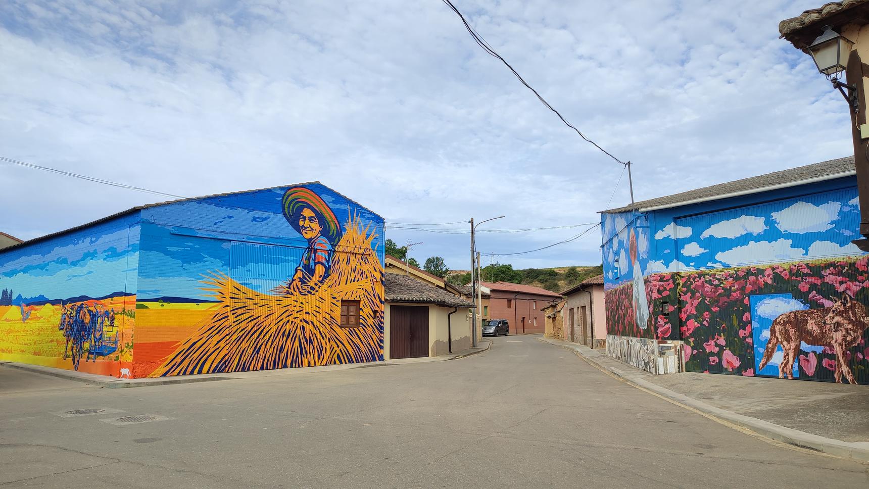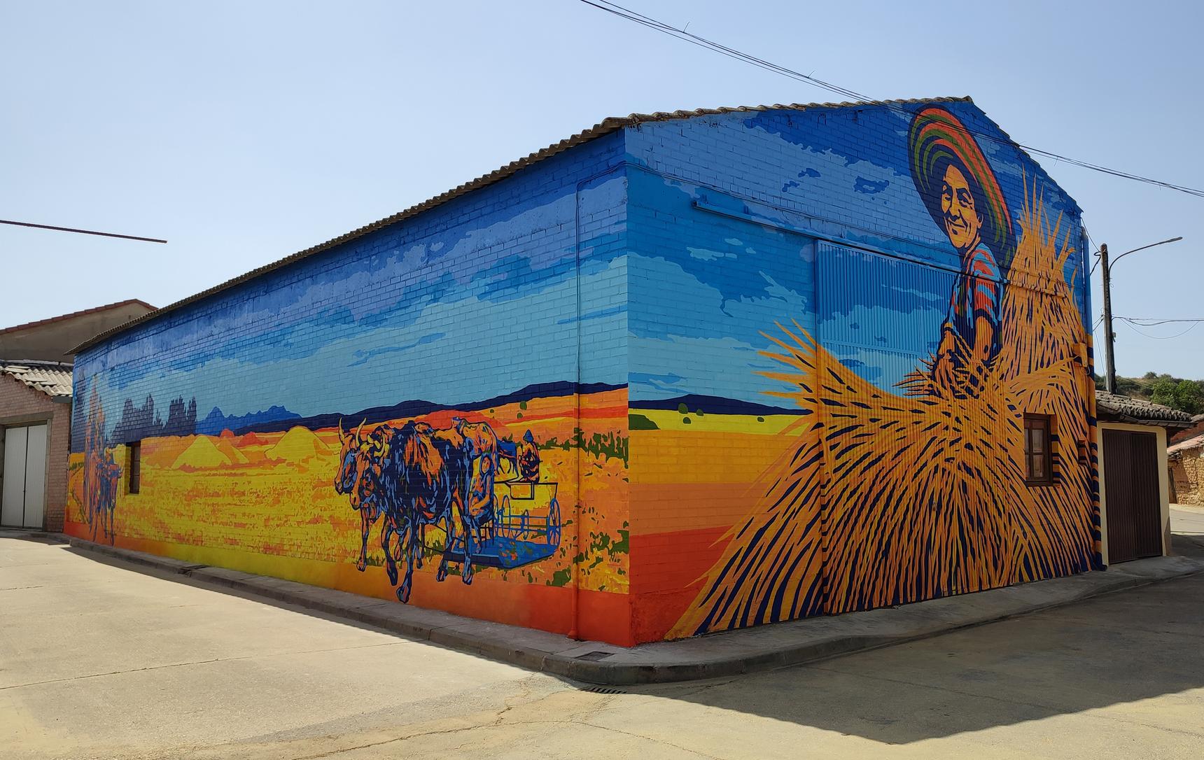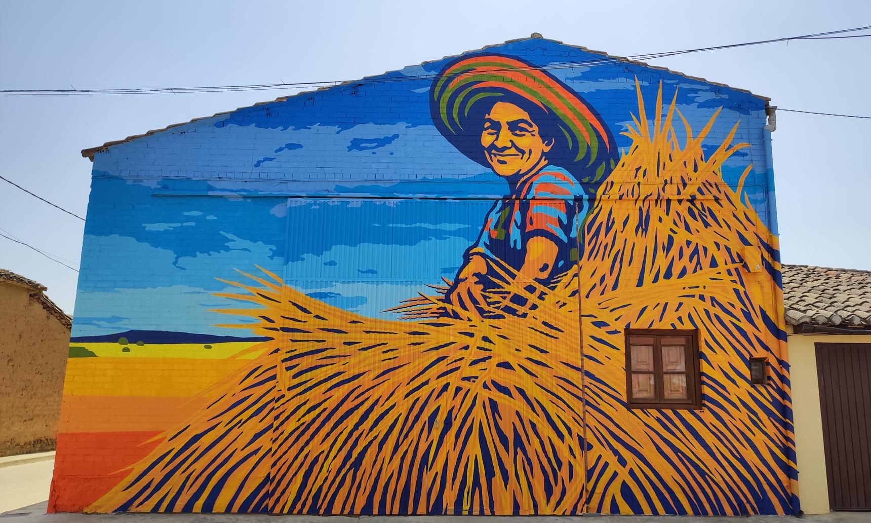 A mural created in the town square of Polvorosa de Valdavia, with the participation of over seventy volunteers, focuses on agricultural work, the historical and economic foundation of our town, and pays tribute to the role of women as an essential pillar of the countryside, the community, and collective progress. Thanks to their efforts, it has been possible to support families, keep agricultural work alive, and ultimately, drive the life of our villages. The project was subsidized by the Palencia Provincial Council through the "A HUEBRA 2025" environmental volunteer program and was the winning project of the "MY TOWN IS THE BEST" award from the Diario Palentino newspaper.