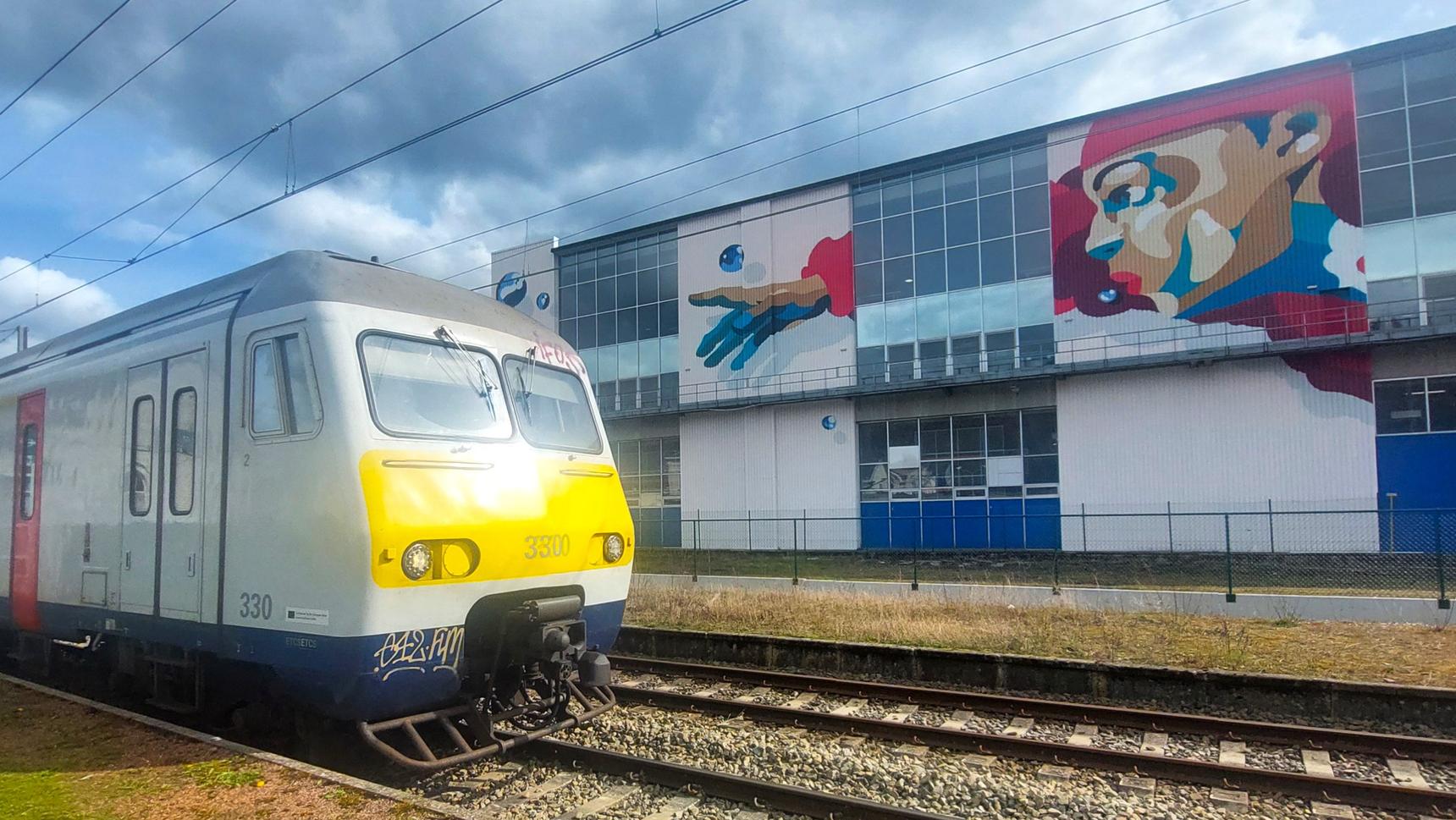 Je kan de muurschildering het best bewonderen vanaf de tegenovergelegen parking aan het treinstation van Spa.