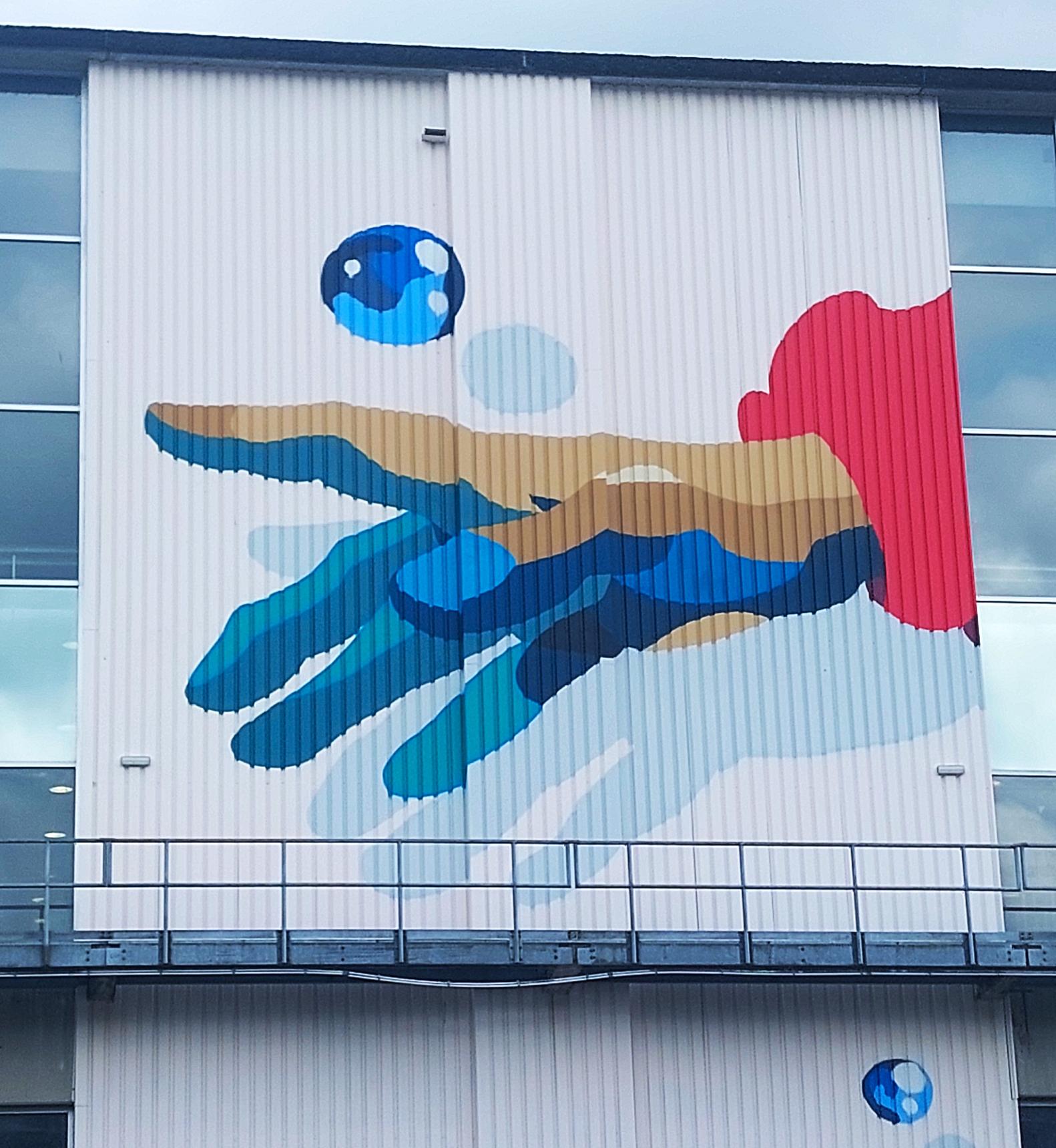 Pablo Sozyone Gonzalez, qui travaille sous le nom d'artiste SozyOne, a créé un Pierrot géant qui s'étend sur toute la largeur de la façade et tend le bras telle une sorte de super-héros, tandis que des bulles d'eau apparaissent autour de lui.