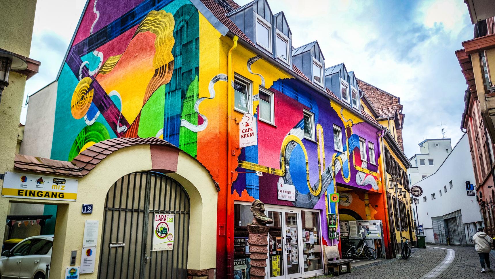 The Aschaffenburg street artist and operator of the URBAN ART agency, Engin Dogan, has realized his color-wheel concept on a publicly visible wall here. It also serves as a reference to additional street art works located in the building’s backyard.