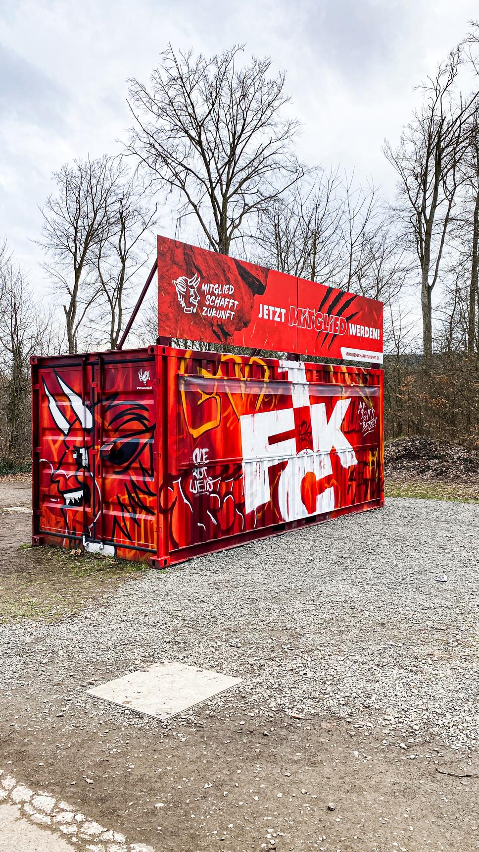 The dominating colours are red and white, the traditional colours of the club. Spreaded across the container are the logo of the 1. FCK and words like ‚Betze‘ (abbreviation for ‚Betzenberg‘, where the stadium is built) and the number ‚1900’ (the year the club was founded). The eye-catcher is the Head of ‚Betzi’, the mascot of the 1. FC Kaiserslautern: a grinning red devil. Fans and players also call themselves red devils.