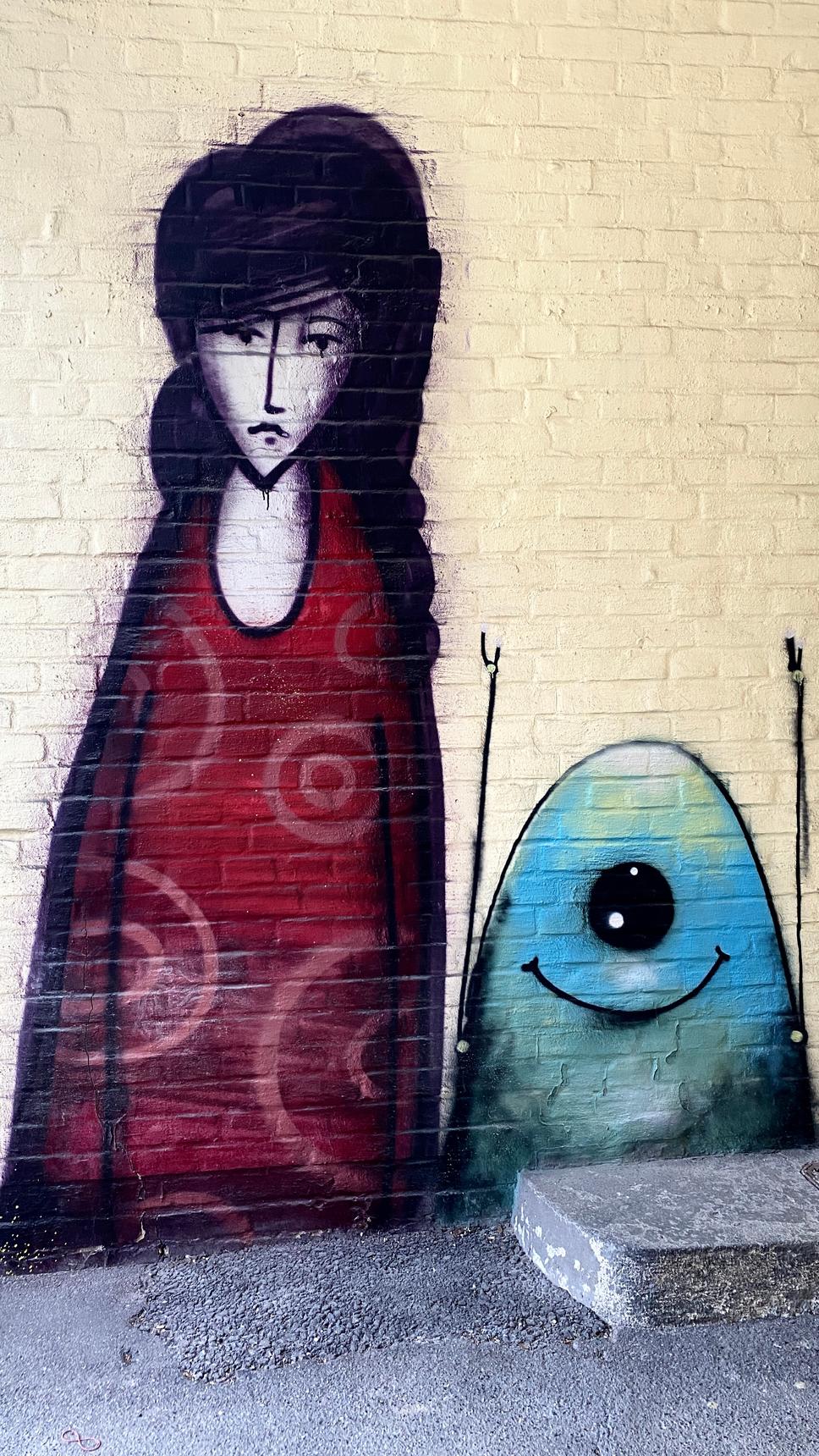 Years after her appearance, Maria in the courtyard at Boppstraße 38 is now flanked by a one-eyed, cheerful, blue alien – he seems to be raising his arms and demanding a hug. Could he make the sad girl smile?