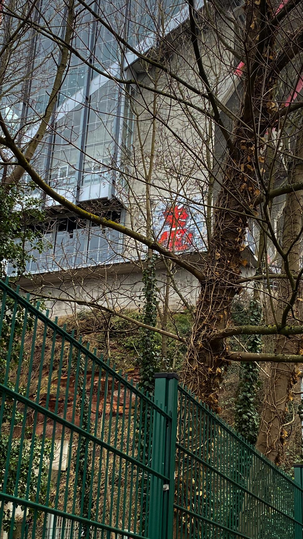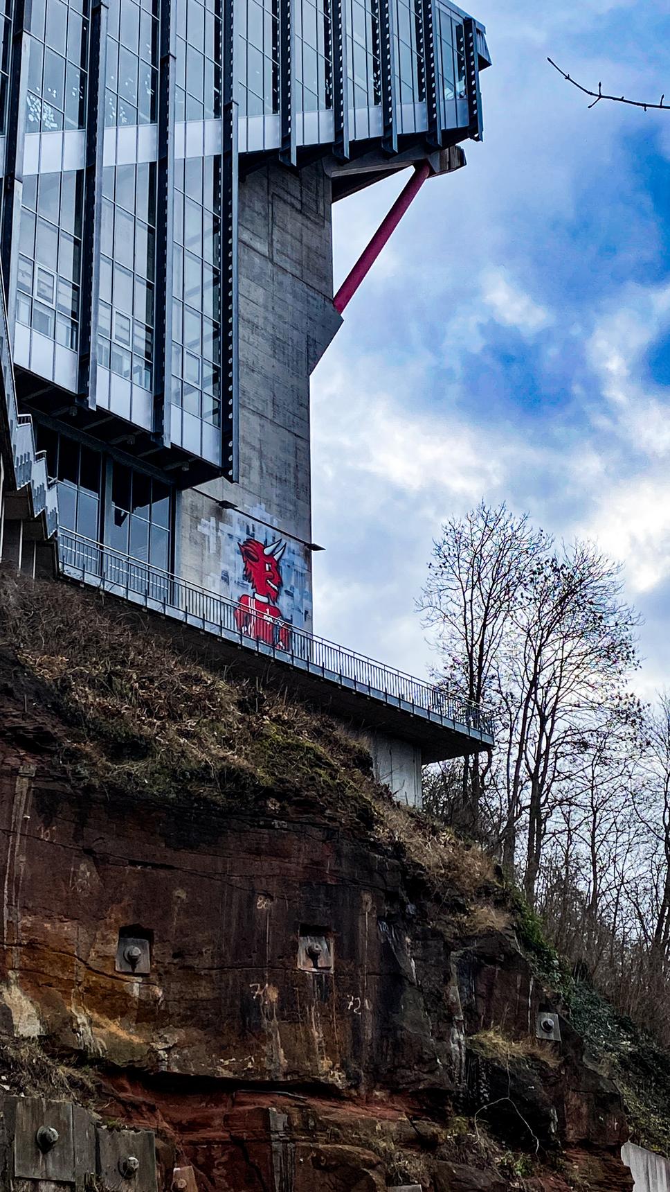 In and around the famous Fritz Walter-Stadion there‘s a lot of street art related to the 1. FC Kaiserslautern (FCK). The football club was founded in 1900, its players and fans are called ‚red devils‘ - hence the large devil on the wall on the north side of the stadium. Its name is ‚Betzi‘ and it is the mascot of the club. ‚Betzi’ wears the red and white oufit of a player, its left foot is rested on a football. Unfortunately, it is hard to capture the mural in total.