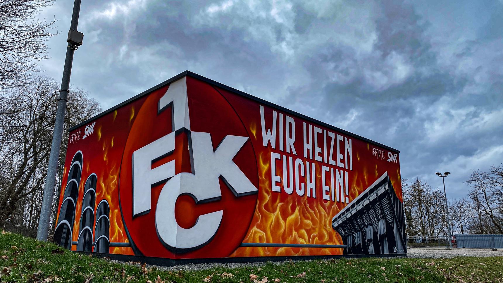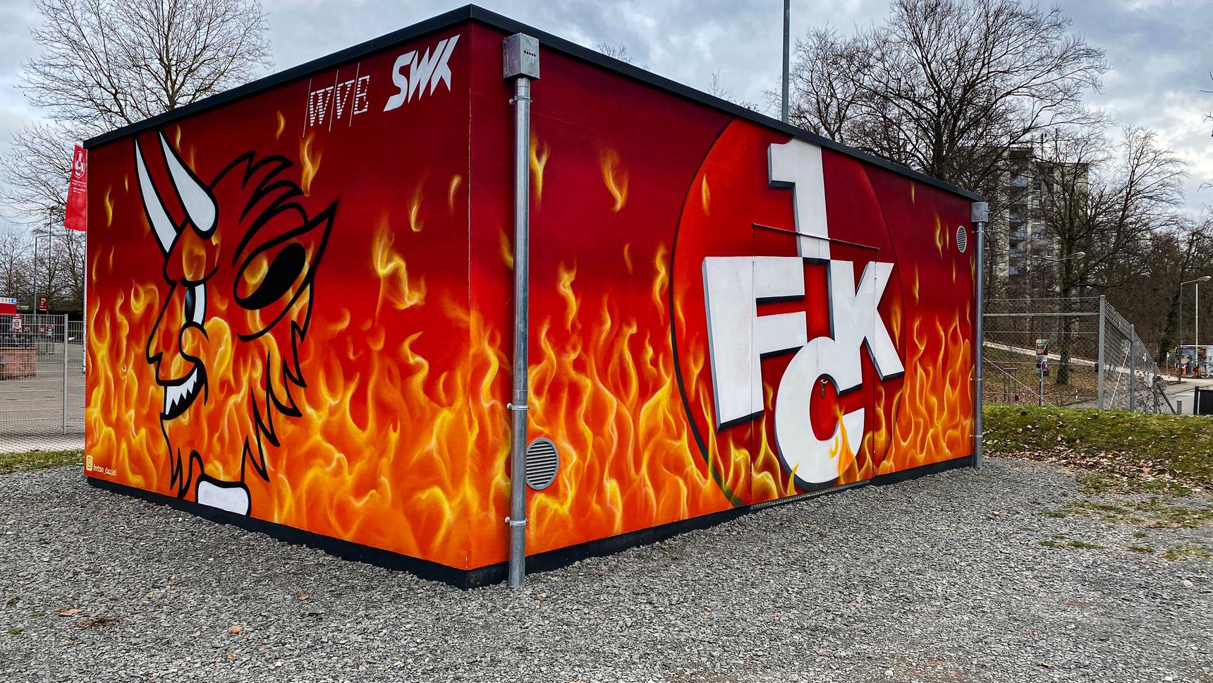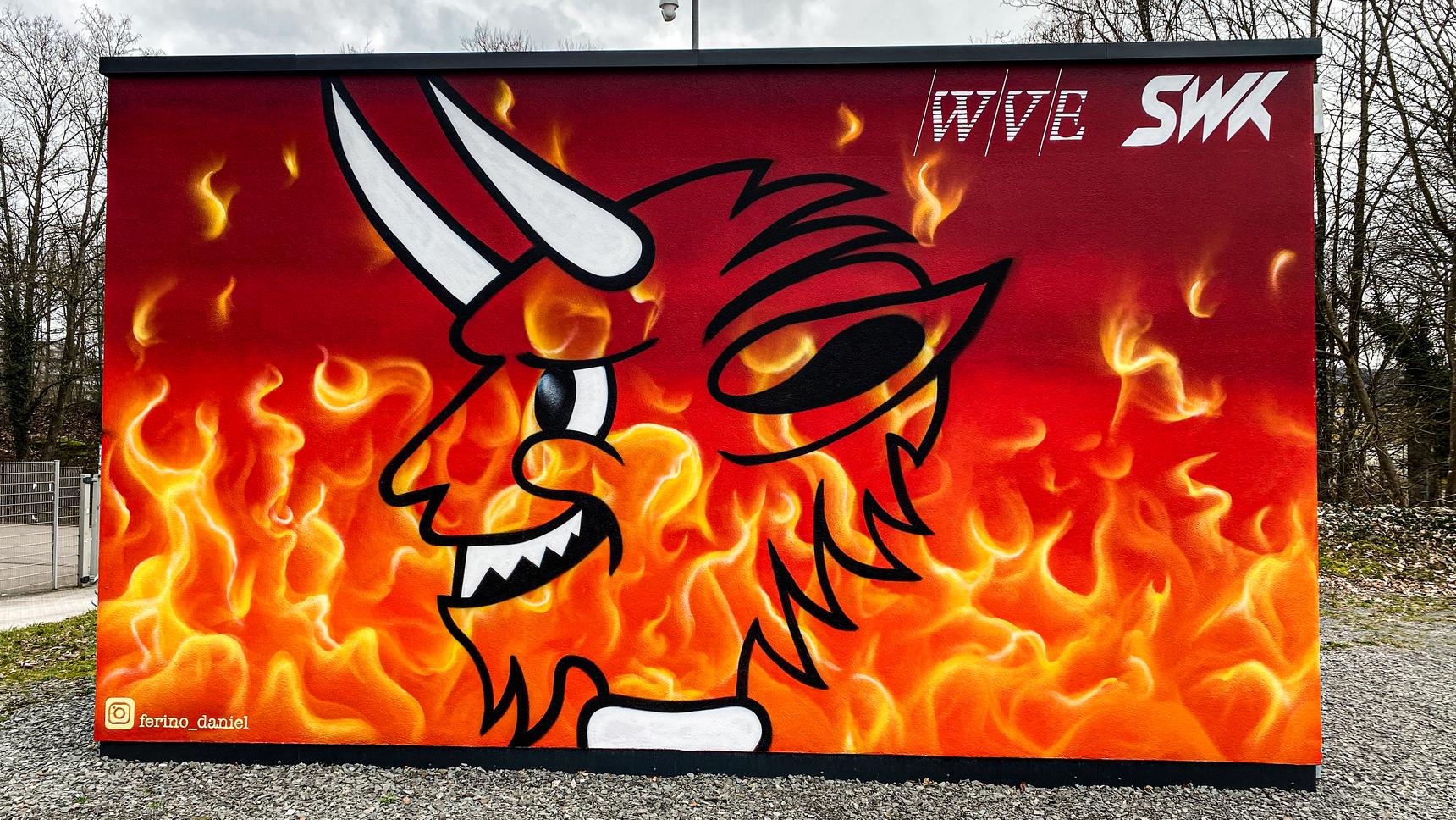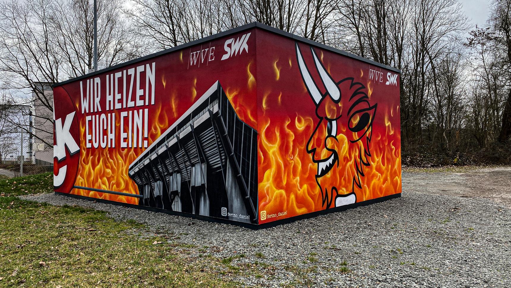 Here’s another example of street art related to the famous football club 1. FCK, sprayed on a district heating station right next to the Fritz Walter-stadium. It shows the logo of the 1. FC Kaiserslautern, the stadium itself, the mascot (the red devil ‚Betzi’) and three heat storages of the local energy supplier. The claim reads ‚Wir heizen euch ein‘ (‚We'll heat things up for you‘) - accordingly, the artist Daniel Ferino (‚Maltag’) added flames all over his graffiti, burning in bright yellow and orange. The work was finished in 2025.