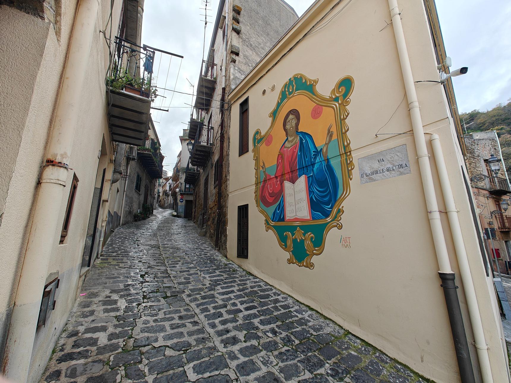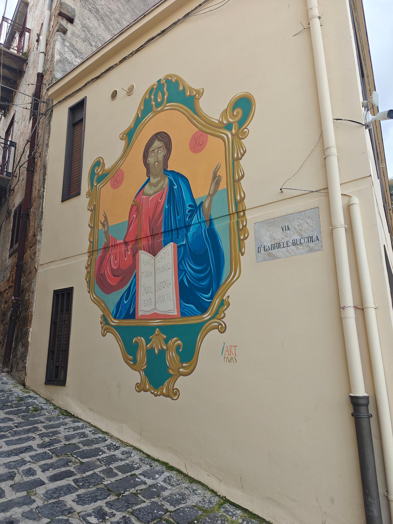 The town of Mezzojuso, with its rich Albanian heritage, has meticulously preserved a tradition of deep devotion to Byzantine iconography. This town, a tapestry of two Christian cults, holds a treasure trove of icons that echo the unbreakable connection between its past and present. Rame13โs artwork brings Christ to life in the vibrant blues and reds of his robe, set against a backdrop of celestial suns, and an open book that affirms His eternal Word. His eyes, both serene and commanding, seem to reach out to the people of Mezzojuso. The attempt to transform a religious icon into an identity symbol was successful: Rame13โs creation aims at transcending theological confines to become a vibrant, evocative tribute to the towns deep-seated heritage and collective spirit, who recognise, in this iconography, their own identity.