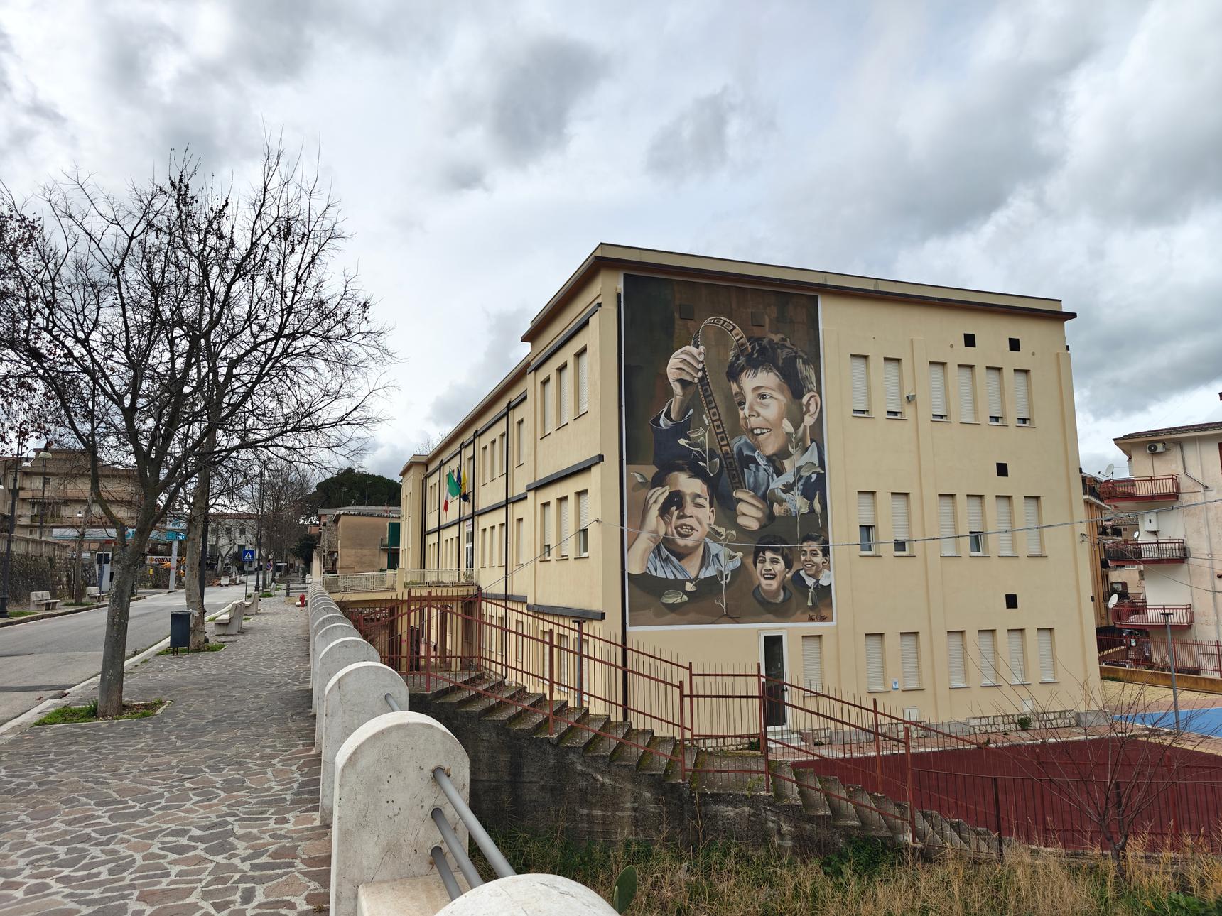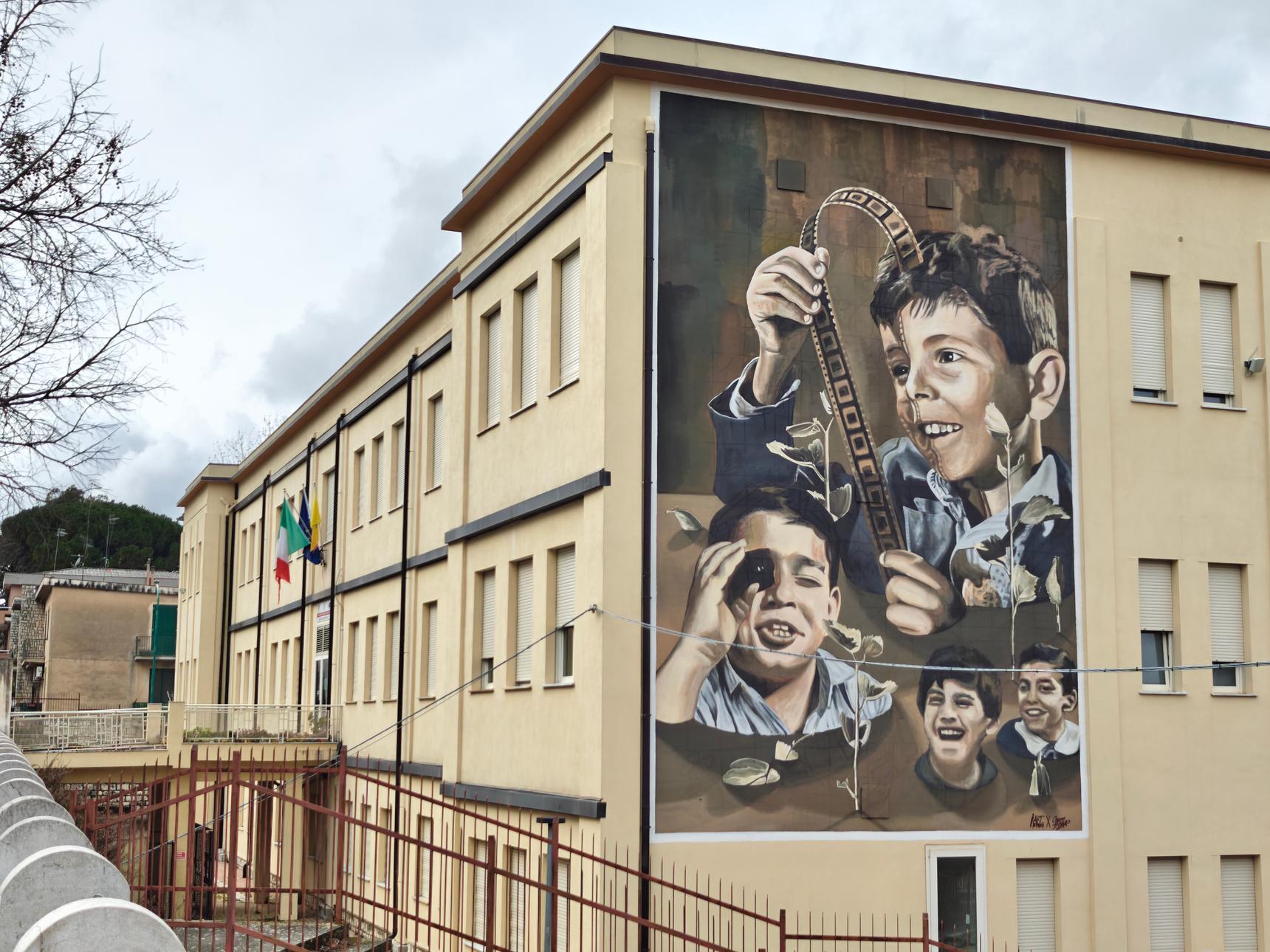 In the mural inspired by one of the iconic images from the film ‘Nuovo Cinema Paradiso’, we see little Totò lost in the magic of cinema, his eyes sparkling with the kind of wonder and delight only a child can feel. His tentative smile reveals a heart captivated by the endless possibilities on the silver screen. This is a poignant celebration of childhood, where the sheer joy of discovery is infectious, drawing in his playmates who share in his glee. This is one of the most beautiful moments of Italian cinema. Totò Cascio, the young actor who brings this moment to life, is more than just a performer; he’s the embodiment of cinematographic art, while Alfredo, in his cabin next to his projector, is a sort of wise master of the dream machine he operates.. This mural is a visual poem, a tribute to the mysterious allure of New Cinema that has found its “Paradise”.
