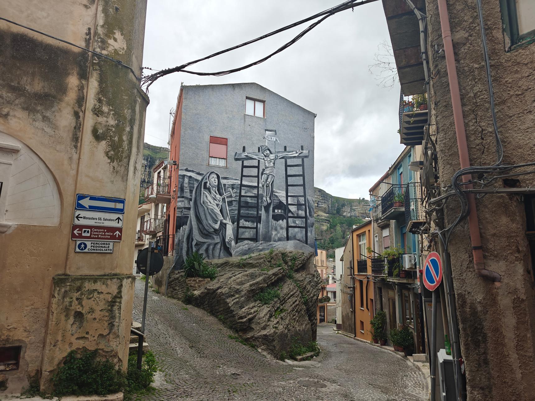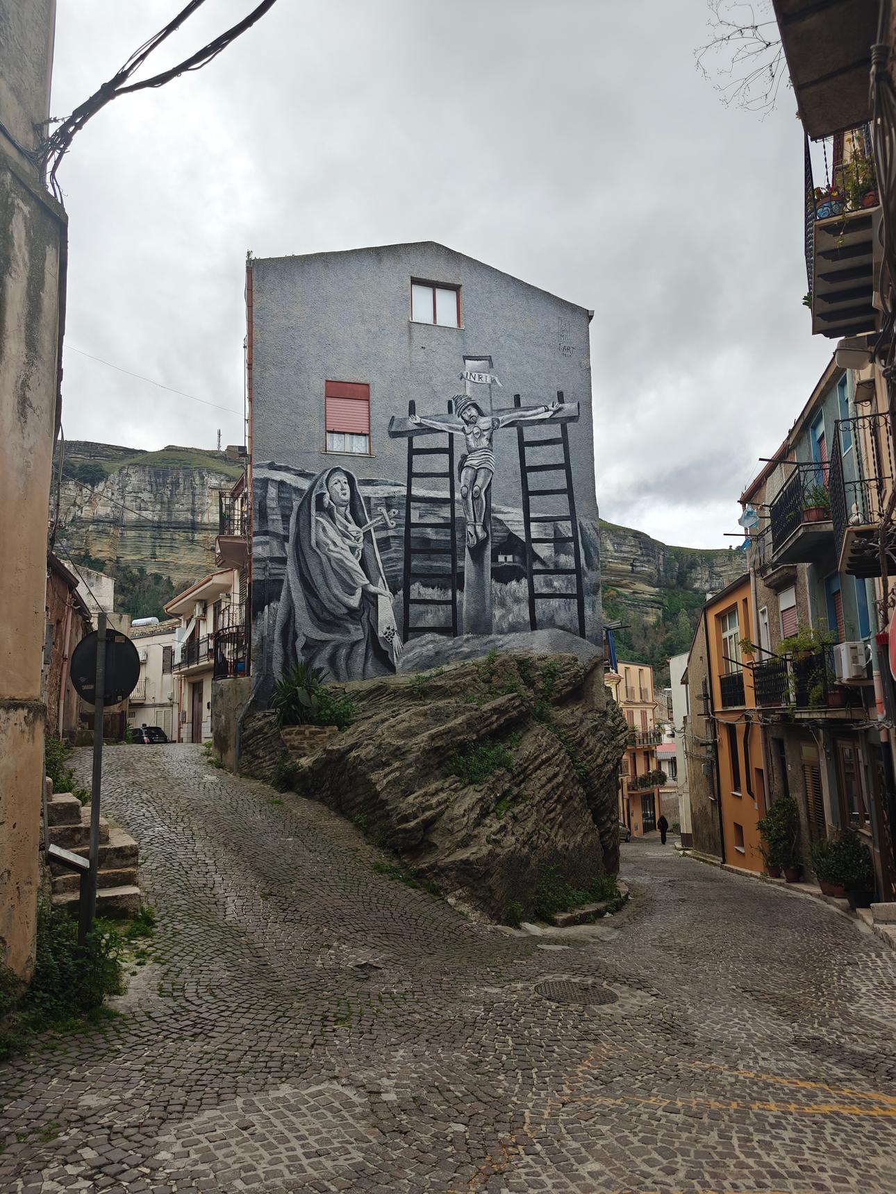 The mural stands as a vivid celebration of the Good Friday Festival in Corleone, transforming the wall of the āHouse on the Rockā in Via Candelora into a canvas of sacred art. The depiction of the processions is both serene and powerful, capturing the moment the body of Christ is brought forth from the Church, signaled by the sound of firecrackers. The Simulacrum, placed on a white sheet, is a focal point of the mural, exuding a sense of purity and solemnity as it is carried by the priests towards the crucifixion site. The āGreat Crossā leading the procession, is flanked by two lanterns, symbolizing the divine illumination that pierces the darkness of the streets of the world, along the road that leads to Calvary. Embodying the timeless narrative of sacrifice and redemption that is at the heart of Good Friday.