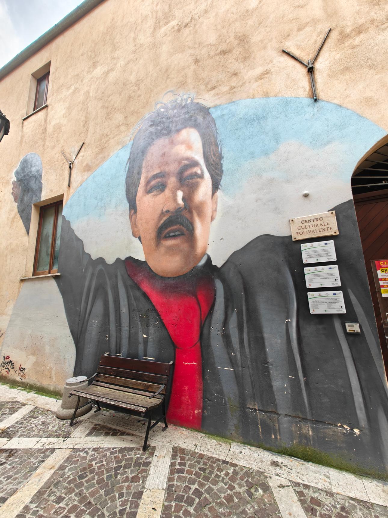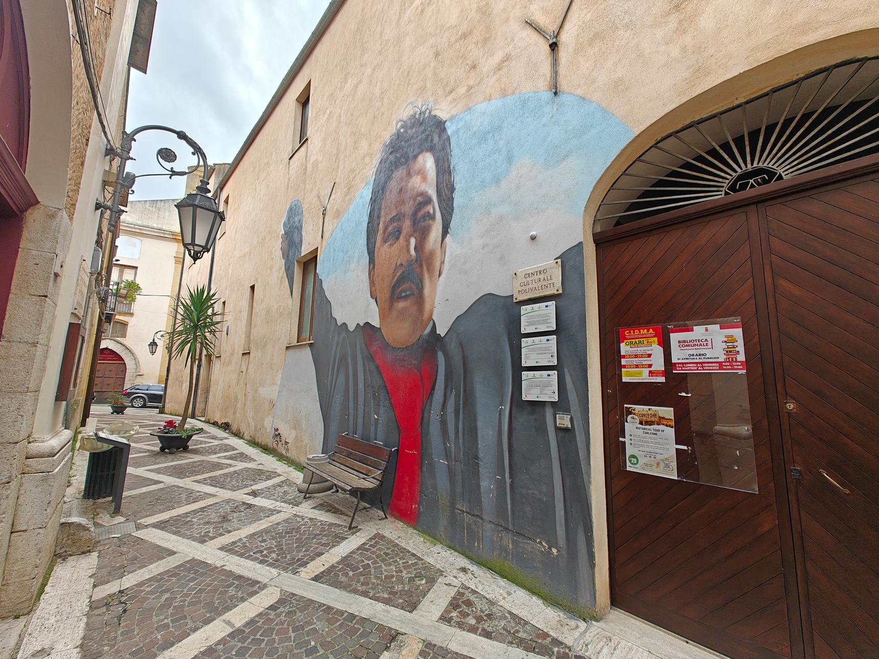 Loste’s mural, presents a striking portrait inspired by the figure of Placido Rizzotto, as depicted by Marcello Mazzarella in Pasquale Scimecas film. Rizzotto was a fervent advocate for worker’s rights and a trade unionist in the land of Corleone, one of the first heroes in the great history of Sicilian martyrs. Kidnapped and killed by the mafia. The artwork captures the spirit of a “comrade” whose eyes speak volumes of resilience and hope. They seem to tell us: “I am with you, in everyday life. No sacrifice happens in vain and by chance. Today everything can return to normal, continue to live without fear.” The mural, prominently displayed at the entrance of the C.I.D.M.A. serves as a canvas of historical memory and artistic expression. Through Lostes unique blend of realism and symbolism, the mural evokes a powerful narrative of defiance and liberation, inviting viewers to engage with the past while envisioning a future free from the shadows of fear and oppression.