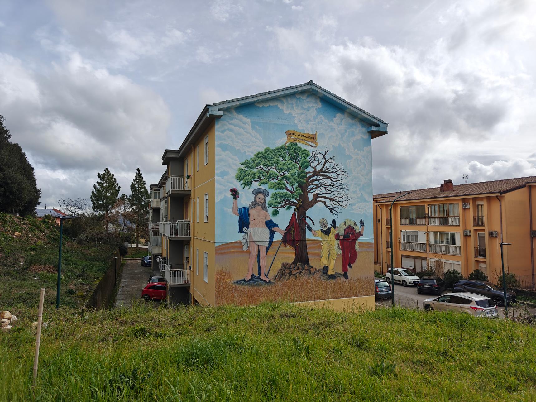 The mural is a tribute to the Ballo dei Diavoli of Prizzi, a celebration of medieval origins that holds deep cultural significance. On Easter morning, the air is thick with anticipation as the townspeople awaken, ready to embrace the light that follows the darkness of Good Friday. The devils, dressed in red and adorned with horned masks, roam the streets with a mischievous and eerie presence, while Death, clad in yellow, leads them with a terrifying fervor. The clash of ringing instruments fills the air, adding to the chaos as the devils seek to disrupt the sacred reunion of the Virgin and the risen Son. Mikhail Albano’s work places the risen Christ in the foreground, depicted as the Tree of Life, standing as a beacon of hope and renewal amidst the turmoil. Yet, even in this victory, the devils and Death linger, replayed year after year, a reminder of the cyclical nature of this ancient tale, with the eternal battle between light and darkness.