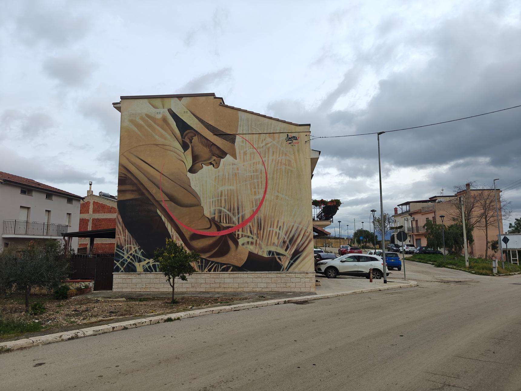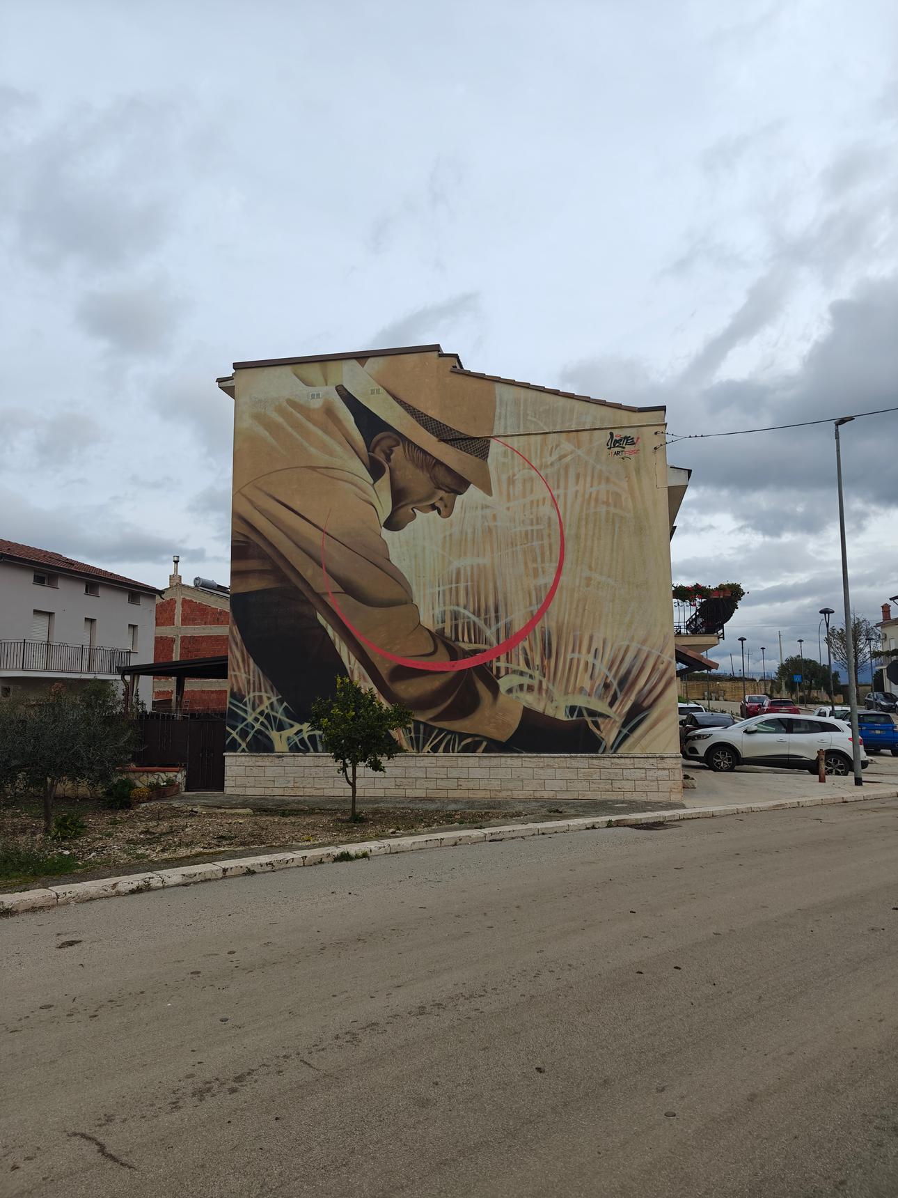 Loste’s mural offers a heartfelt tribute to Sicilian agriculture, drawing inspiration from Vittorio De Seta’s poetic documentaries. At its center is a farmer whose lined face and worn hands reflect a lifetime of labor and resilience. His movements—sowing, shifting soil, working with deliberate care—capture the wisdom and precision passed down through generations. Kneeling in a posture that blends exhaustion with devotion, he balances himself with one arm while continuing his task with the other, embodying the quiet heroism of those who endure the island’s harsh sun to cultivate its fields.
