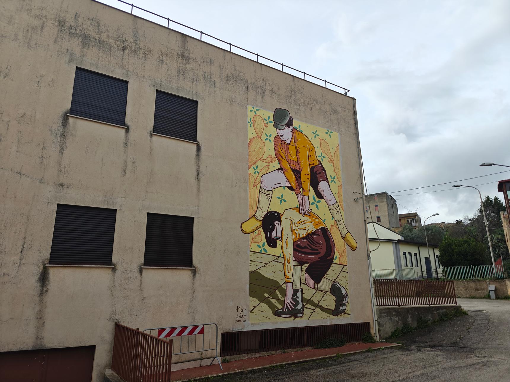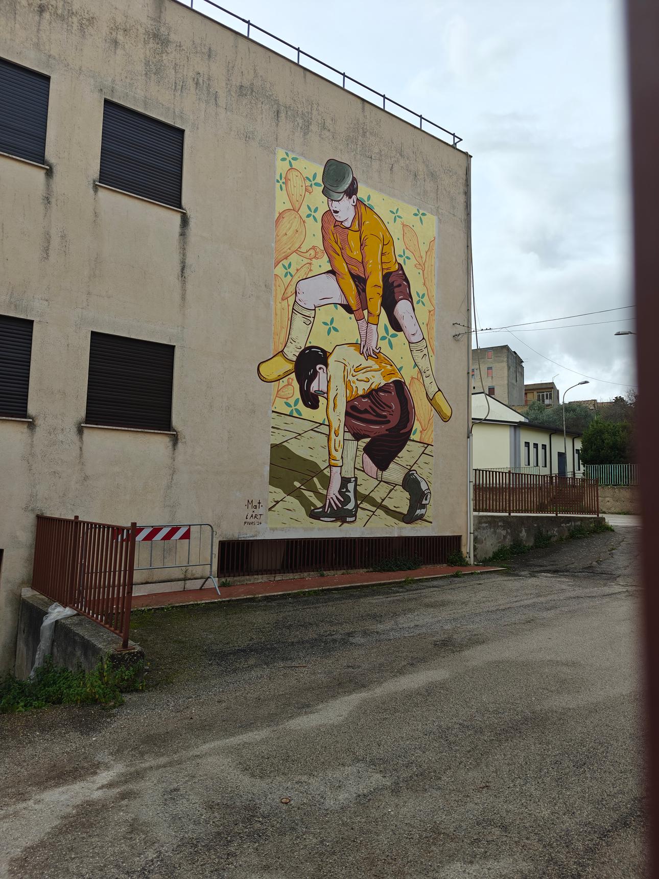 Seba_Mat’s mural revives the joyful spirit of childhood games from another era, transforming a once‑common pastime into a vibrant contemporary scene. At its heart is the lively game “Acchiana u patri cu tutti i so figghi!”, an acrobatic challenge where one child arches their back against a wall while the others leap over them in single file, touching lightly and shouting the game’s playful refrain. The movement recalls a spirited version of leapfrog, full of rhythm, laughter, and daring jumps. Accompanying the action is the traditional nursery rhyme once recited during the game, a melodic thread tying the artwork to the memories of those who grew up with it.
