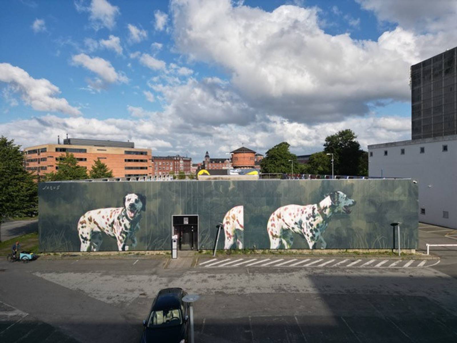 Like going for a walk in the park surrounded by high grass and beautiful trees, the new mural from Emmanuel Jarus embraces the nature around it. Beautiful Dalmatian dogs appear in worm’s eye view at the parking lot.