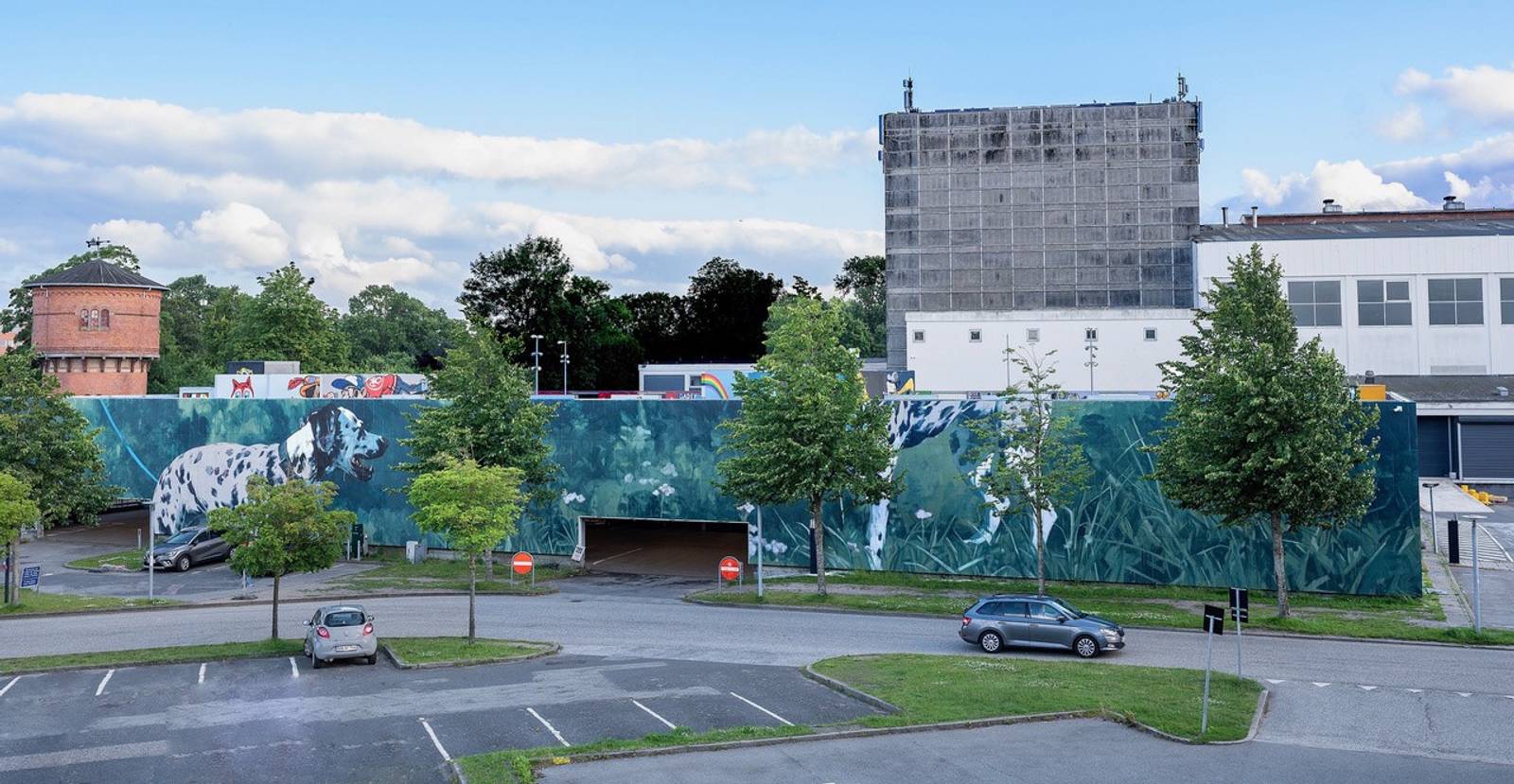 In an impressionistic imagery, the feeling of being diminished as a very small part of nature appears. As if you were walking in very high and oversized grass where looking up at everything from below, feeling the overruling impact of nature on mankind. Emmanuel Jarus has named the mural ’Hundevagt’ (Dog Watch)