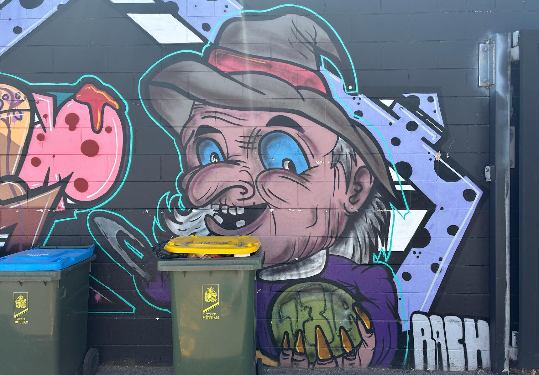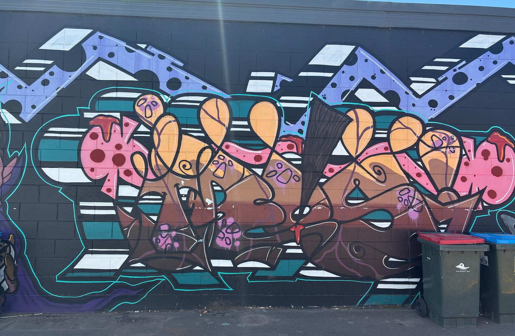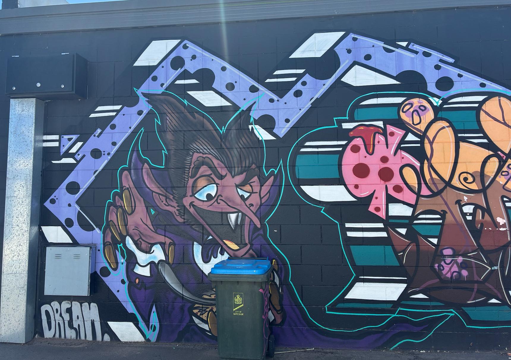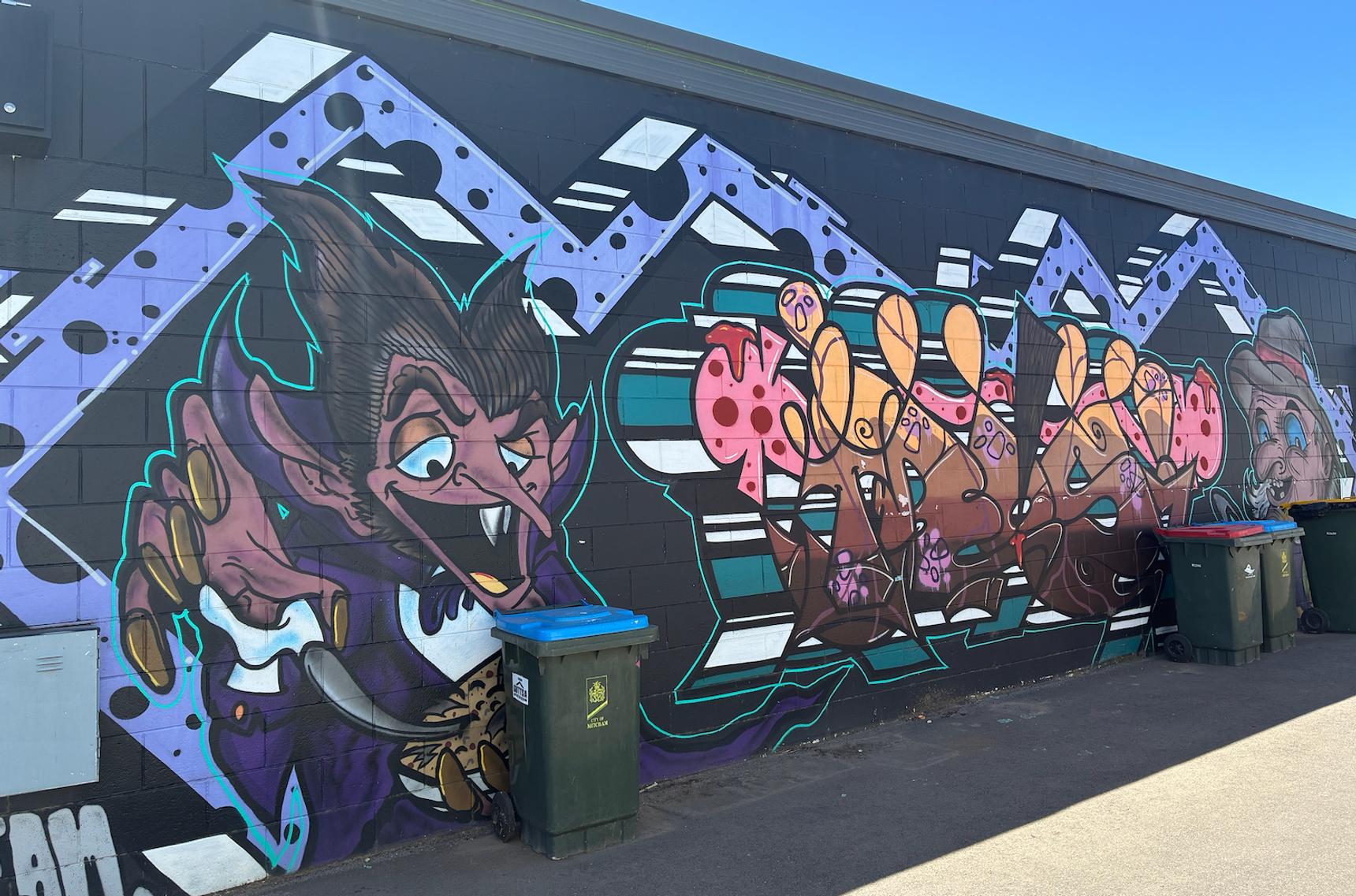 The mural includes a stylized depiction of a vampire character and intricate letter-based graffiti.