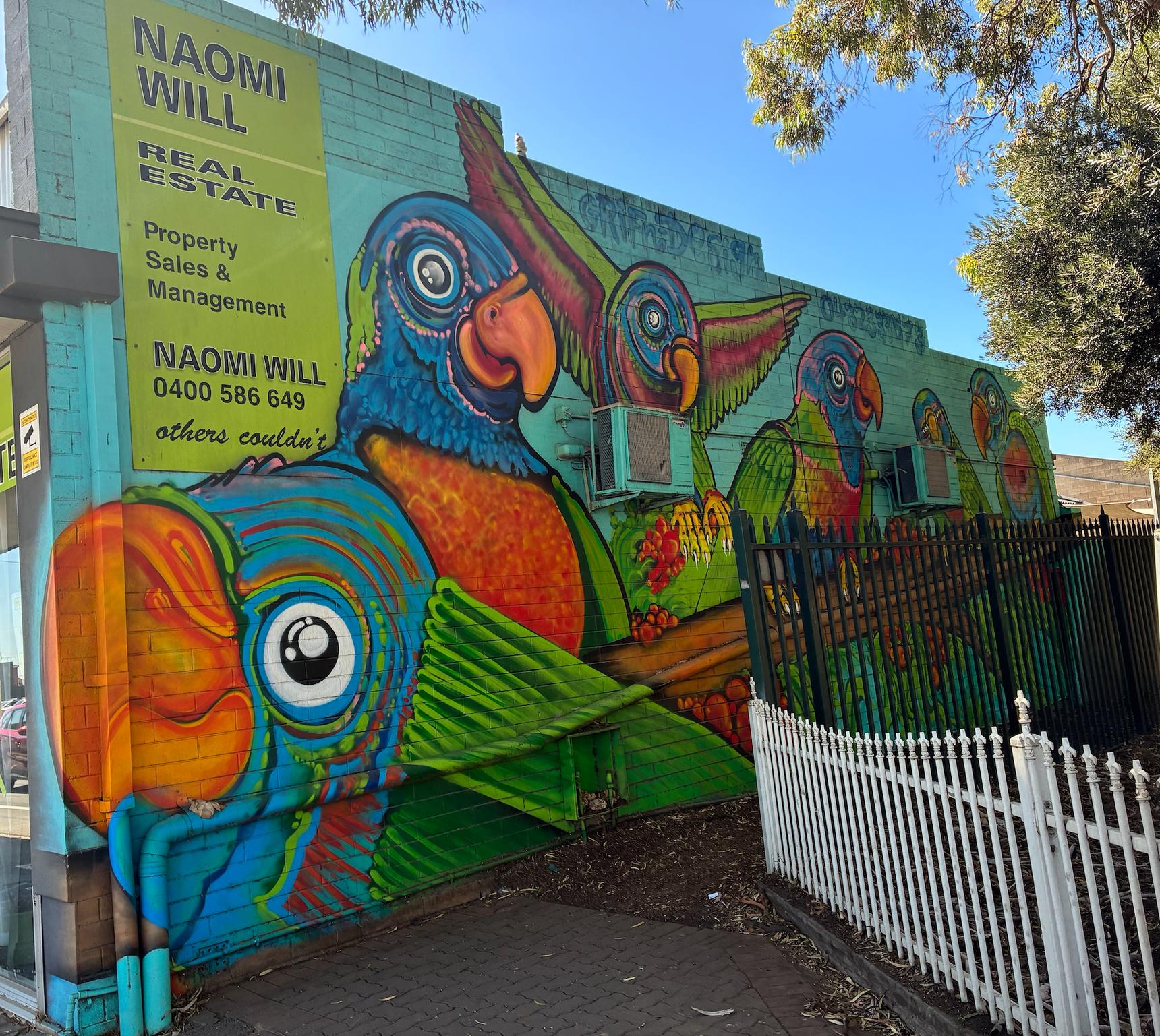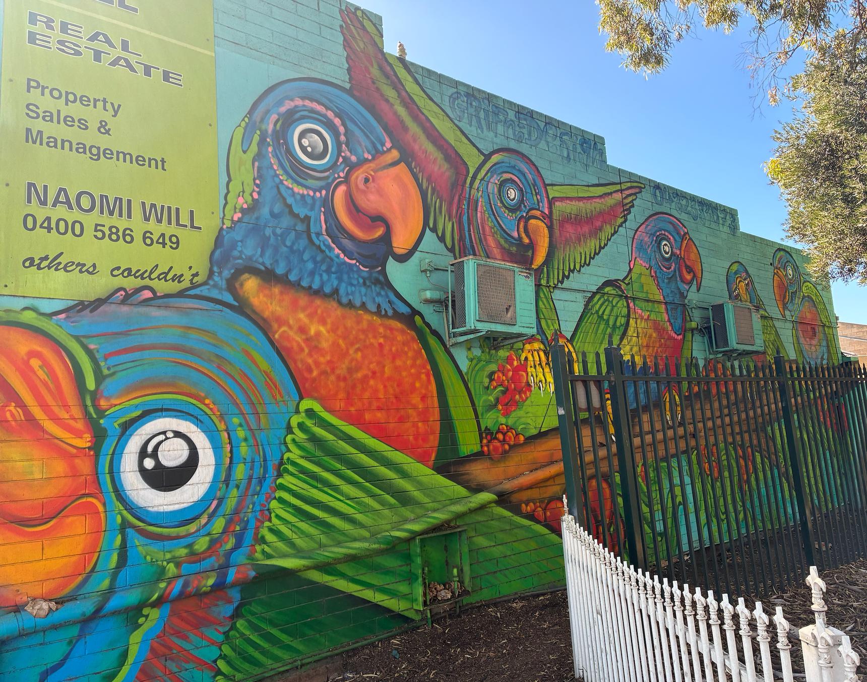 The image displays a vibrant mural featuring colorful lorikeet birds on a brick wall, which includes advertising for a local real estate business.
