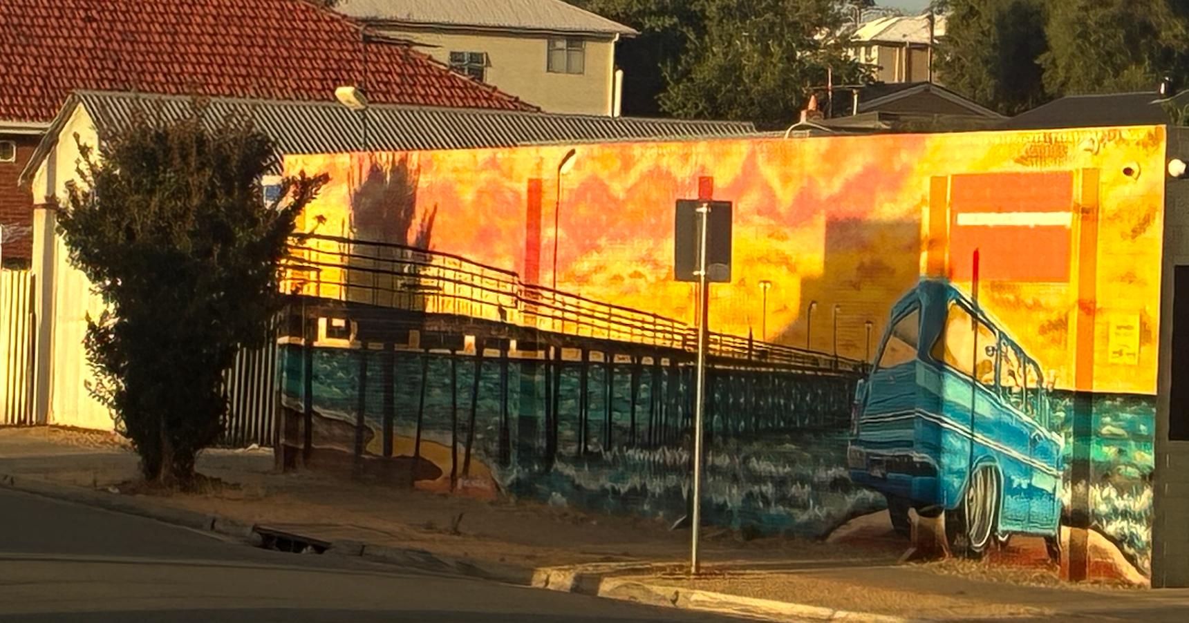 The artwork depicts a pier or bridge extending into water, under a warm, sunset-coloured sky. A blue vintage bus is painted on the right side of the wall.