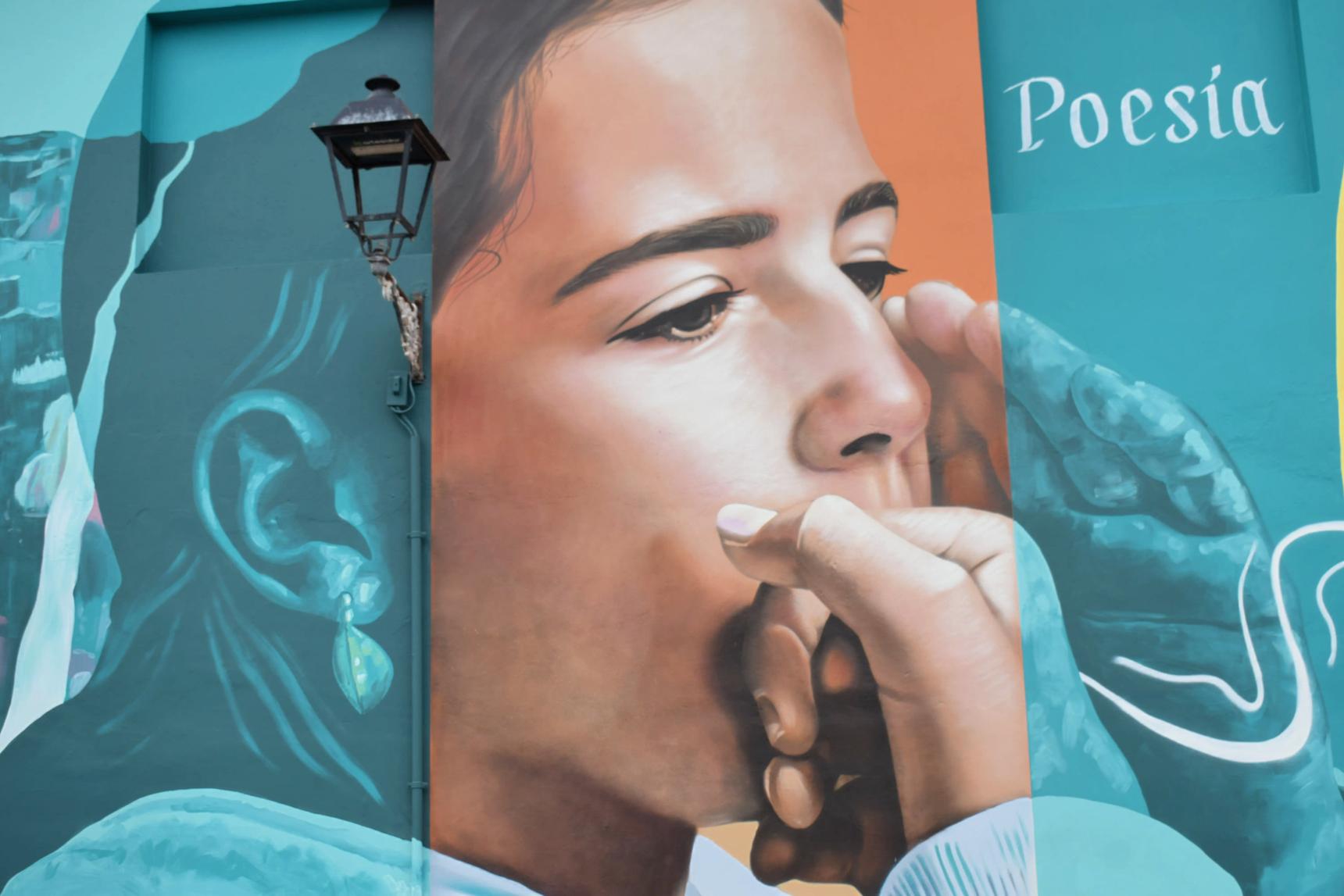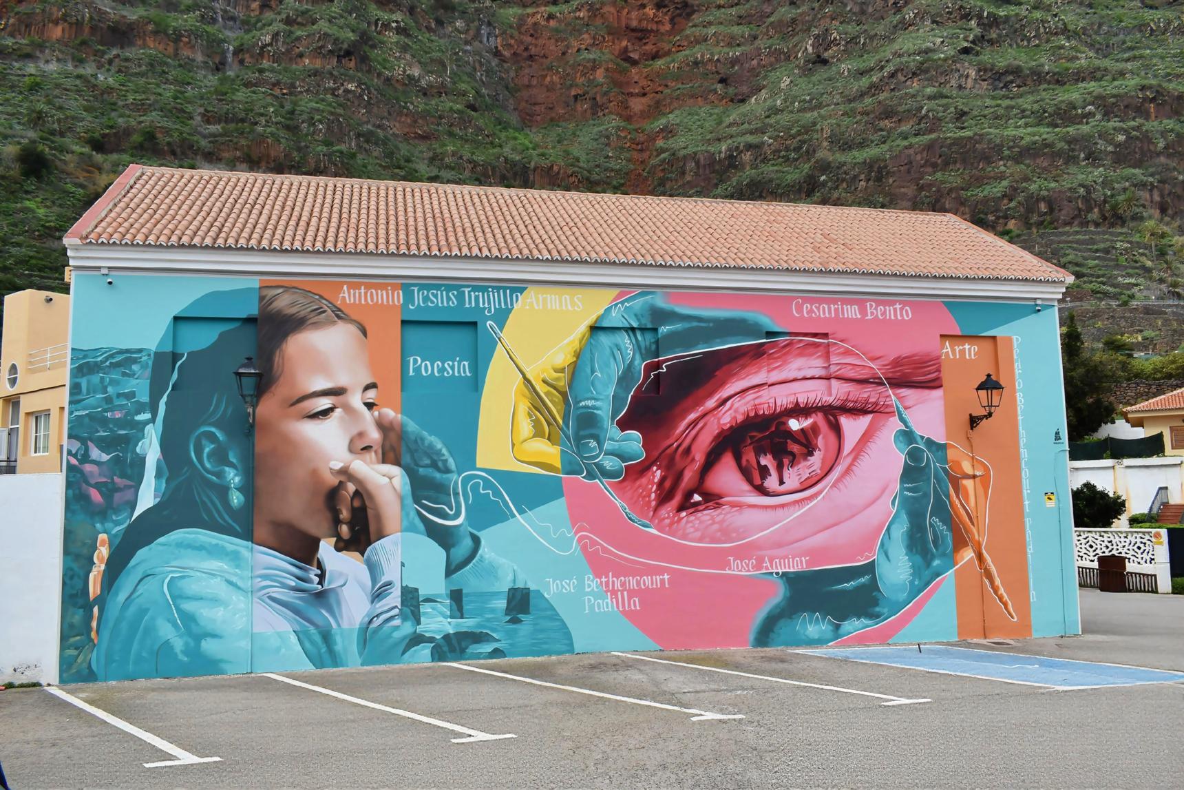 The heart of the composition is a gaze framed by hands, inspired by the sensitivity of Cesarina Bento, a pioneer of Canarian poetry. Through her eyes, I also reflect the warmth of the Bonfires of San Marcos (Hogueras de San Marcos), whose flames light up Agulo every year in a night of deep emotion. For me, this mural is a symbol of memory and belonging, a window into the essence of this place.