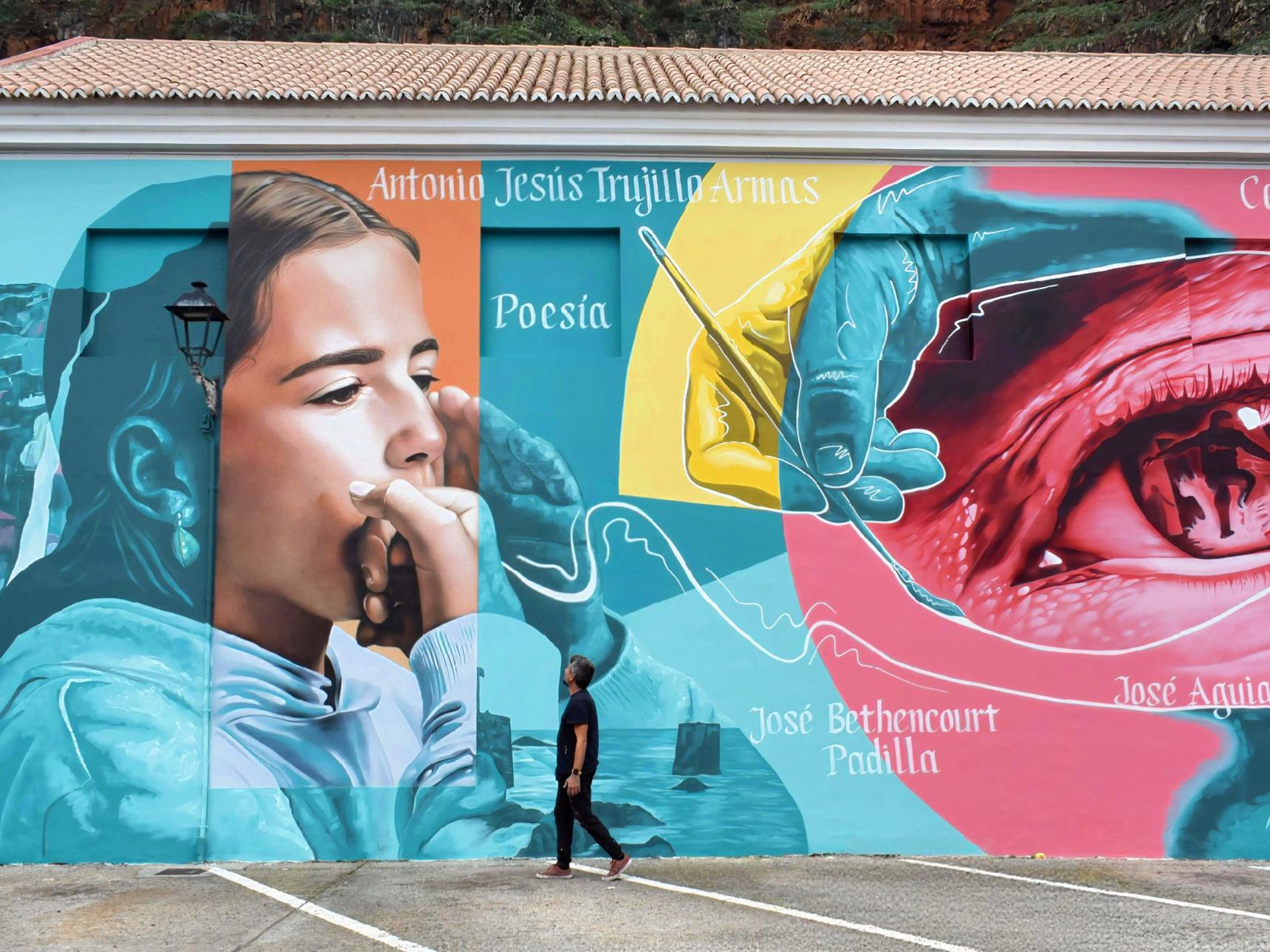 In the mural, the figure of the girl represents the living present of the Silbo Gomero. She is the symbol of a tradition that endures—a unique whistled language declared Intangible Cultural Heritage of Humanity by UNESCO. Here, the whistle merges with the peaks and the sea of our people, reminding us of the importance of our culture, from its most emblematic figures to its most ancestral customs.