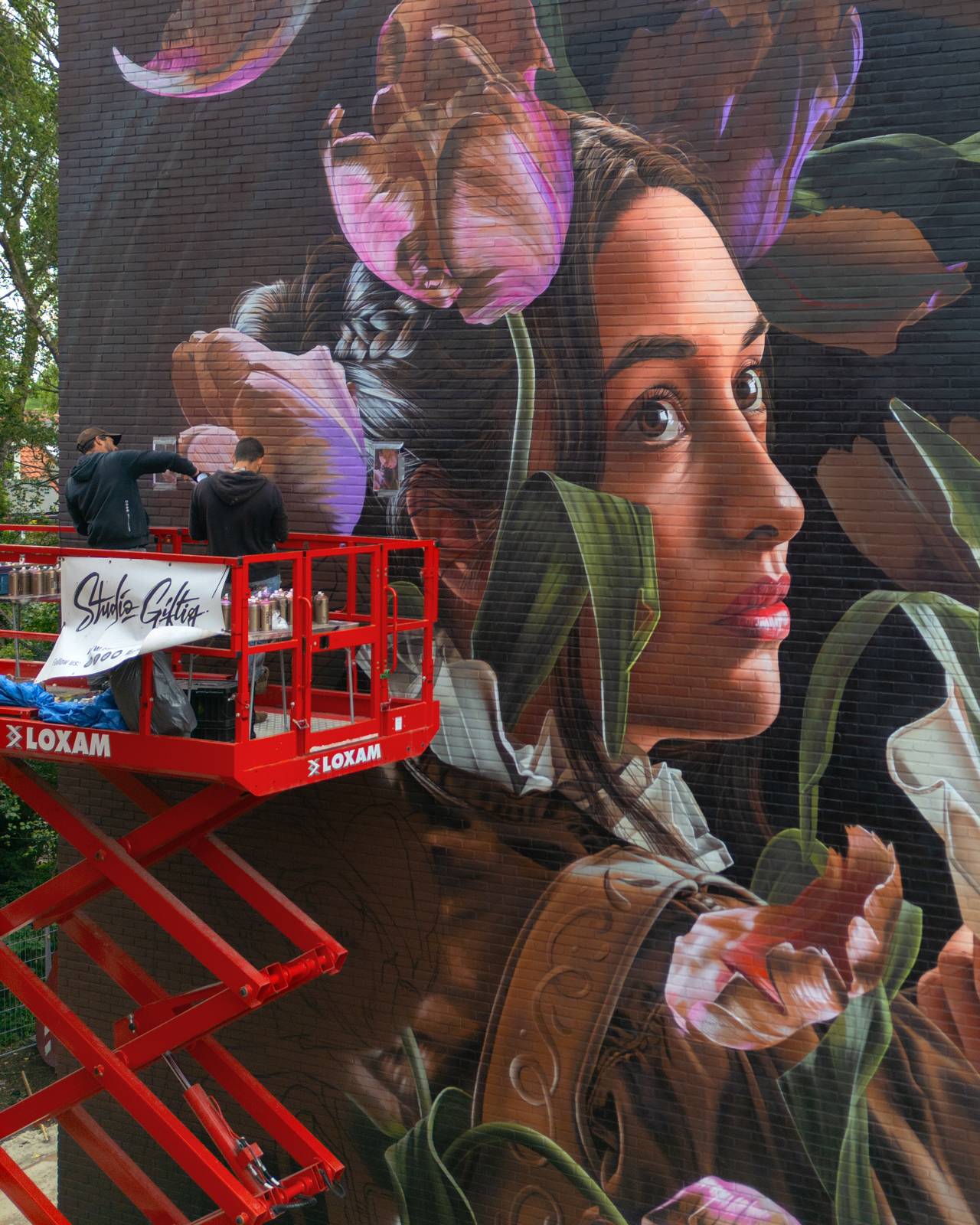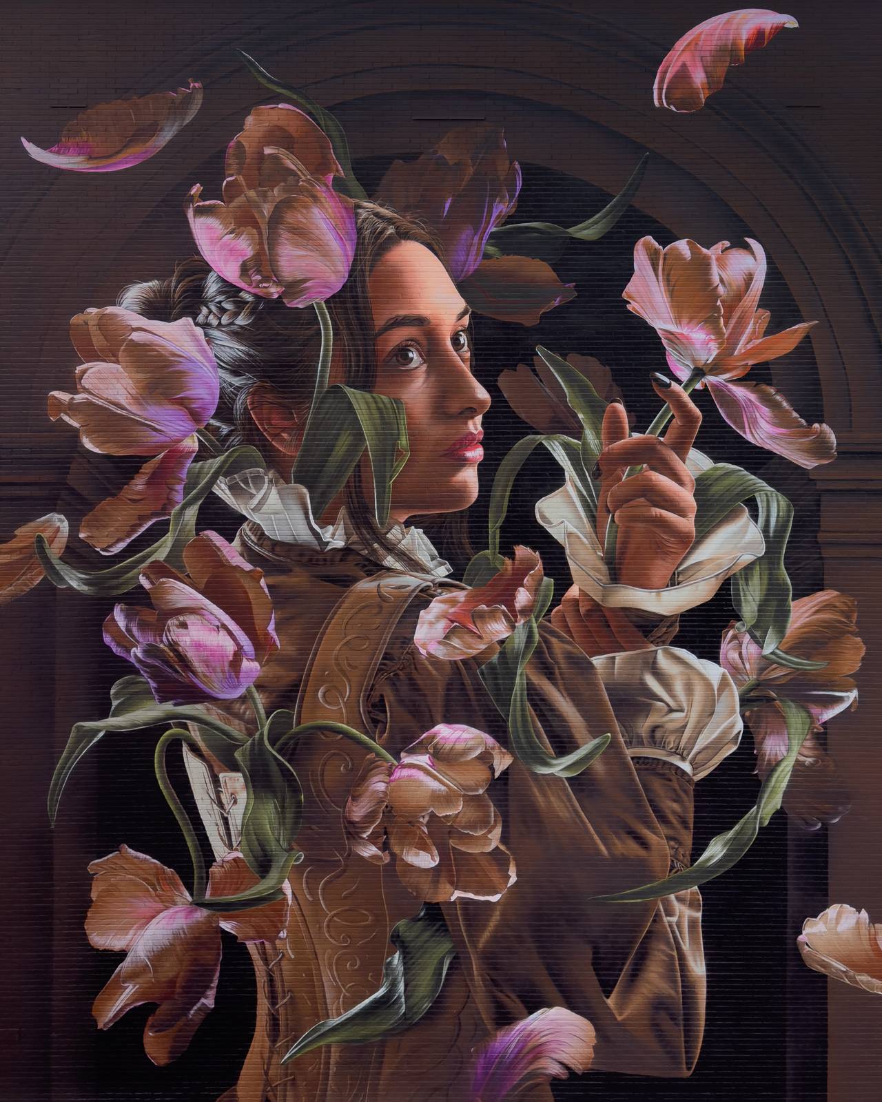 A graceful young woman stands in quiet stillness as warm orange-brown tulips grow from her body, rooted in inner strength. Inspired by the Dutch Masters, this contemporary piece blends symbolic light and depth. The parrot tulip, once cherished in still lifes, now embodies transformation and grounded beauty.
