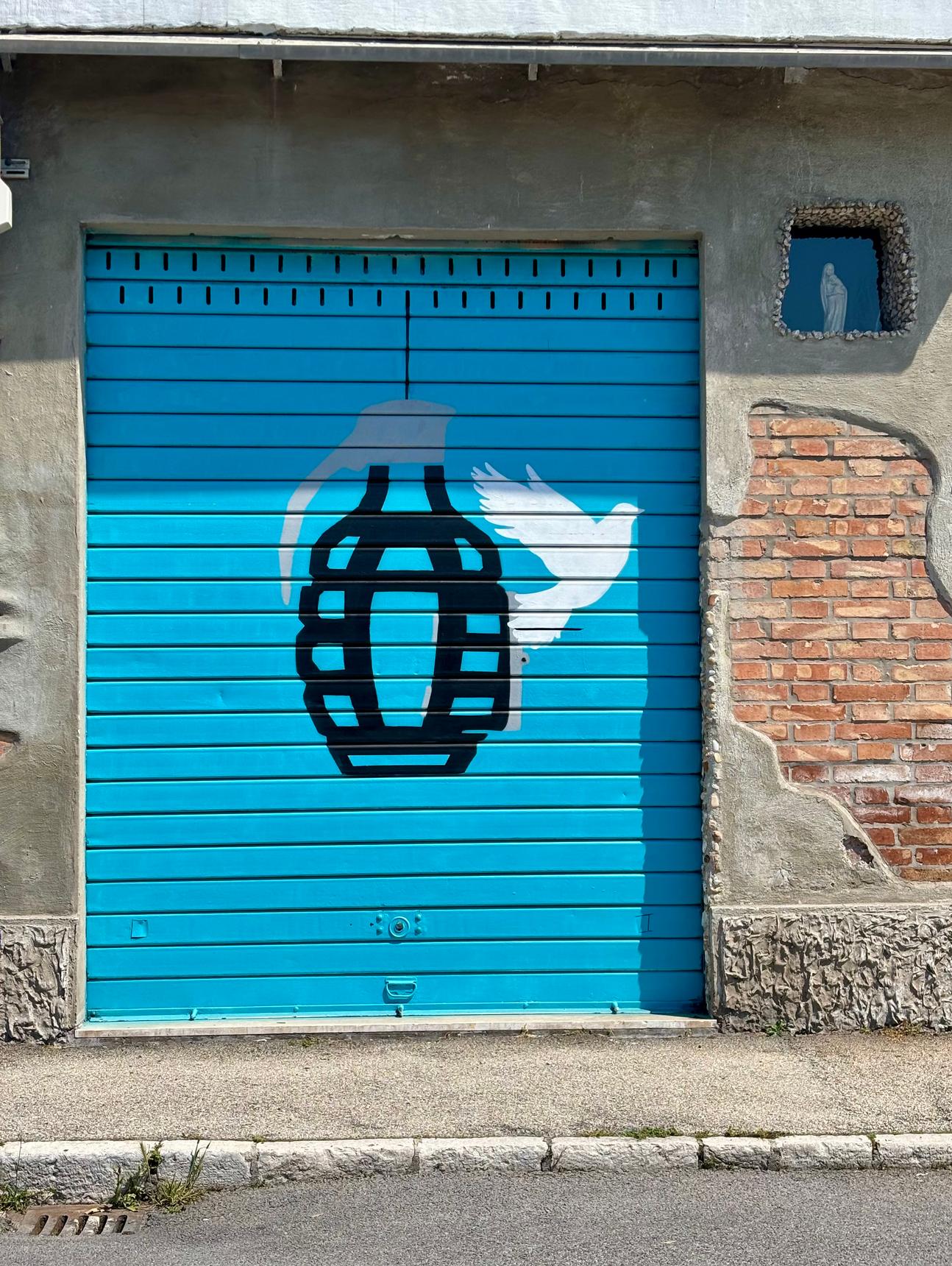 This murales is located in Ancona city, Via Filippo Marchetti 2 N, in the neighborhood of “Archi Montirozzo”. It is in optimal conditions, probable produced in year 2025 and easily visitable on foot/car. It represents a dove that comes out of a bomb, on a light blue background, symbol of peace and hope..