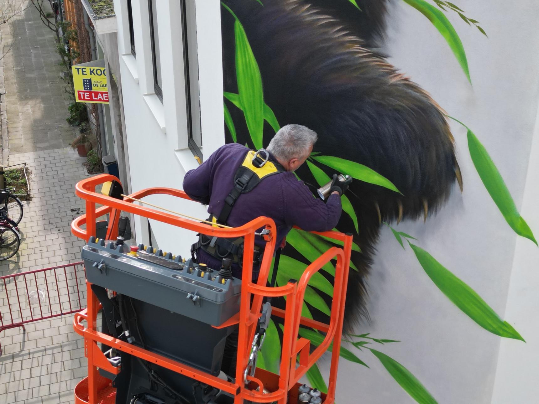 The panda looks out from between fresh green bamboo, with a gaze that is both soft and streetwise. No overacting, no gimmicks, just an animal with exactly enough attitude to fit in Berchem. The sleek white wall makes the black and white of the panda even more intense, as if it wasn't painted but is crawling out of the facade. The bamboo is sharp and graphic, a typical Smok touch that keeps the whole thing fresh without making it too sterile.