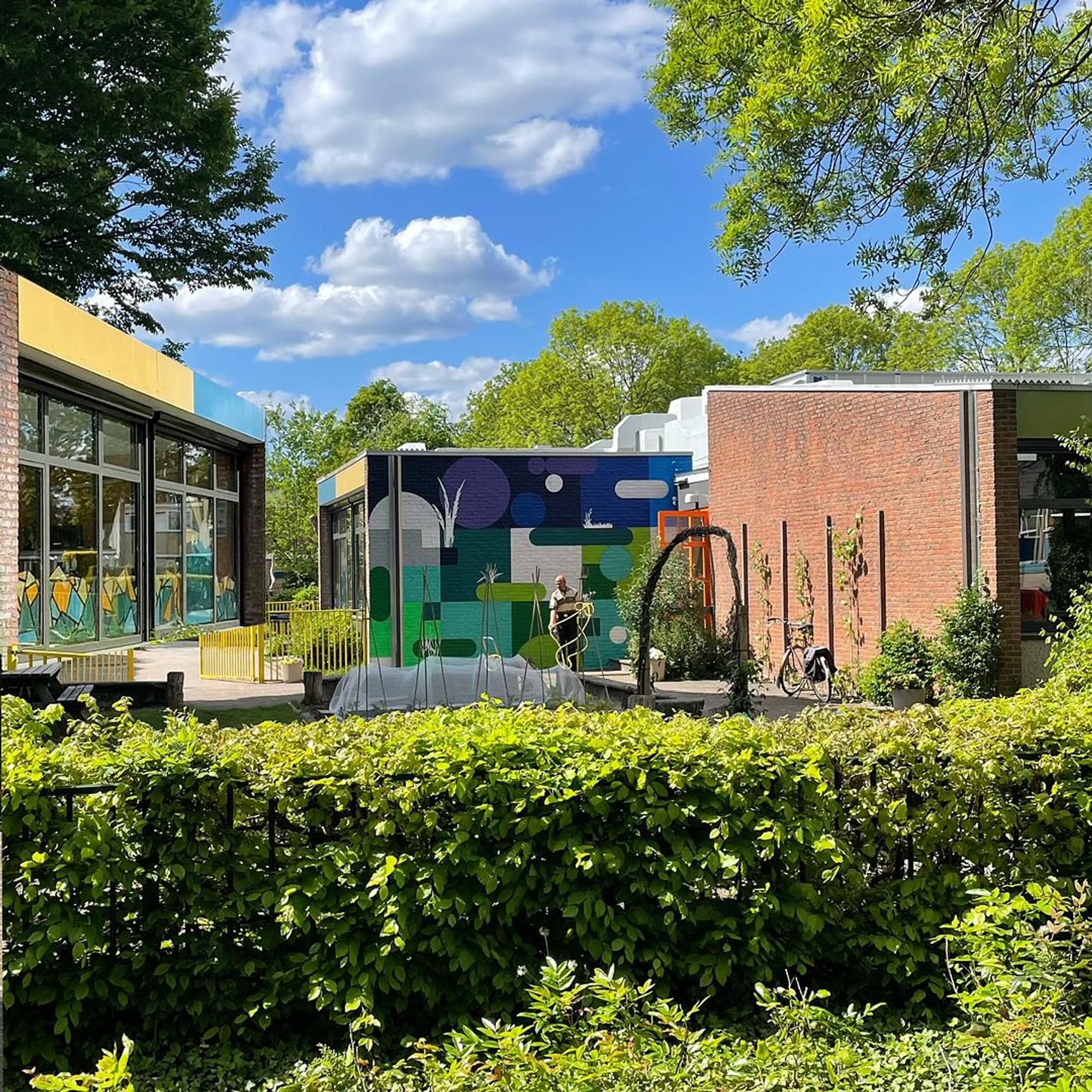 Van workshops, naar ontwerp en uiteindelijk een knallende muurschildering, dit project had echt alles. Het kleurrijke ontwerp met wildgroei sjablonen en de kleuren van de onder- en bovenbouw van ’t Schrijvertje smelten prachtig samen met het groene, begroeide plein. Wat een feest om hieraan te mogen werken!