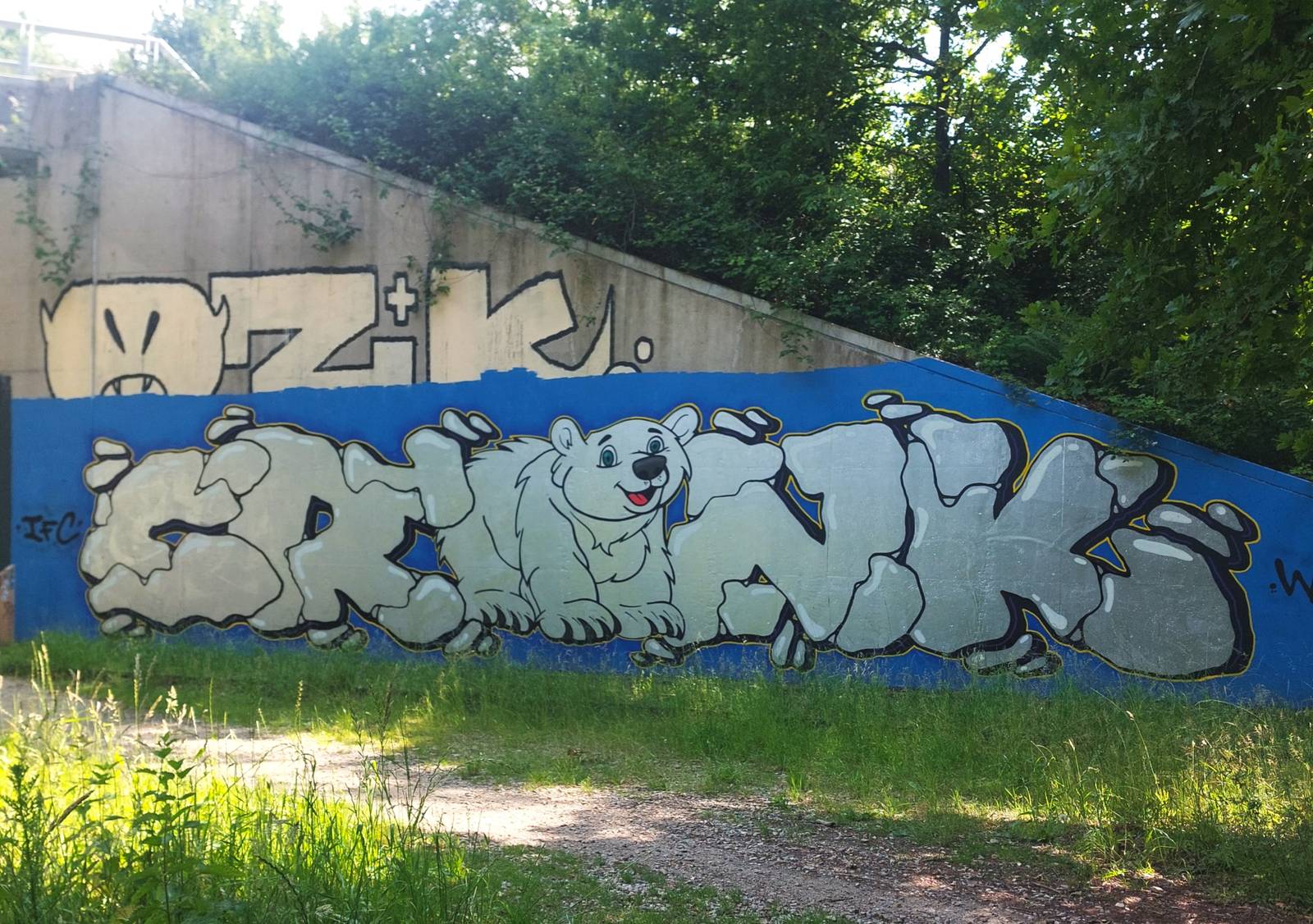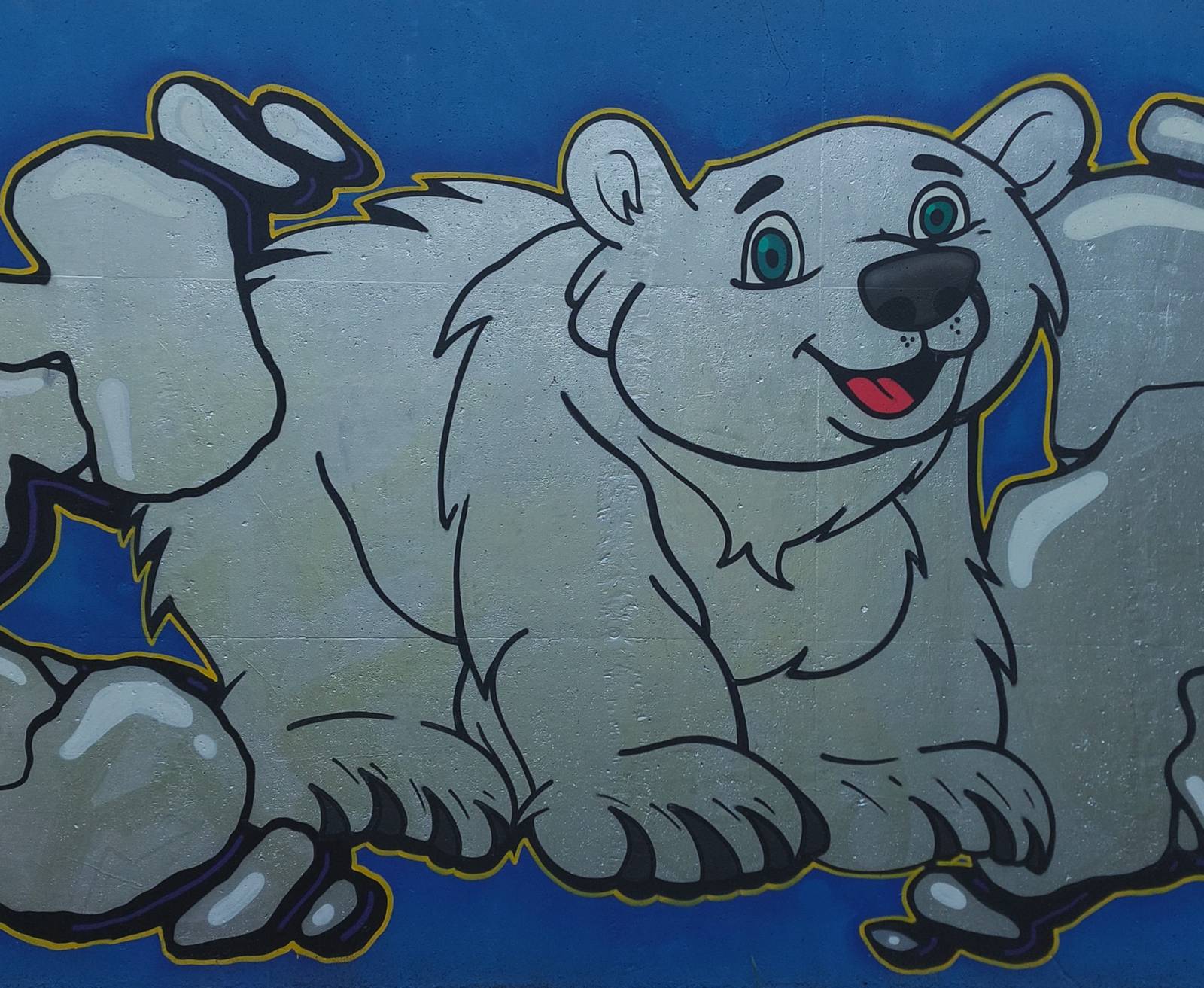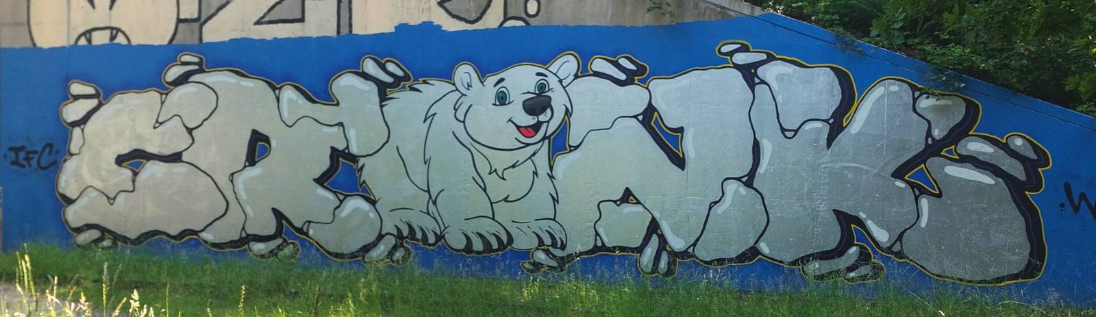 Muurschildering van Crank op de zijwand van de oude spoorwegtunnel.