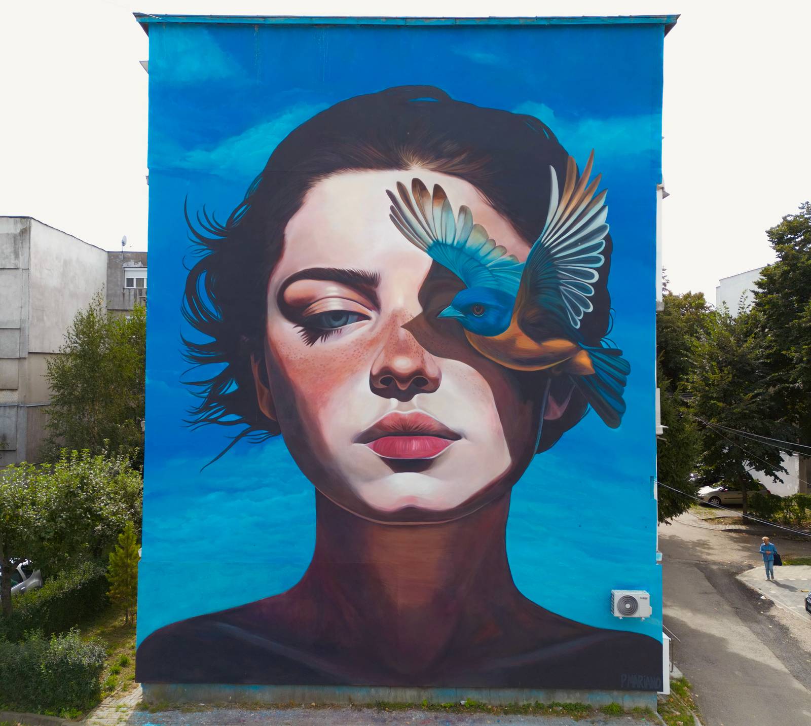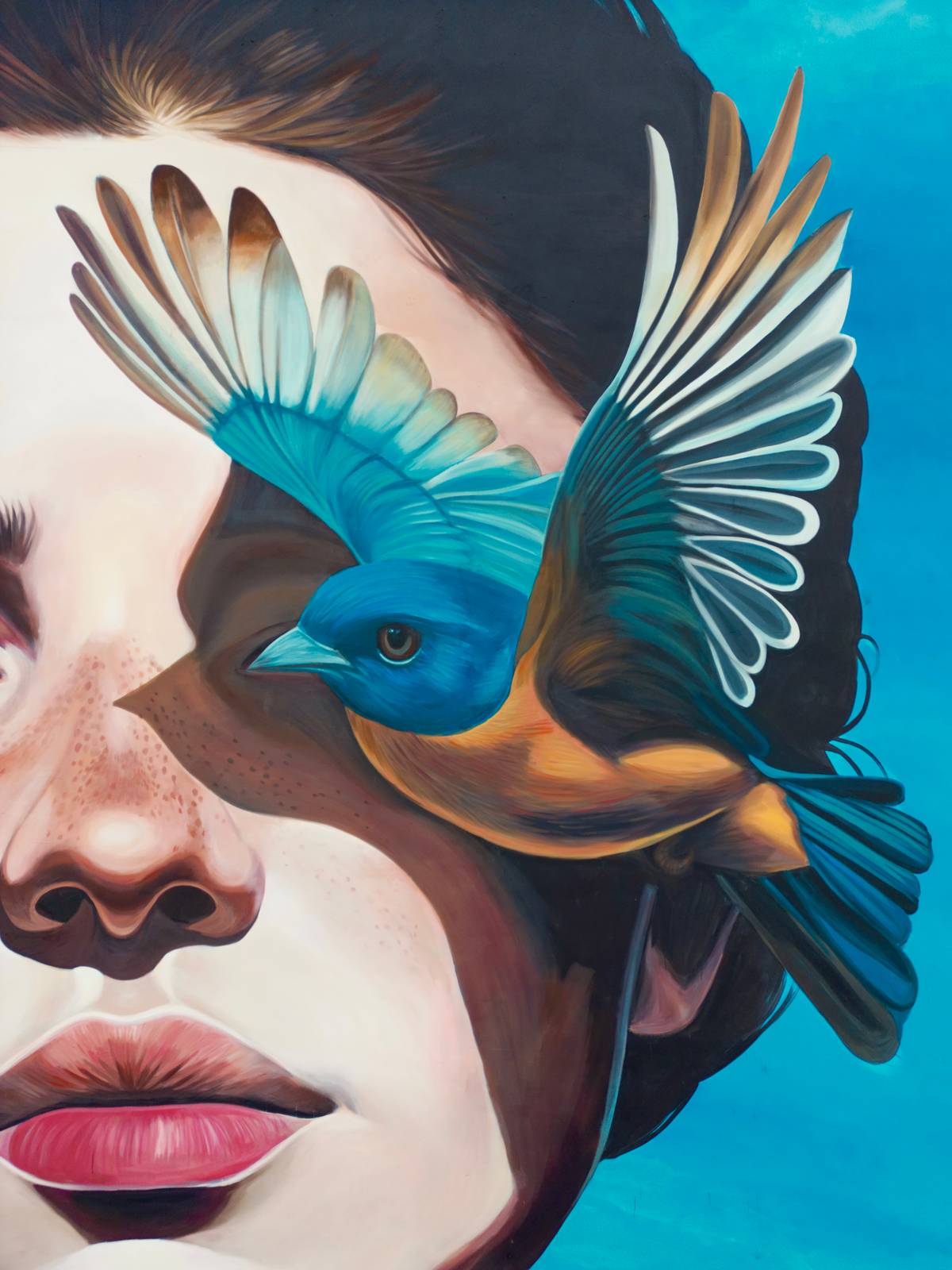 The urban art project "L’Oiseau Bleu" is a mural that serves as a visual meditation on women's mental health. Inspired by the play of the same name, it depicts a woman with a distant gaze, whose vision is partially obscured by a blue bird. This bird is a central symbol, representing the dual nature of hope and the societal pressures that can limit self-perception and emotional clarity. The dominant use of the color blue further emphasizes themes of introspection, calm, and sadness, inviting empathy and dialogue about the often-silenced struggles women face. Ultimately, this mural transforms a public wall into a statement about healing, hope, and the collective need to recognize mental well-being as a crucial social issue.