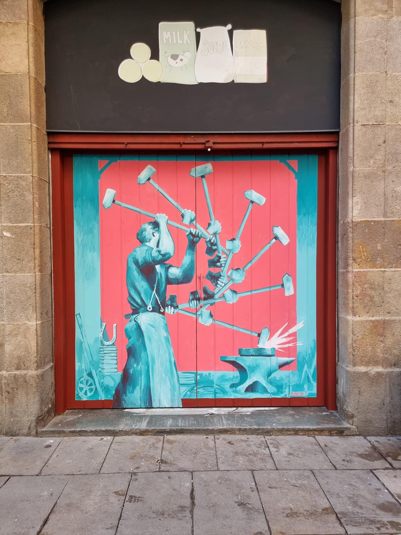 This work is part of Carrers amb Memoria, an artistic and community project that has as its guiding thread the historical memory of the neighborhood of Sant Pere, Santa Caterina and the Ribera de Ciutat Vella in Barcelona. The aim is to claim the past of this emblematic road, the ancient Roman Via Augusta, through the artistic intervention of 10 blinds that explain the history of the neighborhood either from the cultural, artistic or social side. This work recalls the artisan guilds of yesteryear.