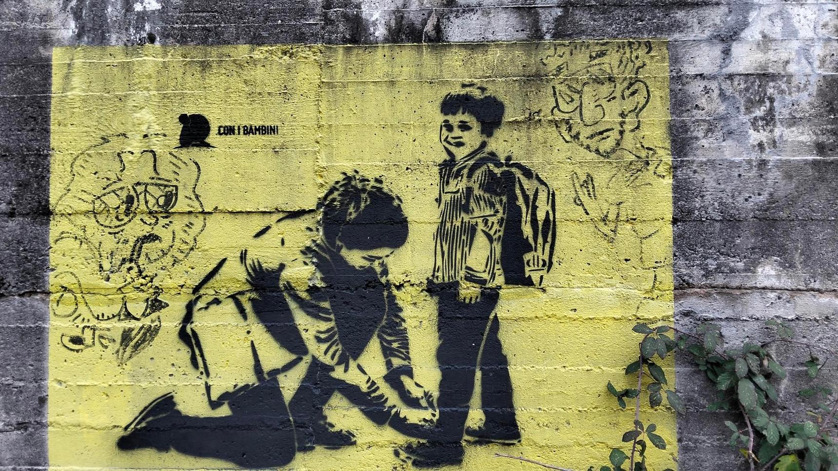 yellow and black stencil on bike path, Ciclovia Valle Brembana