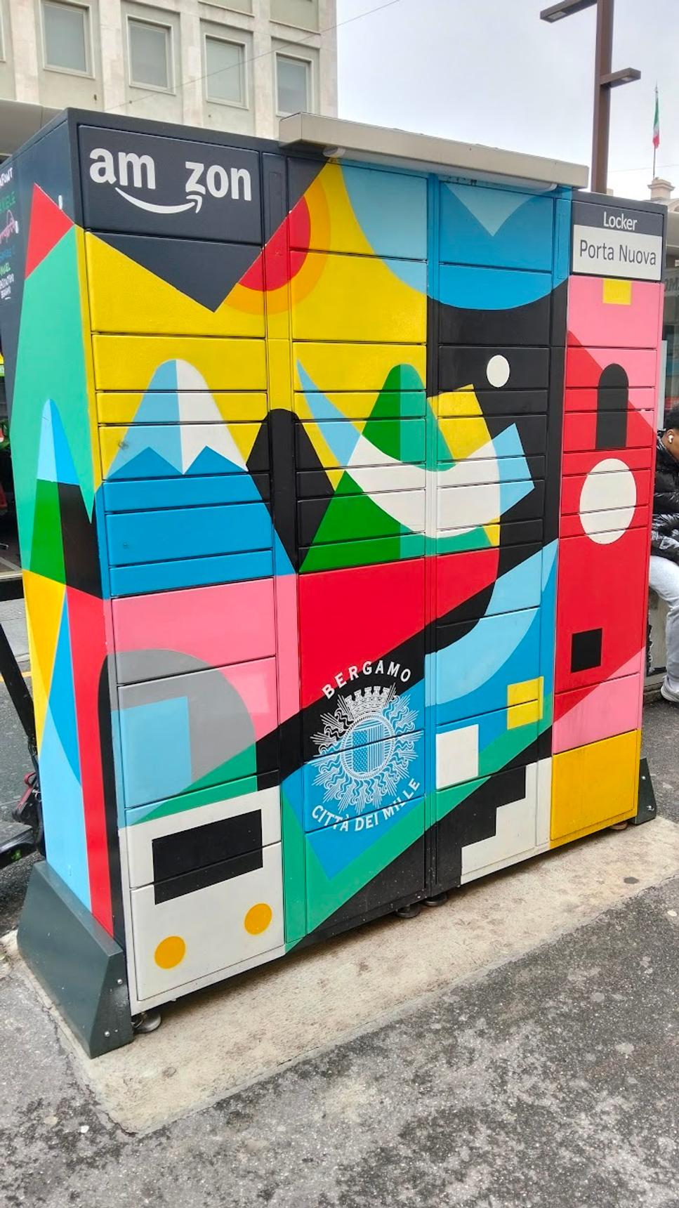 a brightly painted Amazon parcel locker painted in collaboration with four young people from the Associazione Spazio Autismo Bergamo, who shared their visions and perceptions of the city with the artist.