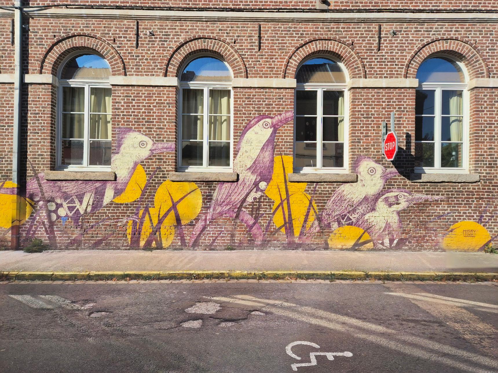 On the wall of the Jacques Prévert Primary School, she presents a series of birds nesting among herbaceous vegetation.