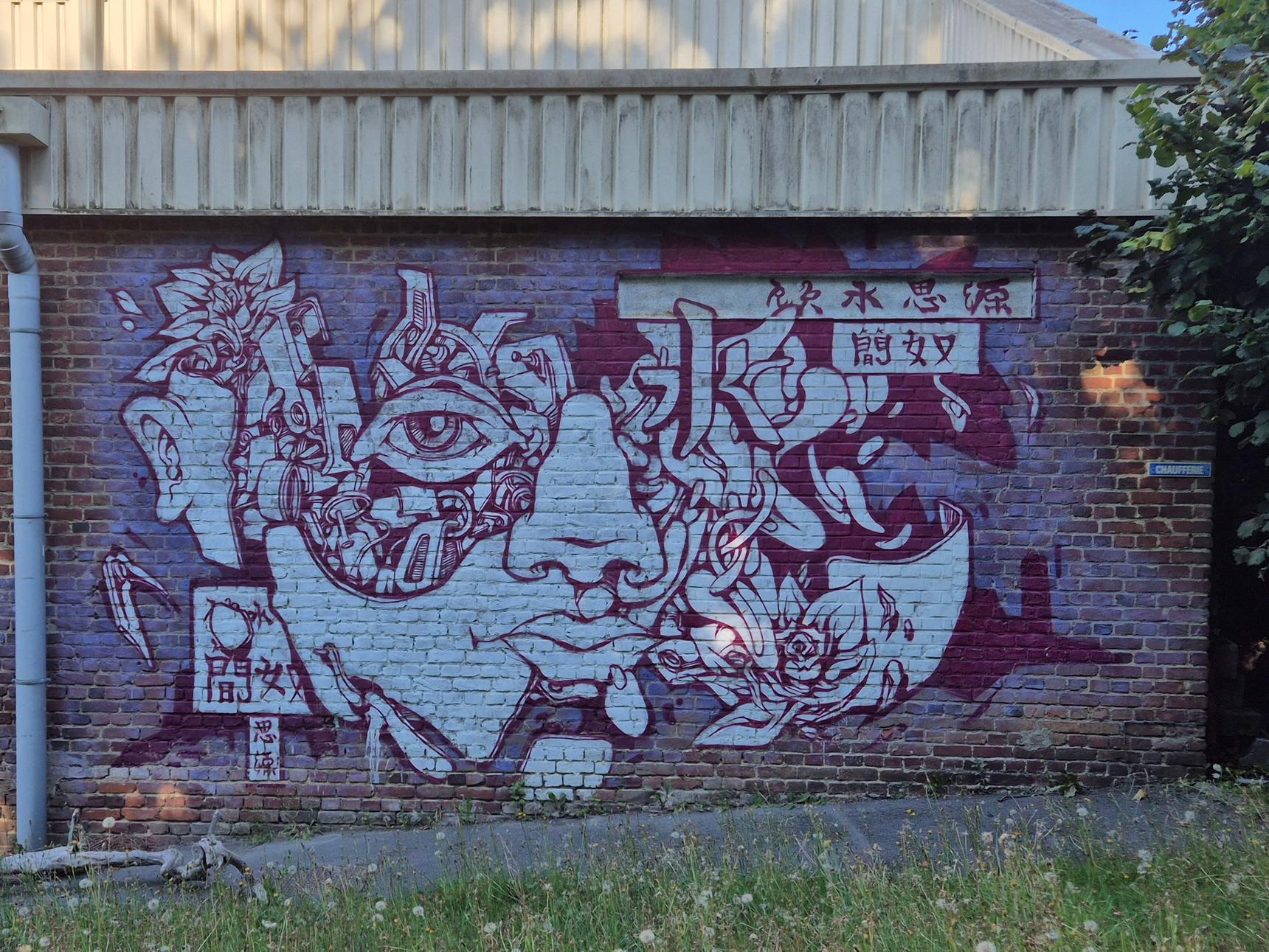 Here, Kanos presents you a very distinctive and original face from his Transhumanism series. The skull and cheeks are missing. Instead, you see a set of metallic elements. A bit before this piece you can see a piece with the word "Palace" (photo 2).