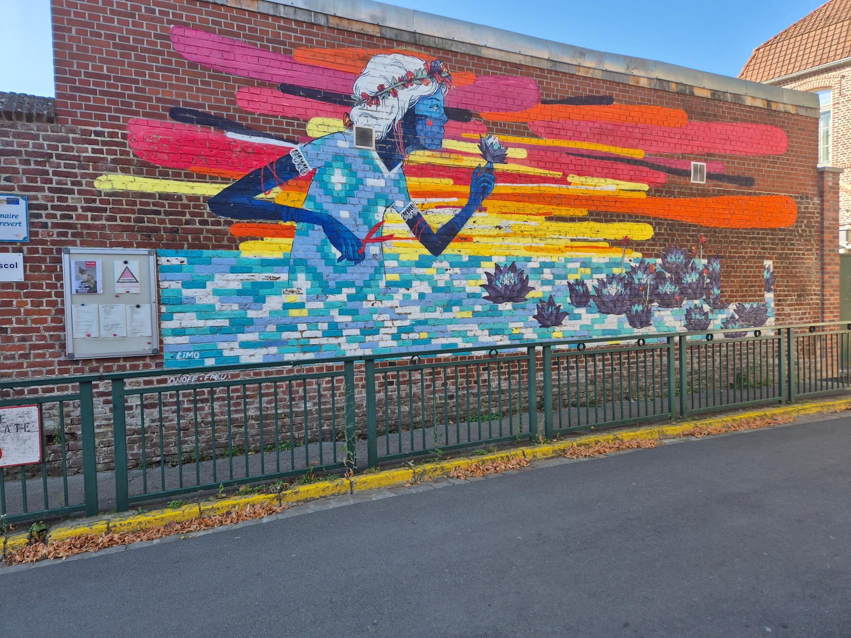 Le mur a été peint par l’artiste Limo, et représente une femme qui a le corps dans l’eau jusqu’à la taille et qui est en train de couper des nénuphars. Elle se trouve sur le mur d’enceinte d’une école.