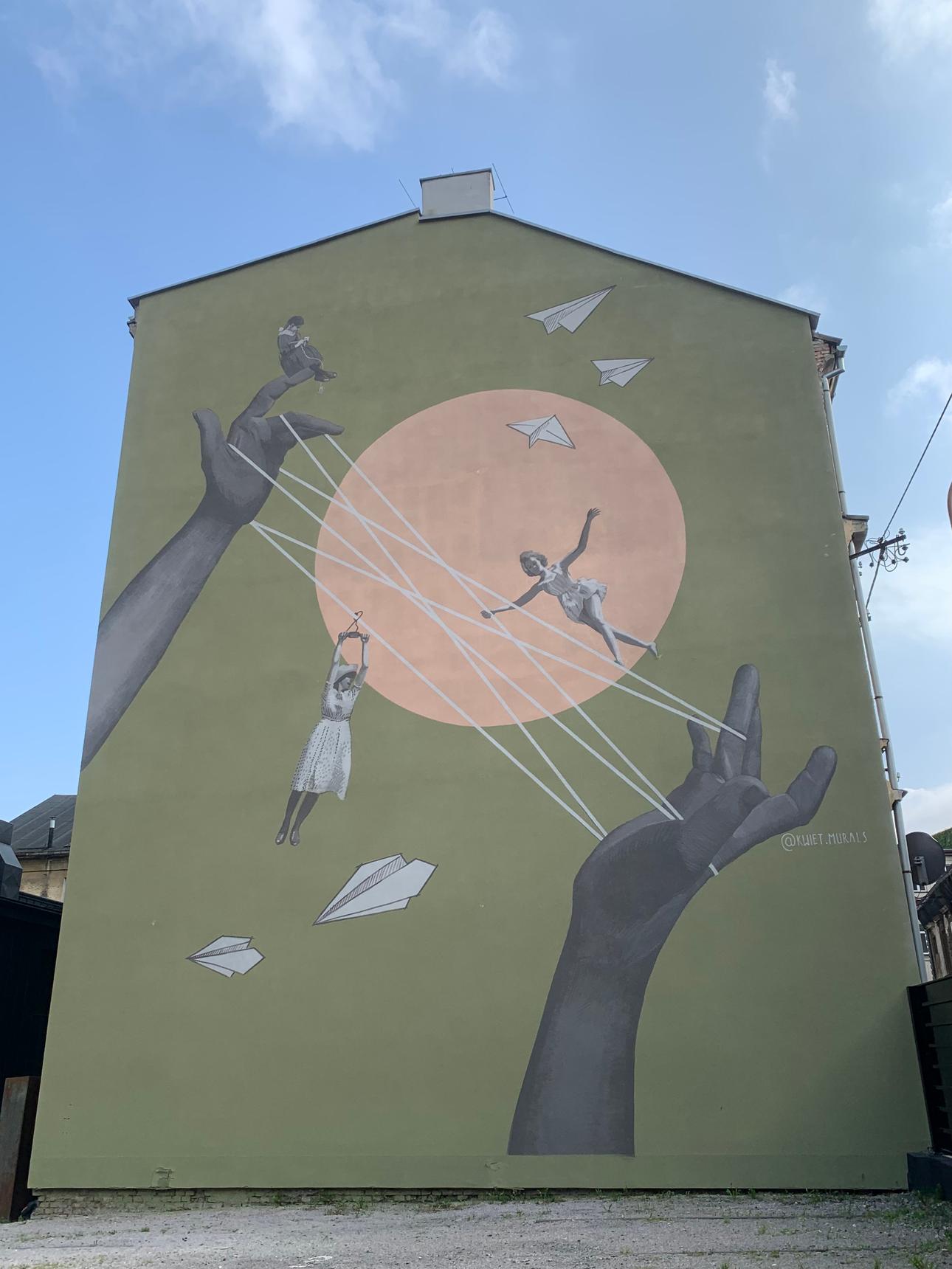 “Cat’s Cradle” is a mural that symbolically restores and highlights the vital role of women in Bielsko-Biała’s history. The artist drew inspiration from the children's game of intertwining strings, using it as a metaphor for cooperation, mutual support, and intertwined destinies. The mural features women who played crucial roles in the city’s industrial development, yet have often been overlooked in official histories. Through this work, Paulina Kwietniewska not only honors their hard work but also captures the spirit of fun, joy, and spontaneity that marked their lives.