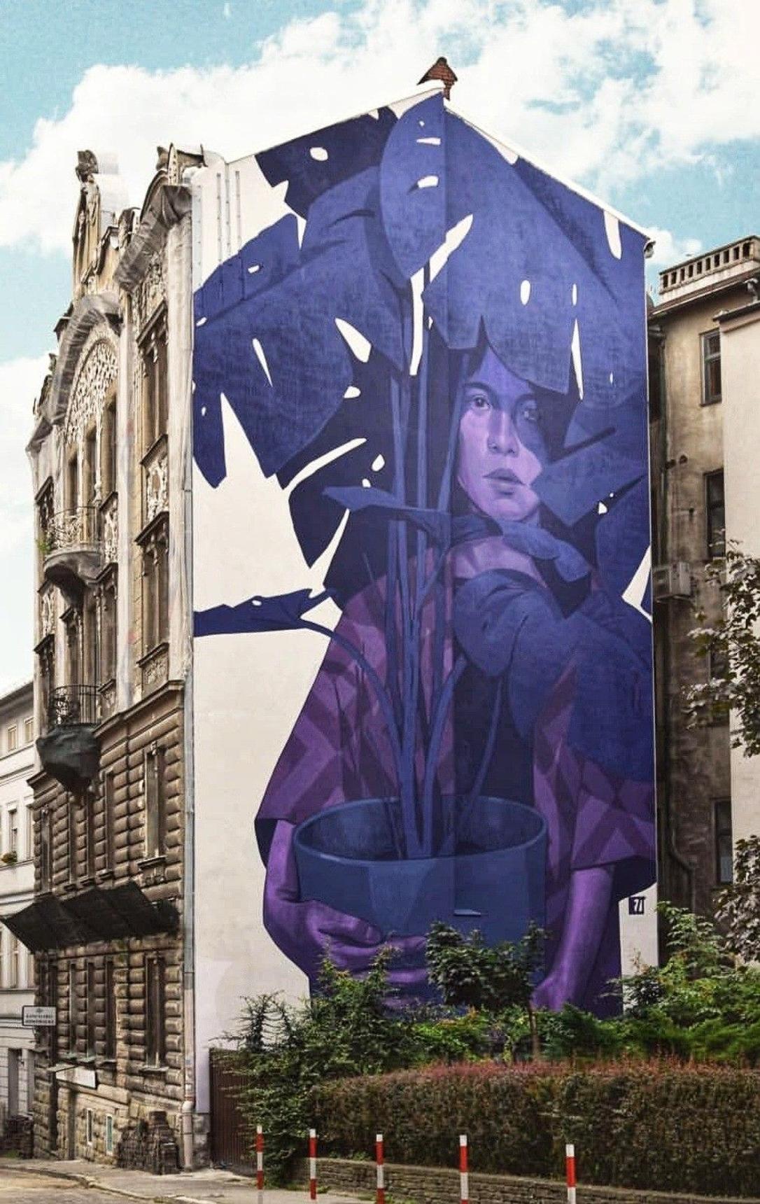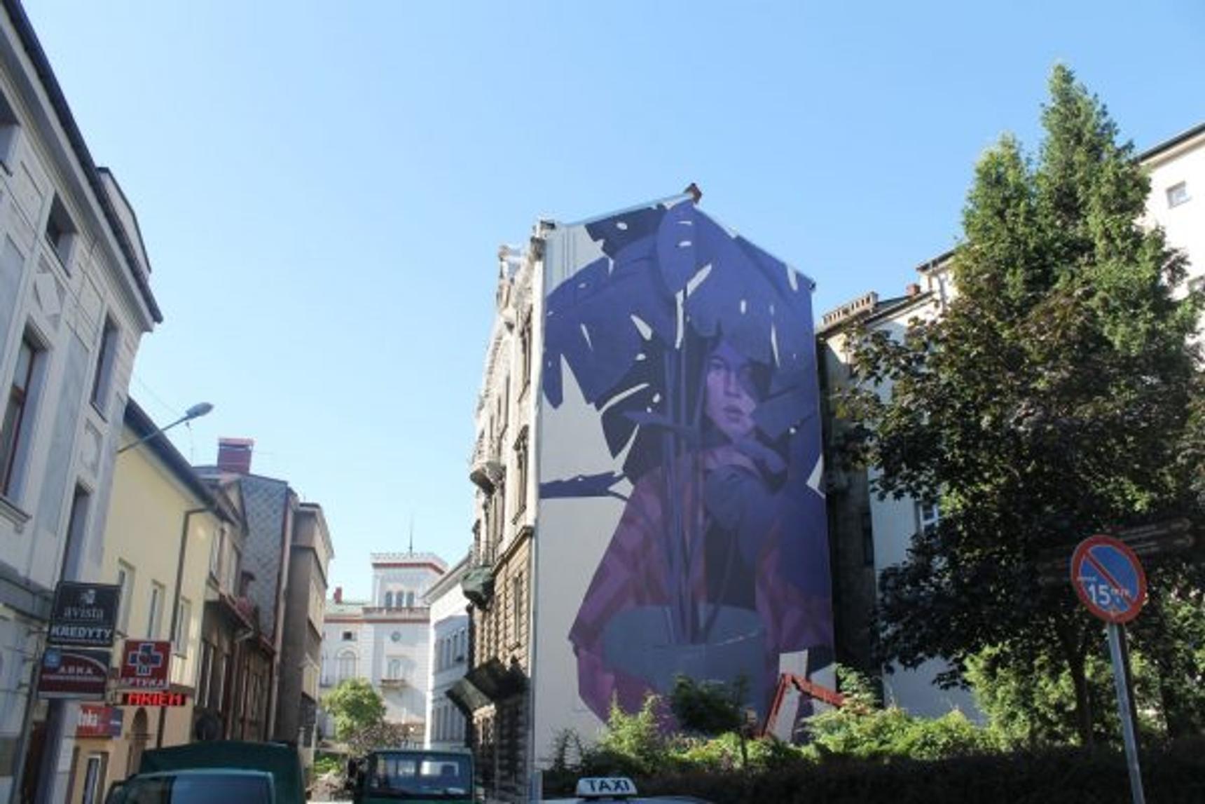 A young modern woman holding a pot with an enormous plant, a monstera, is depicted in a mural by Mateusz Gapski. Working under the pseudonym Bezt, Gapski is a member of the world-renowned street art collective Etam Cru. The artist was inspired by motifs—floral ornaments and a worried-looking woman’s mask—on the 1905 Art Nouveau townhouse on the side of which he created his work. The mural was created in 2017 as part of the “oBBraz miasta #4” project in collaboration with Fundacja Galerii Bielskiej (Bielsko Gallery Foundation) and Galeria Bielska BWA, co-funded by the Bielsko-Biała Municipality. Leroy Merlin Polska Sp. z o.o. is the main partner and sponsor.