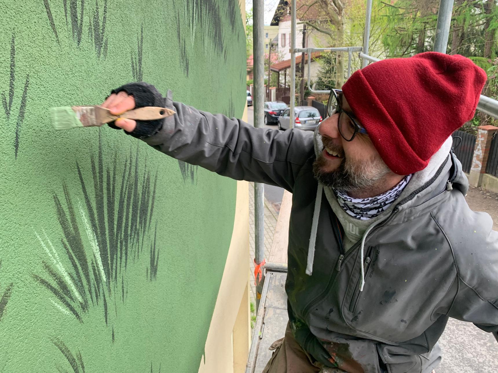 This mural is Malicki's second large-scale piece on this wall. His earlier mural, “Worry,” depicted an elderly man expressing concern over the disappearing sparrow population in urban areas, but it was lost during a sudden facade renovation in 2019. “Leshy” continues Malicki's recurring theme of nature conservation, a central focus in his art.