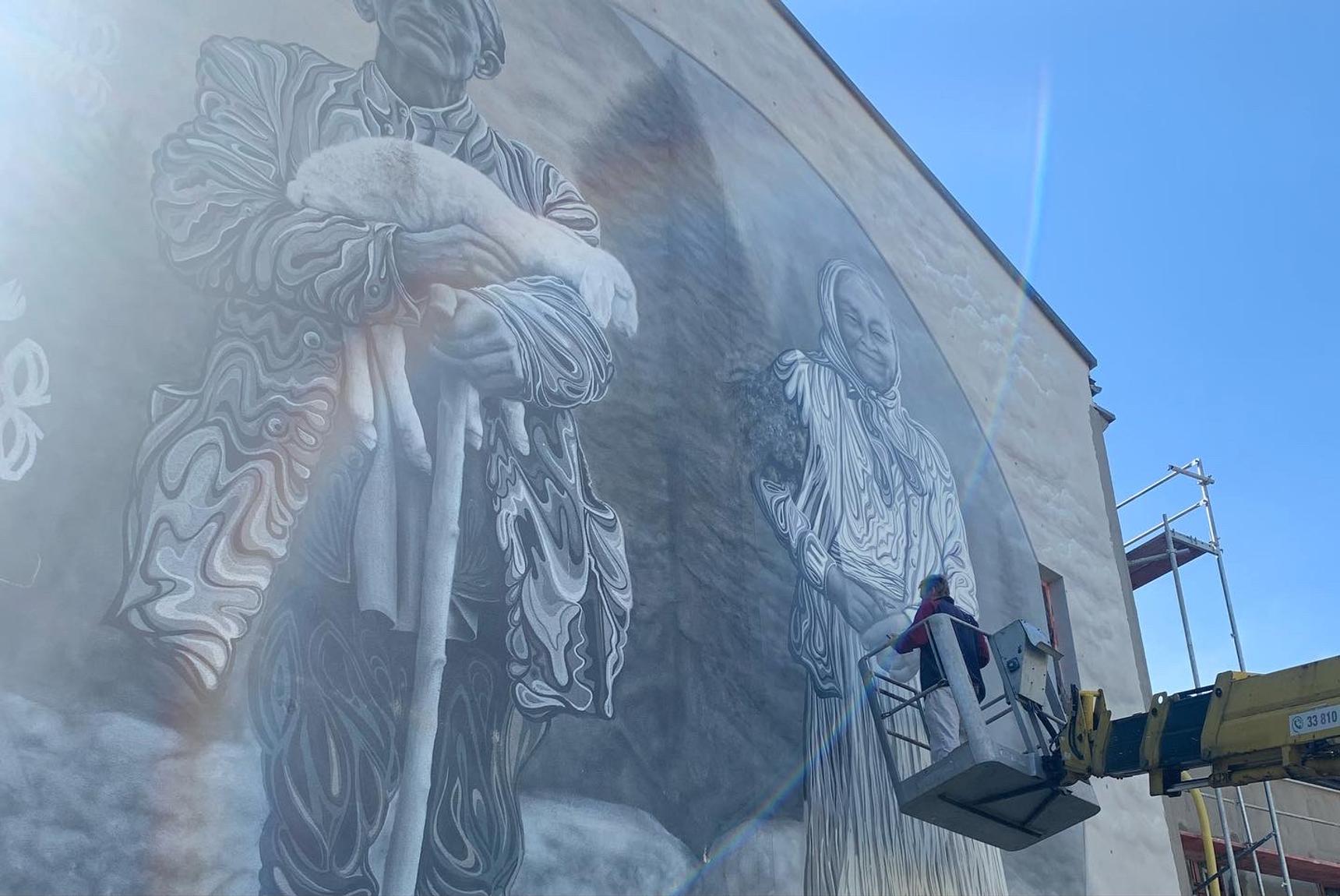 The mural “Duality” was created by the artistic duo Projekt Etnograff — Katarzyna “Katka” Dyga-Szymonowicz and Maciej “Kamer” Szymonowicz. Originally painted in 2014 as “Shepherd,” the mural was inspired by a photograph by Arkadiusz Dziczek taken in the Himalayas, depicting a shepherd holding a newborn lamb too weak to keep up with the flock.