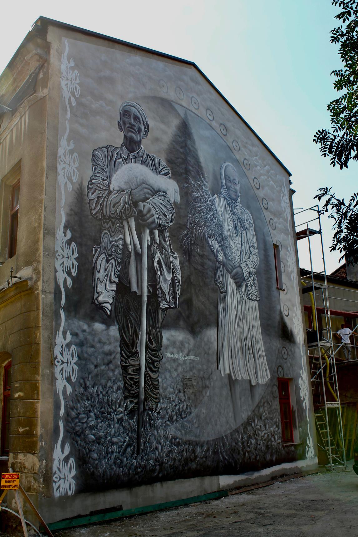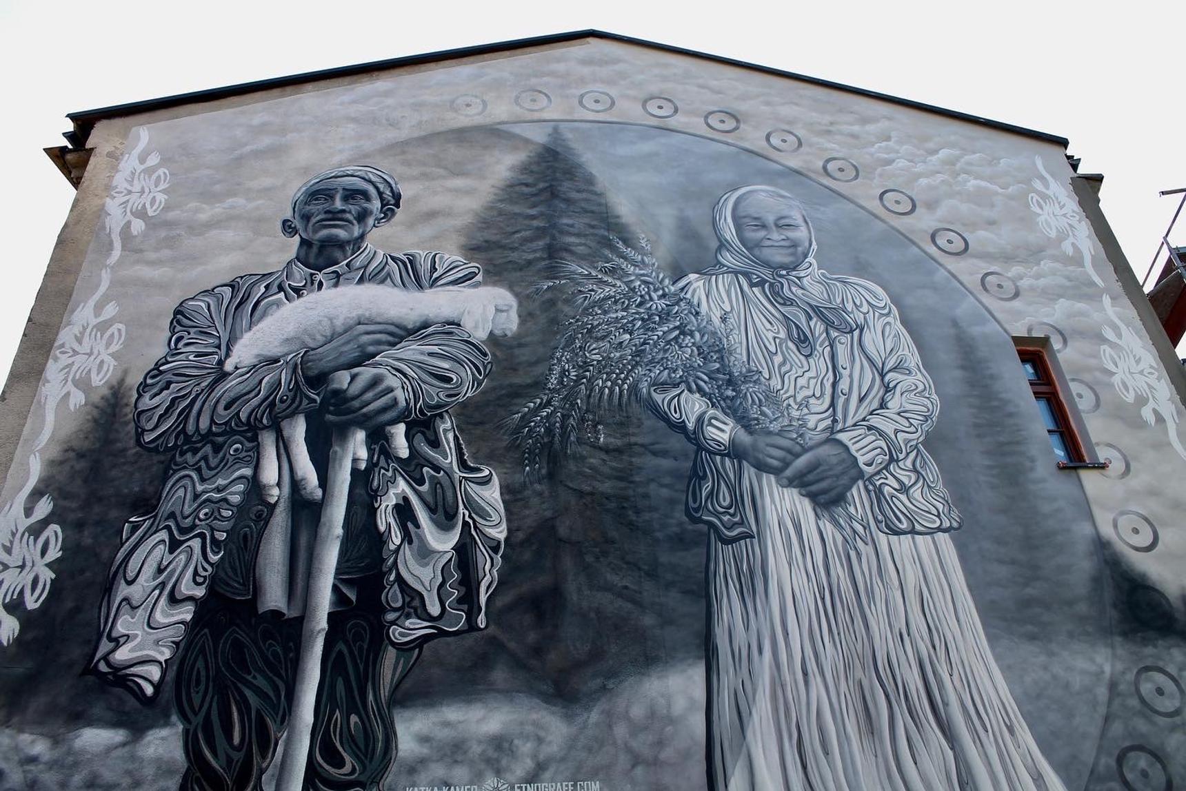 Projekt Etnograff is known for its deep connection to Beskid folklore and has been blending folk culture with modern graffiti and street art for years. As part of the Beskid Murals Trail, an initiative they launched in 2019, the duo has created numerous murals across Beskid villages, each reflecting local characters, symbols, and legends.