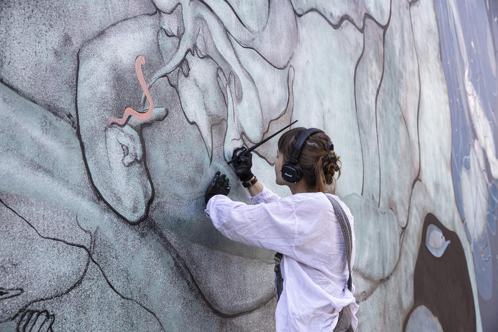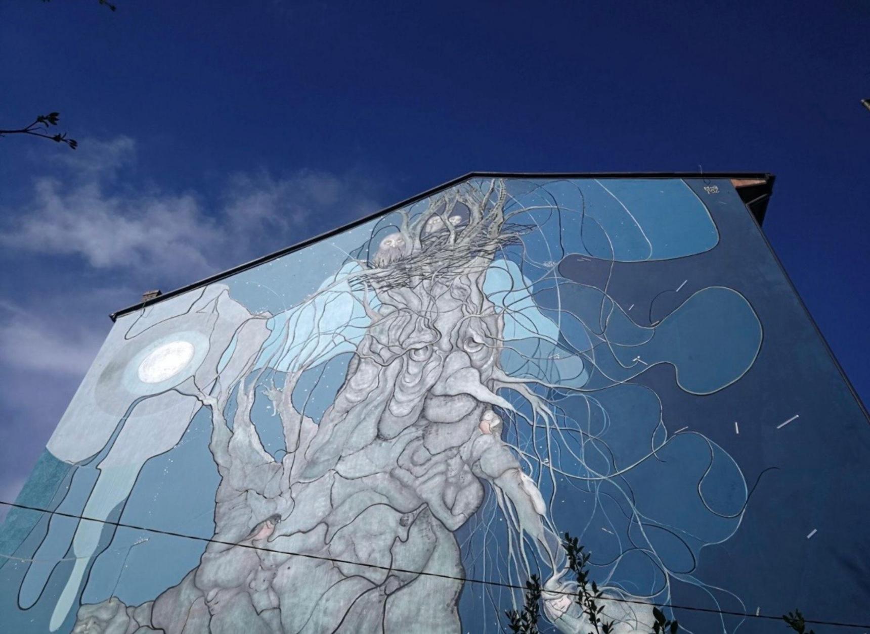 Mona Tusz, an artist and activist from Silesia, has been creating urban art since 2007, with much of her work focused on the plants, trees, and herbs of the region and their cultural and ecological significance. Her murals, including “Willows,” are part of a larger series that explores these themes. In addition to her murals, Mona Tusz conducts art workshops that engage youth and socially excluded groups, creating esoteric worlds full of organic textures and cosmic patterns.