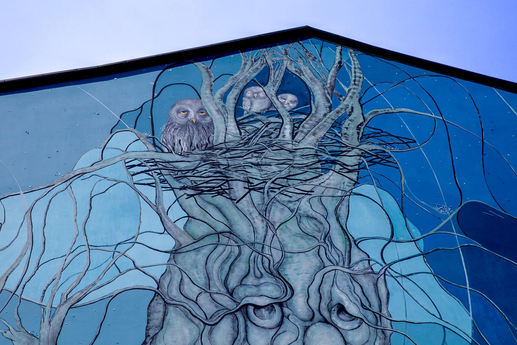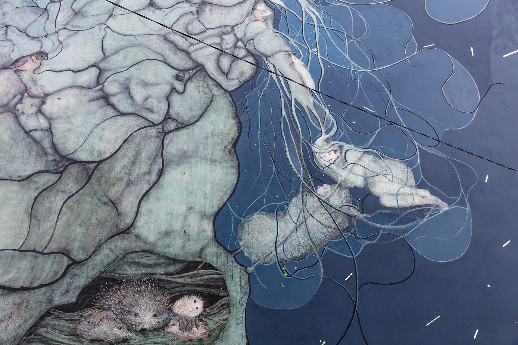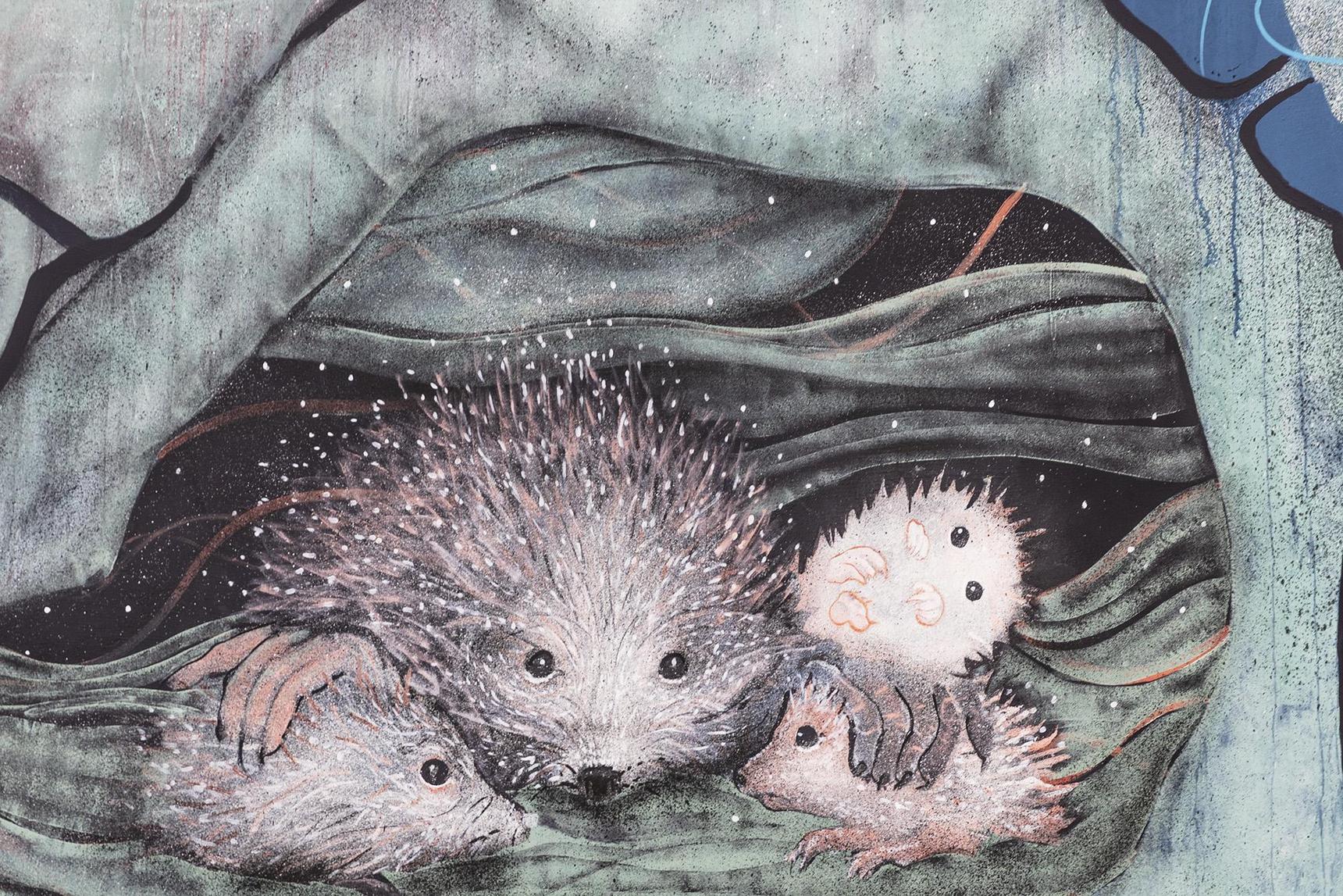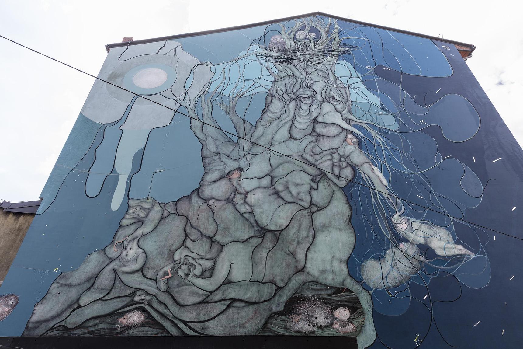 The “Willows” mural by Mona Tusz features a mythical, anthropomorphized willow tree that serves as a sanctuary for forest animals and spirits. The tree’s branches shelter owls, bullfinches, hedgehogs, voles, and Silesian forest spirits — protective creatures shaped like roots that, according to legend, ward off evil charms. The artwork invites viewers to explore and discover these hidden creatures within a rich, nocturnal landscape. Small mirrors embedded in the wall reflect moonlight, adding a magical element that enhances the mural’s symbolism.